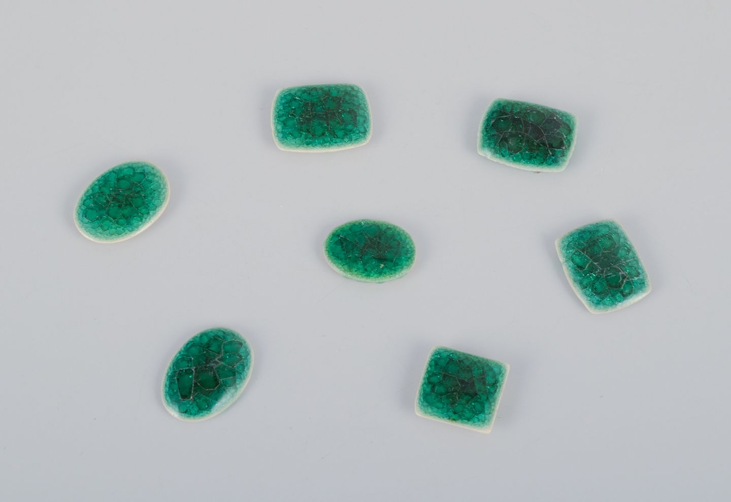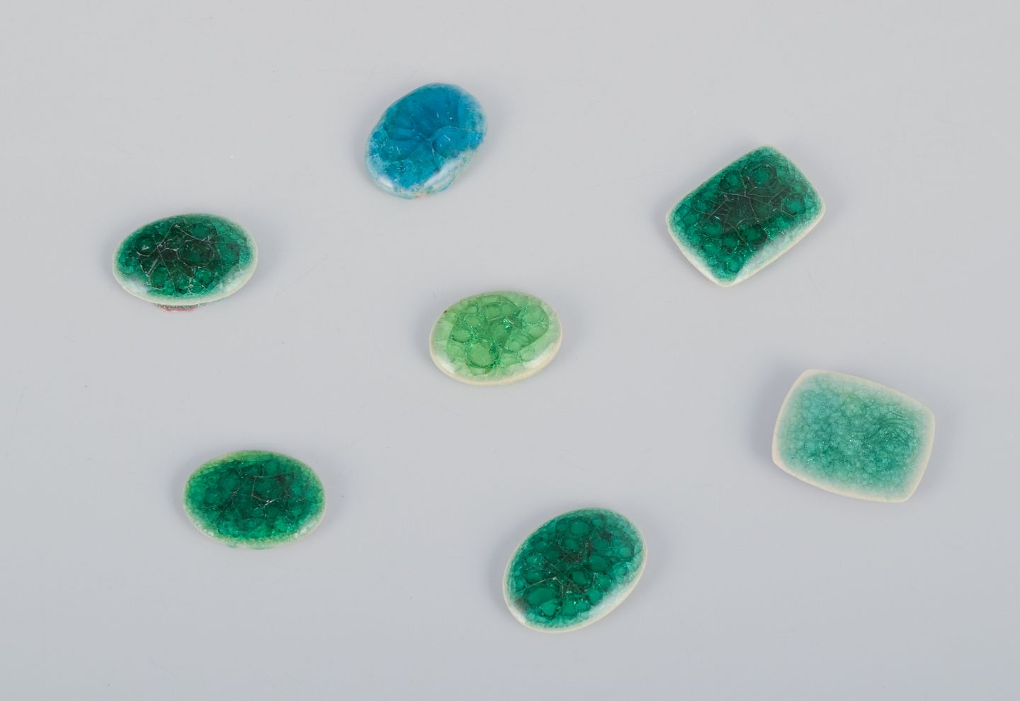 28 unika brocher i glaseret stentøj i grønne nuancer.
