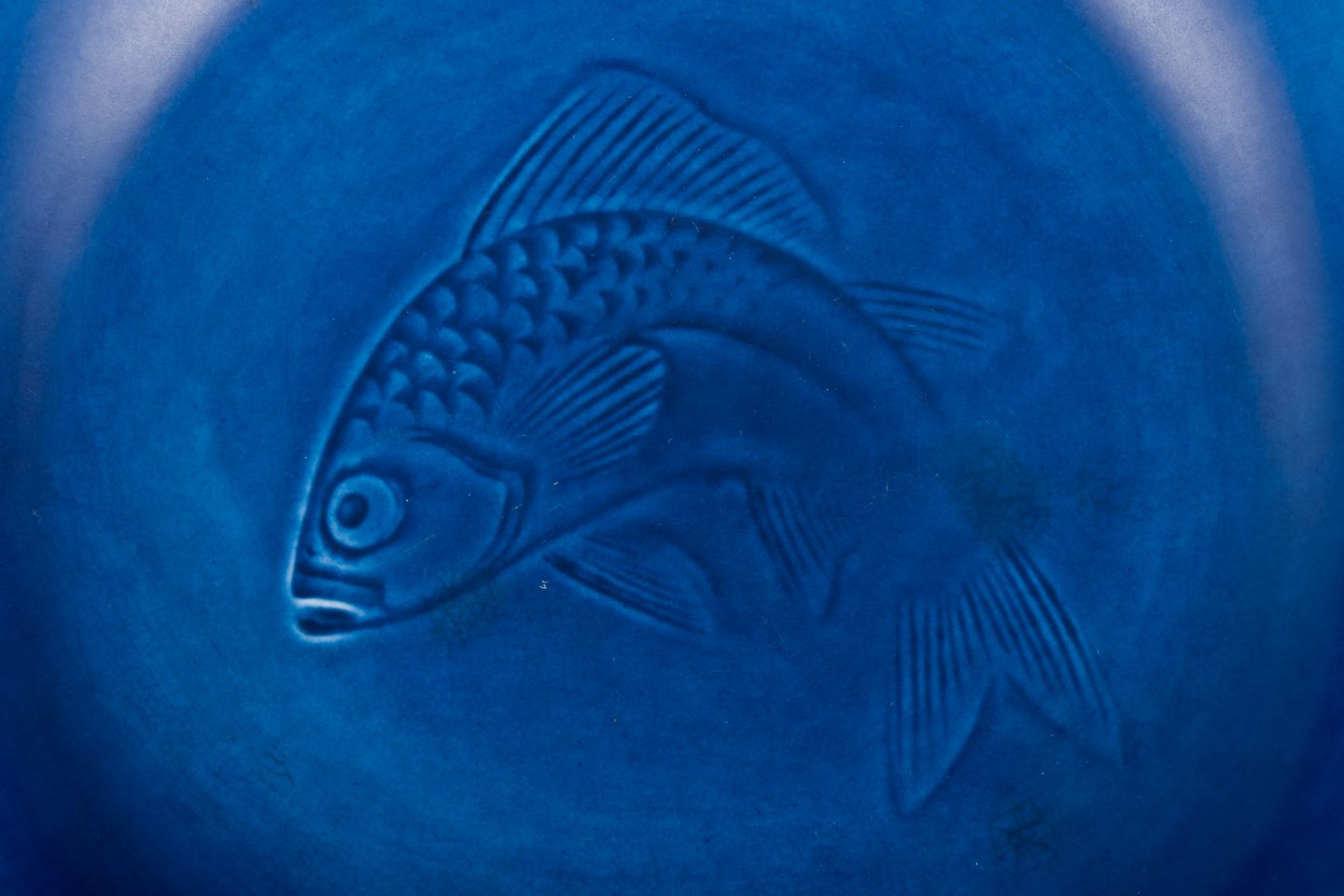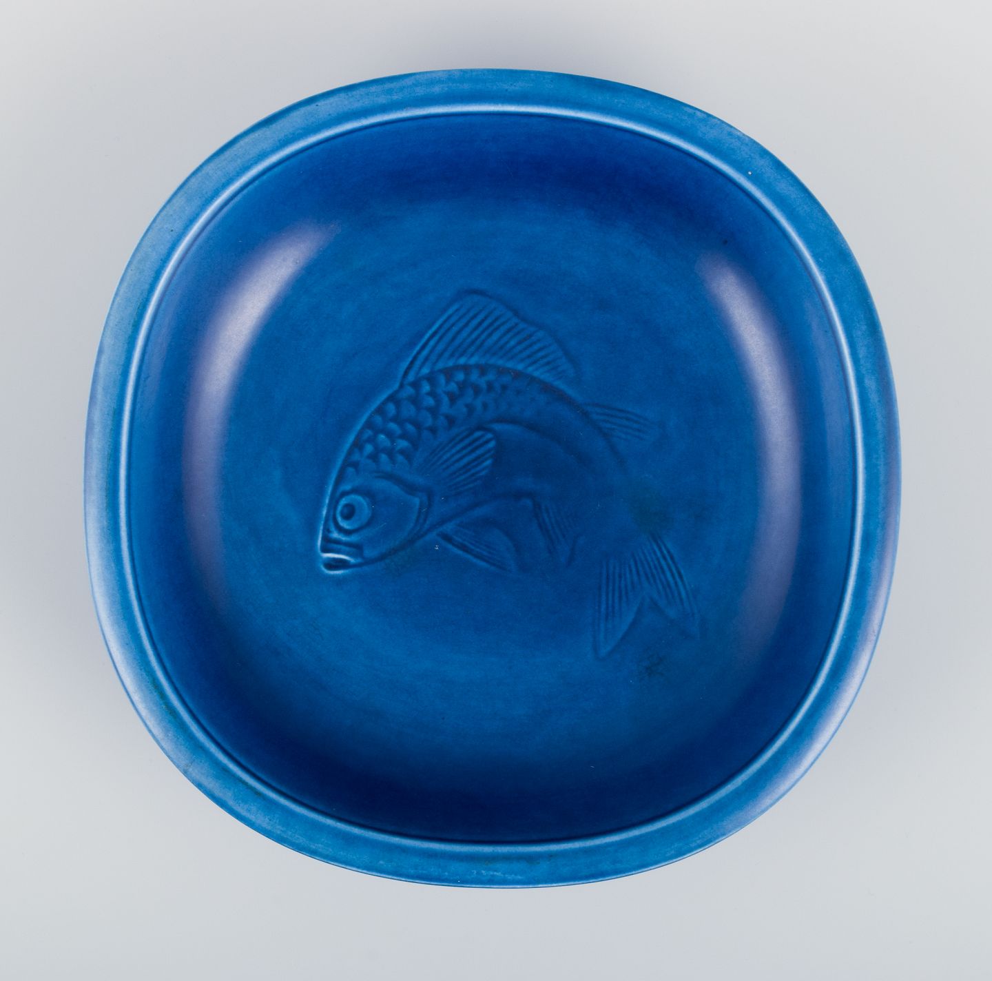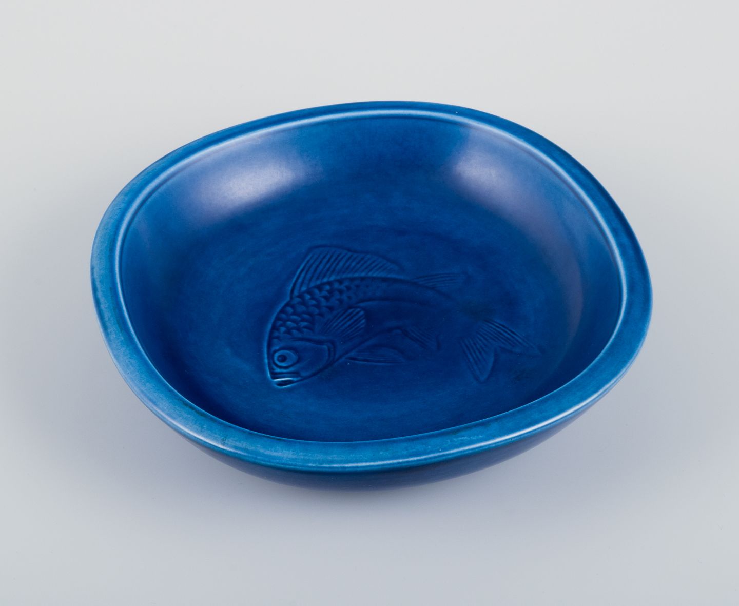 Nils Thorsson for Aluminia. Skål i fajance med blåmalet glasur. Motiv af fisk. Midt 1900-tallet. Modelnummer 2650. Stemplet Perfekt stand. Første sortering. Mål: D 19,0 cm. x H 4,5 cm.