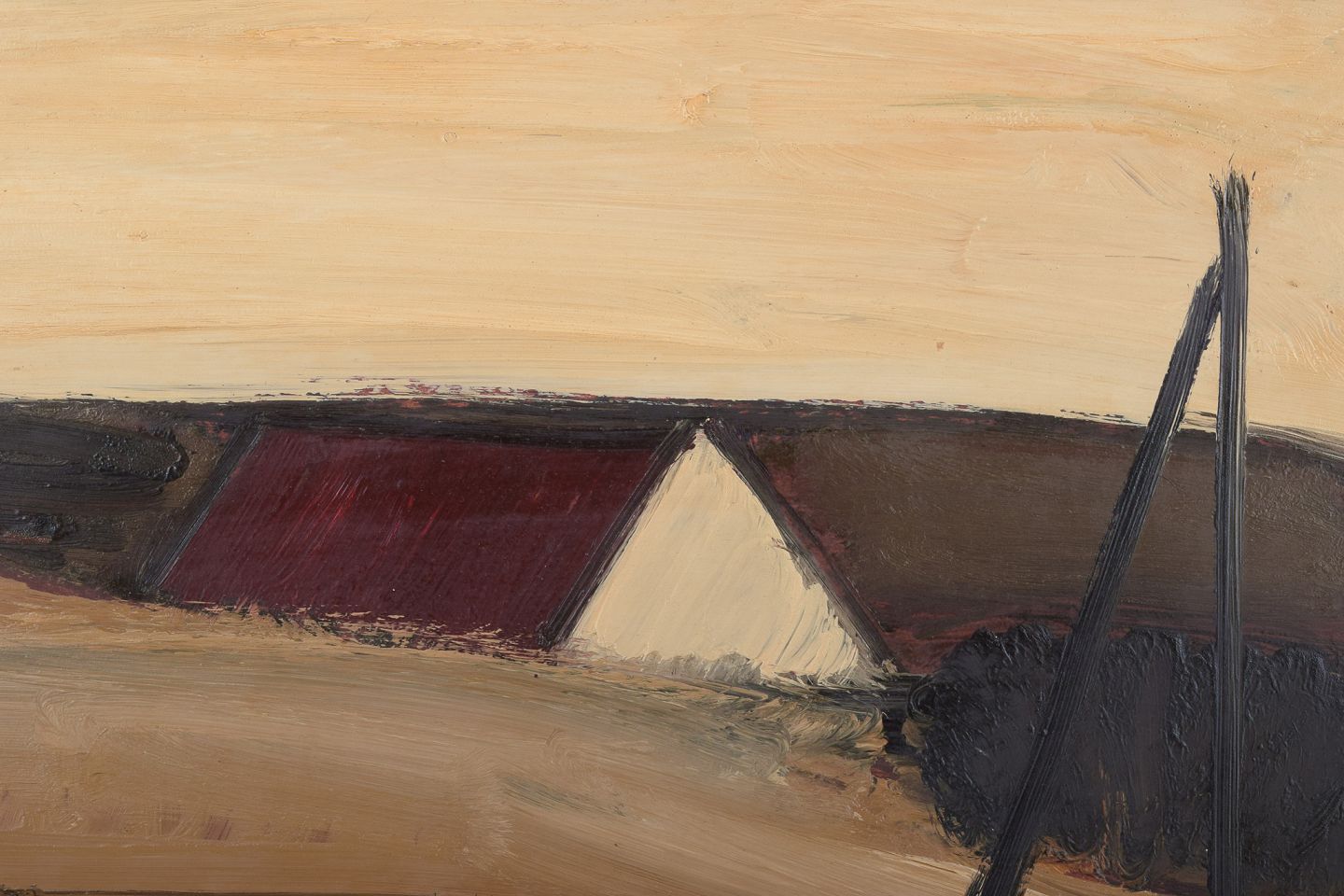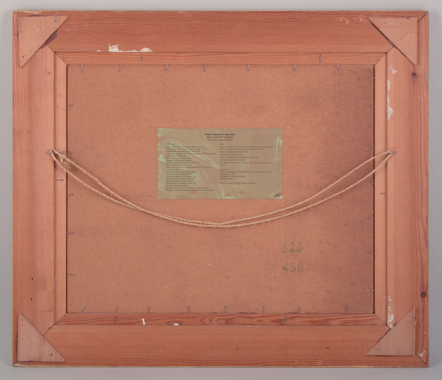 Peder Brøndum Sørensen (1931-2003), dansk maler, olie på lærred. Modernistisk landskab med hus og marker. 1970’erne Signeret. I perfekt stand. Mål: 51,0 cm. x 41,0 cm. Total: 69,5 cm. x 59,5 cm.
