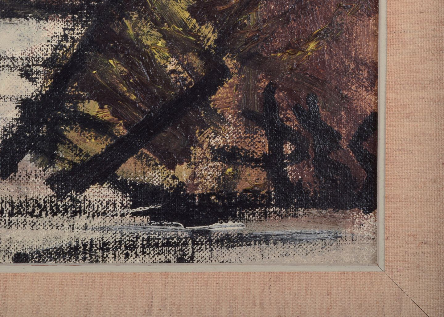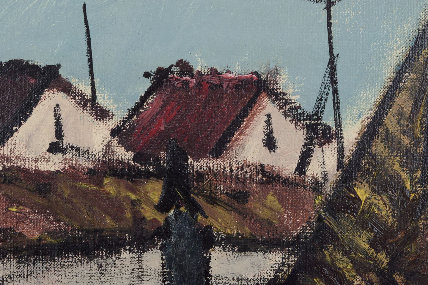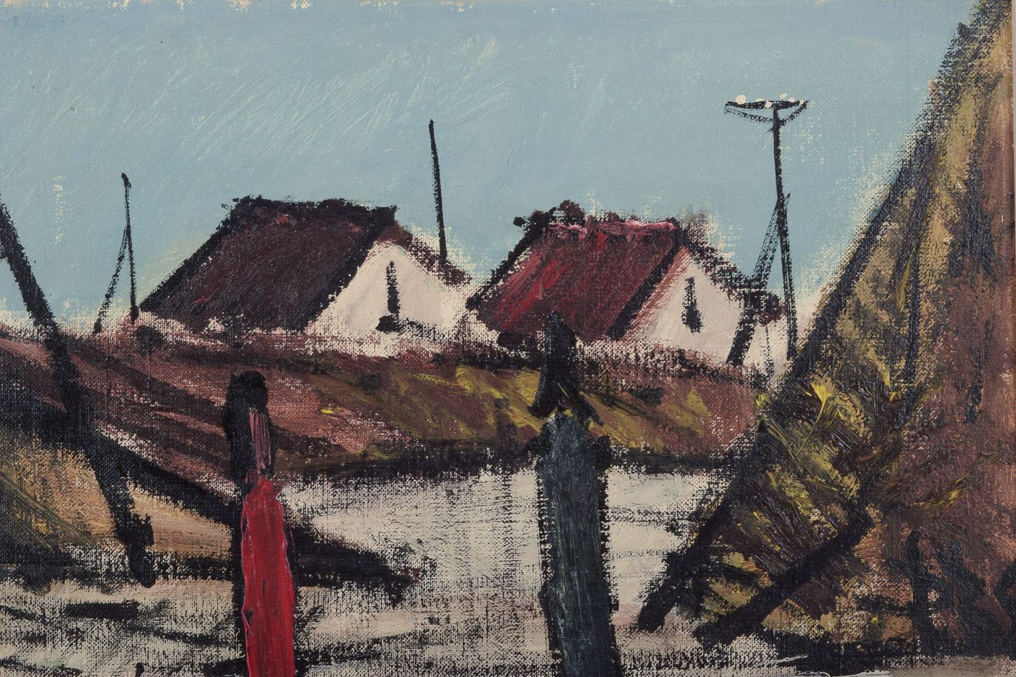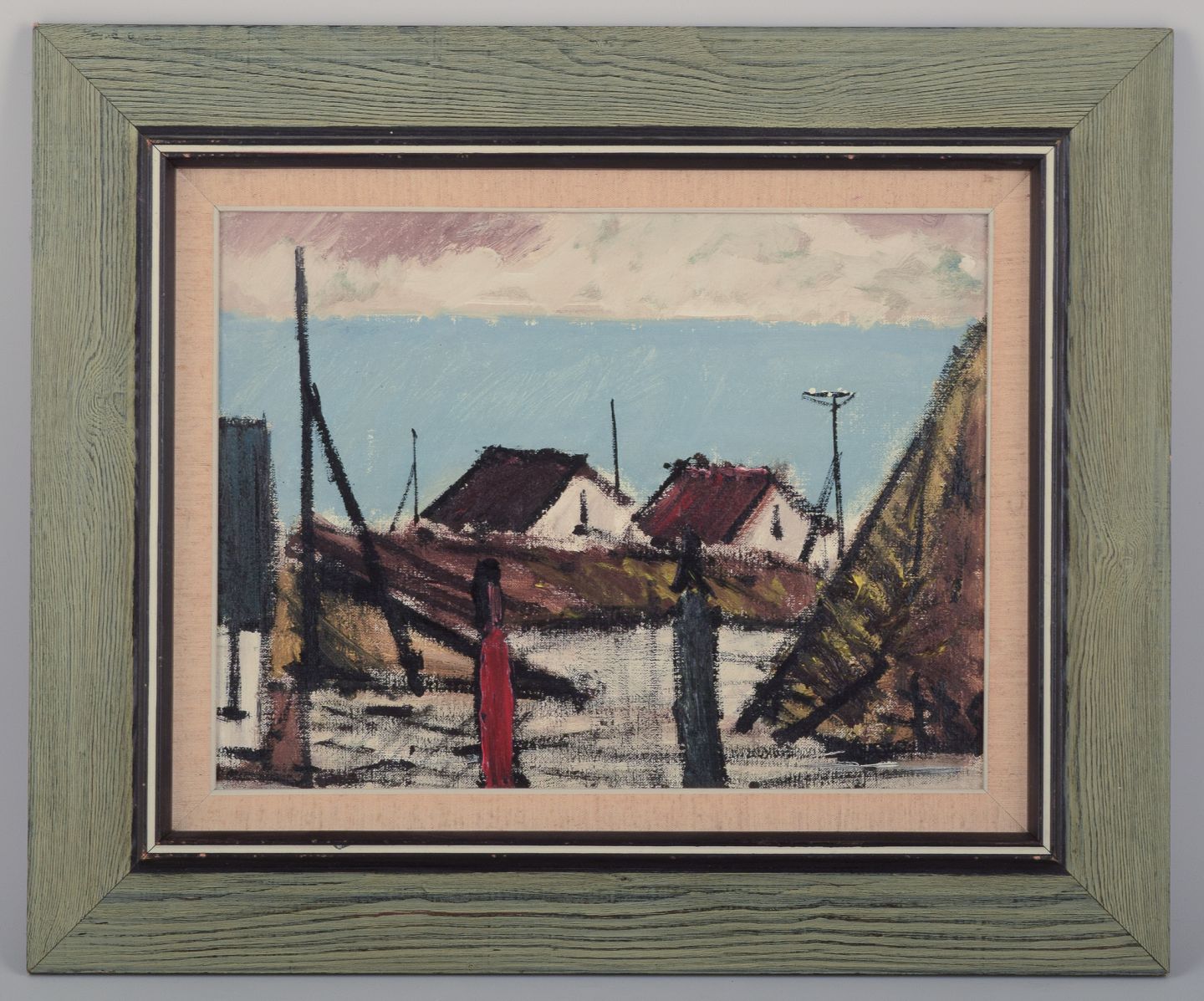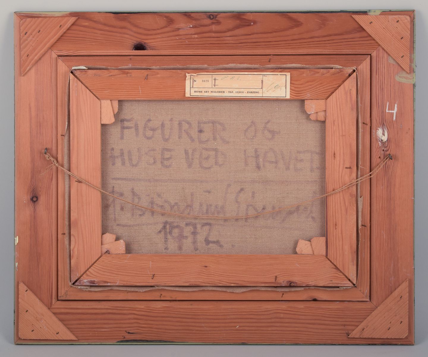 Peder Brøndum Sørensen (1931-2003) dansk maler, olie på lærred. ”Figurer og huse ved havet”. Modernistisk motiv. 1972 Signeret. I perfekt stand. Mål: 41 cm. x 31 cm. Total: 59 cm. x 49 cm.