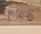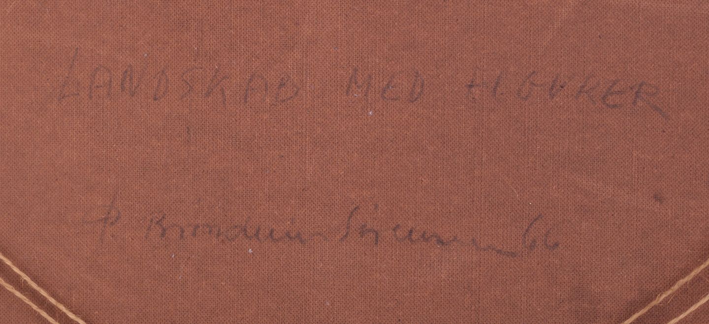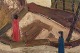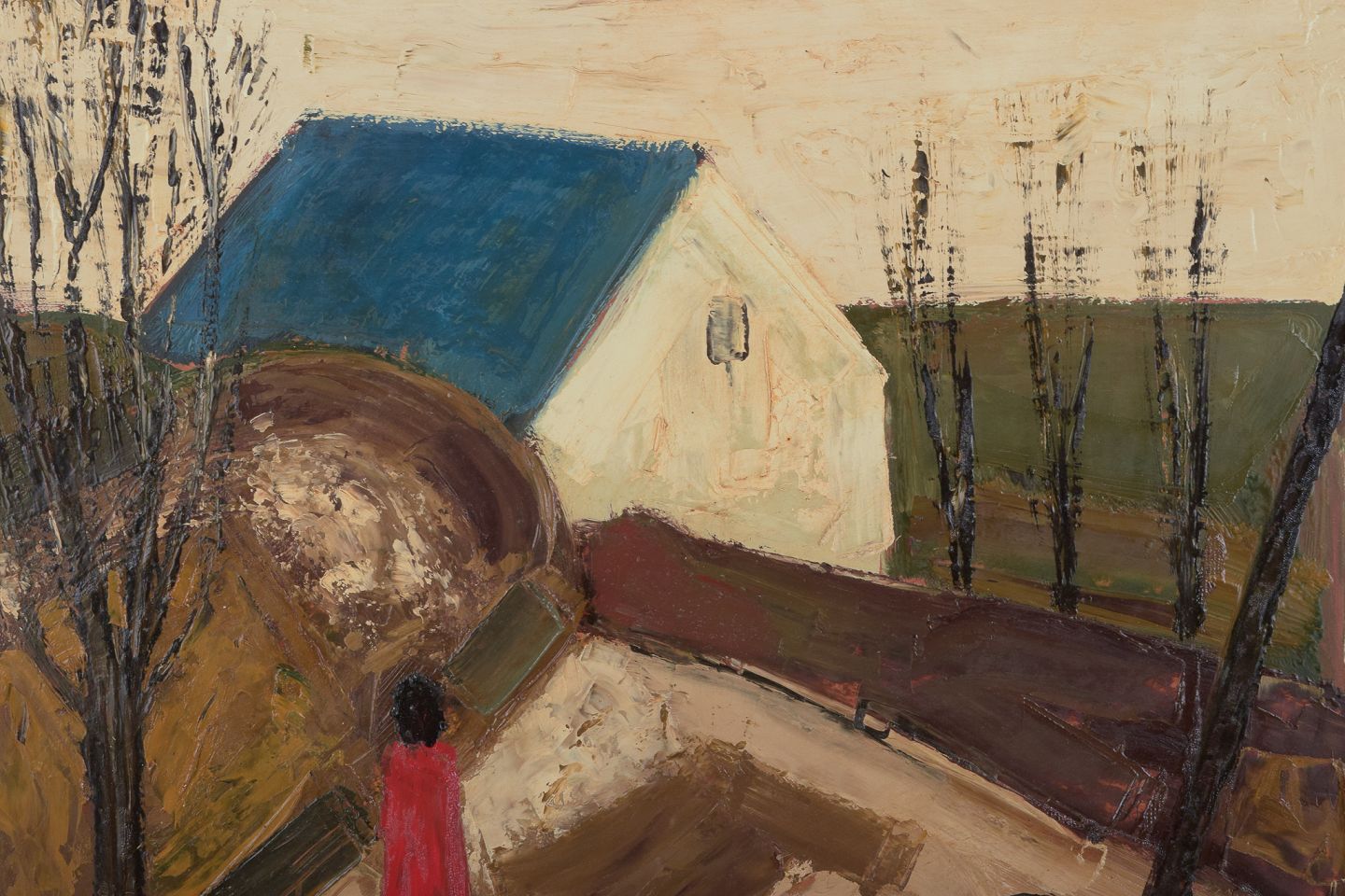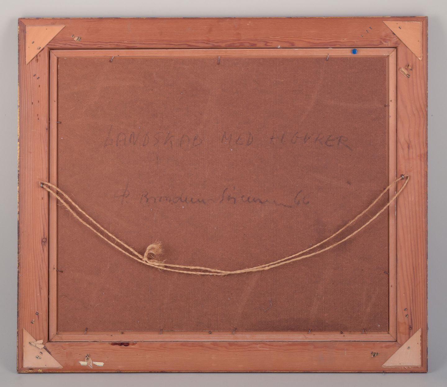 Peder Brøndum Sørensen (1931-2003), dansk maler, olie på plade. Modernistisk landskab med figurer og huse. 1960/70erne. I perfekt stand. Signeret PBS. Mål: 60 cm. x 50 cm. Total: 74,5 cm. x 64,5 cm.