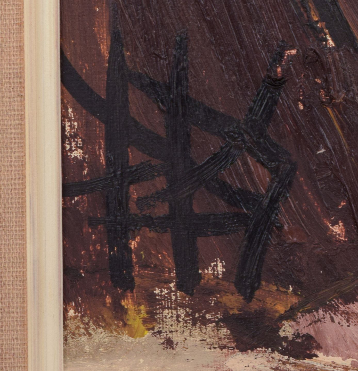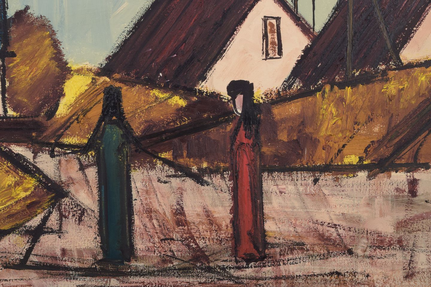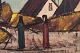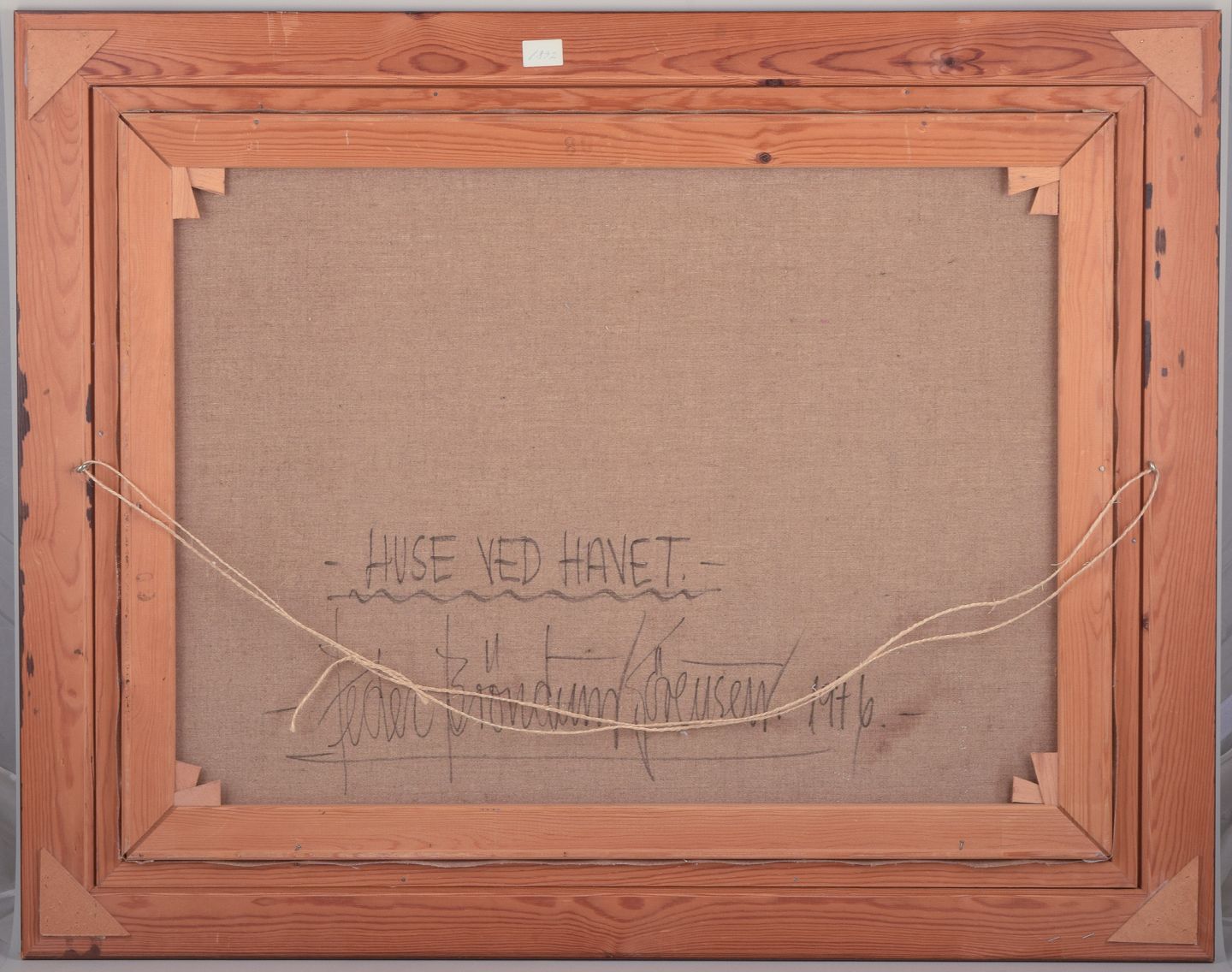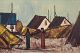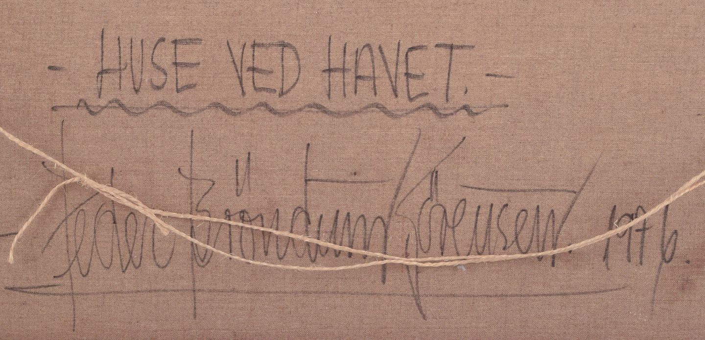 Peder Brøndum Sørensen (1931-2003), dansk maler, olie på lærred. ”Huse ved havet”. 1976. Signeret. I perfekt stand. Mål: 60,0 cm. x 80,0 cm. Total: 97,5 cm. x 77,0 cm.