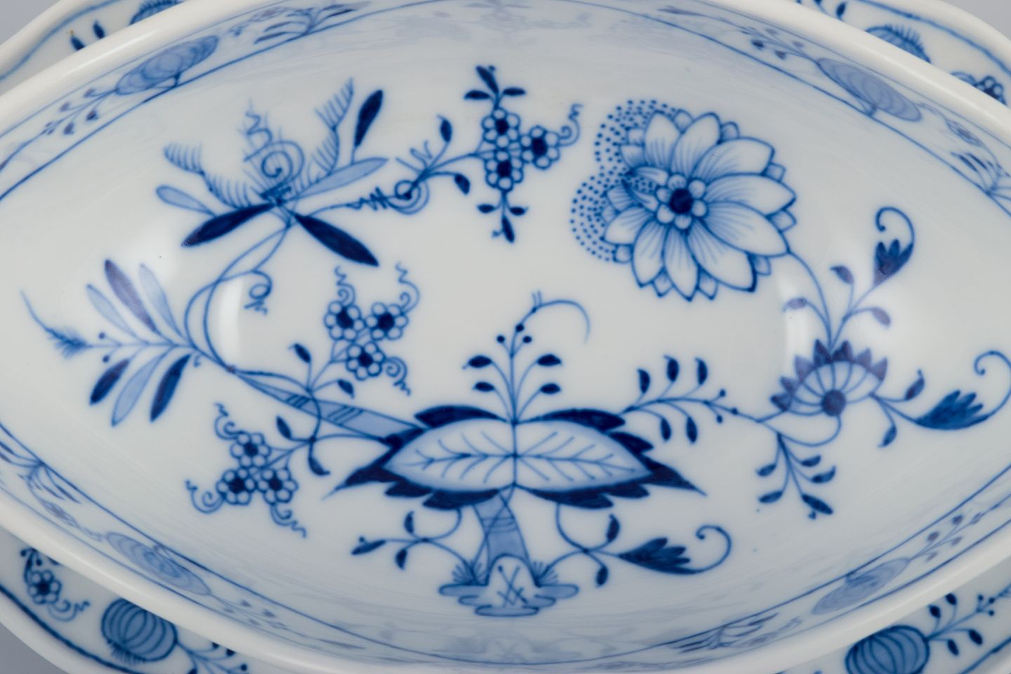Meissen, stor løgmønstret saucekande på fod. Hånddekoreret med blå blomster. Midt 1900-tallet. Stemplet. Perfekt stand. Tredje sortering. Mål: L 26,0 cm. x H 11,0 cm.