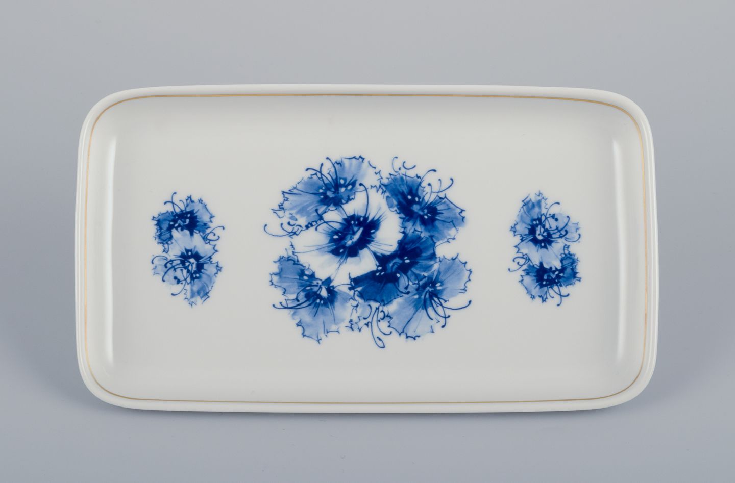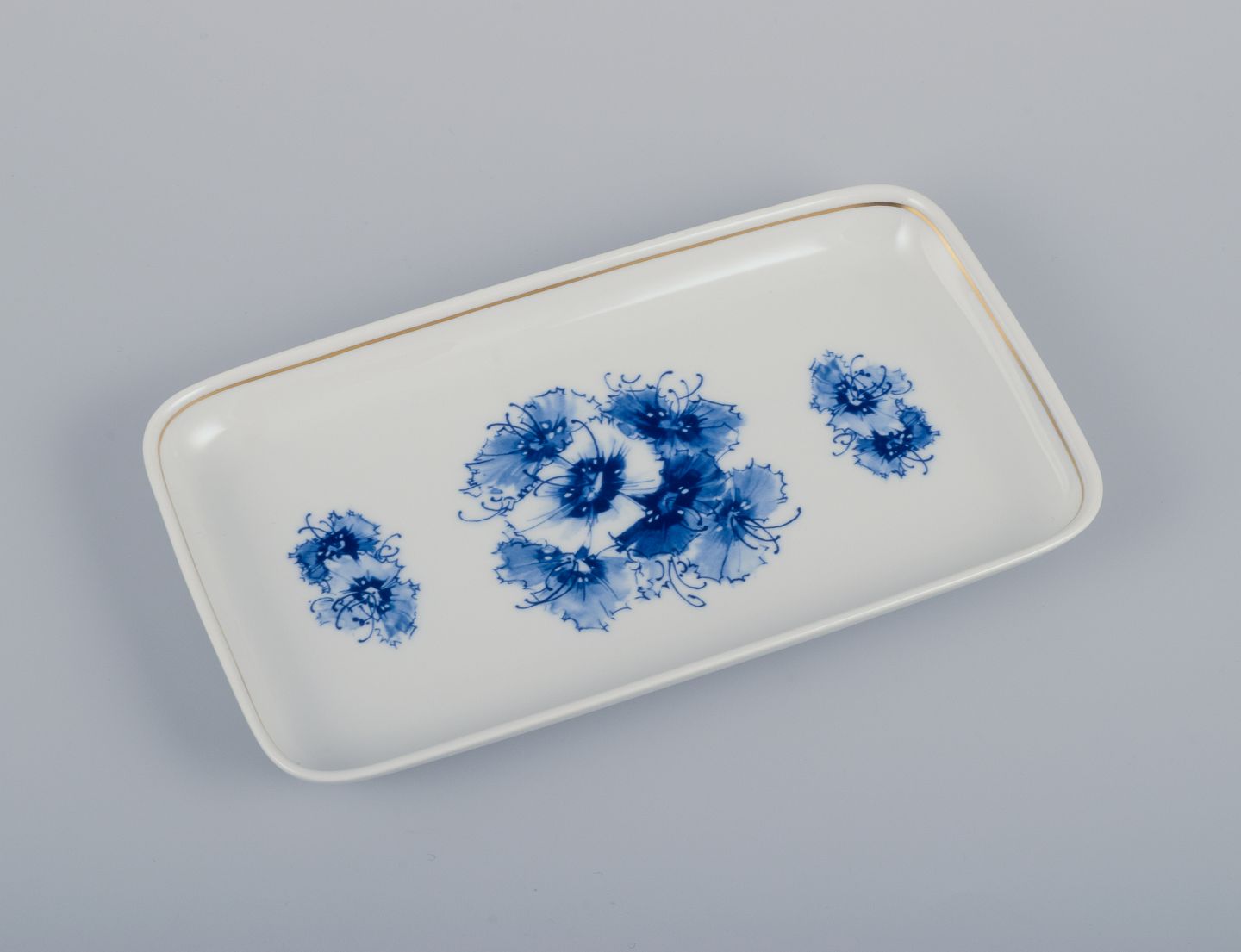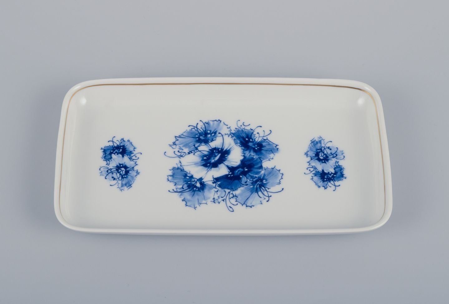 Meissen, Tyskland. Aflangt fad i porcelæn hånddekoreret med blå blomstermotiver, guldkant.