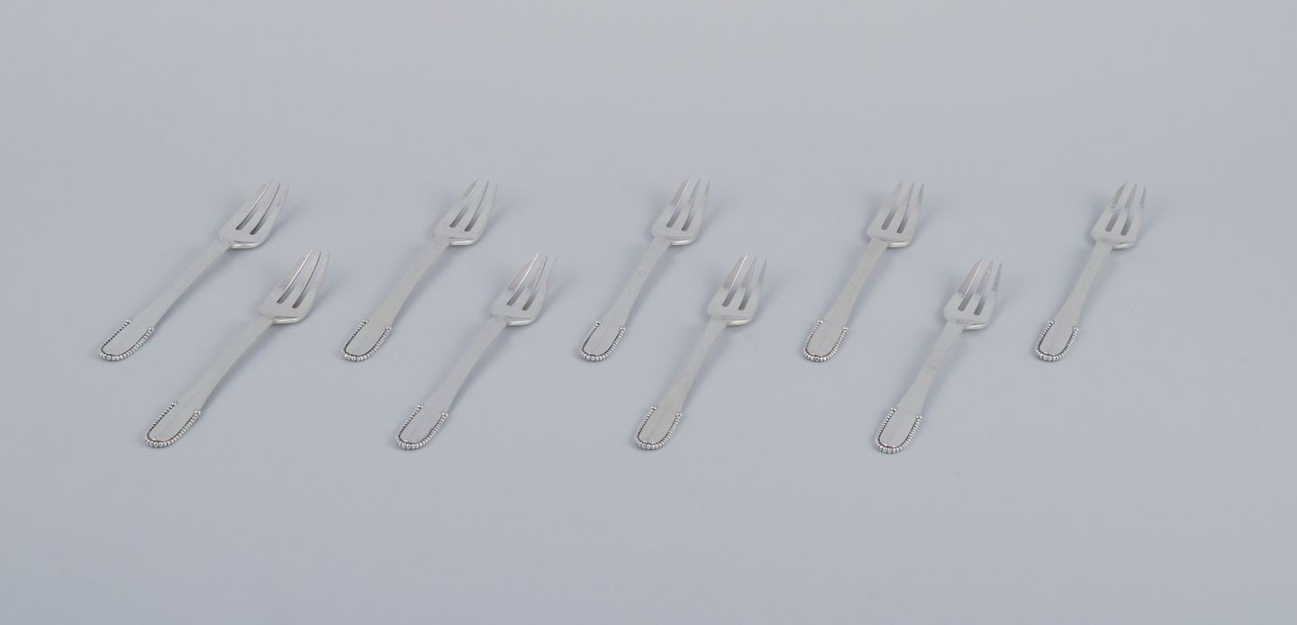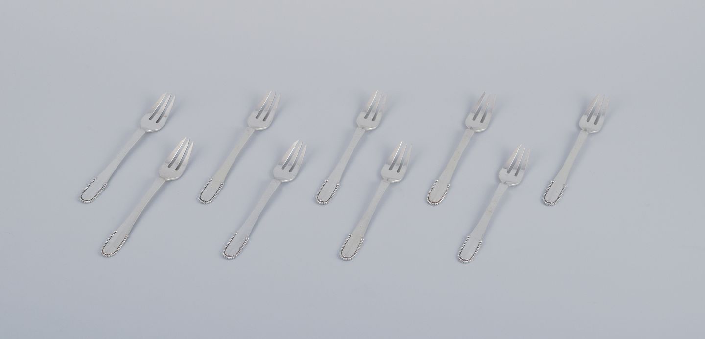 Georg Jensen Beaded, nine cake forks in sterling silver. Hallmark: 1933–1944. In excellent condition. Dimensions: Length 14.3 cm.