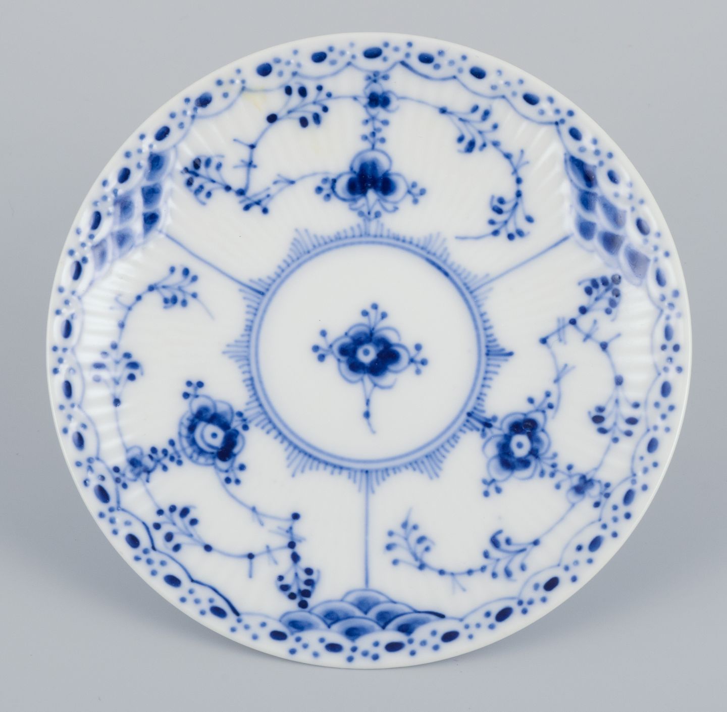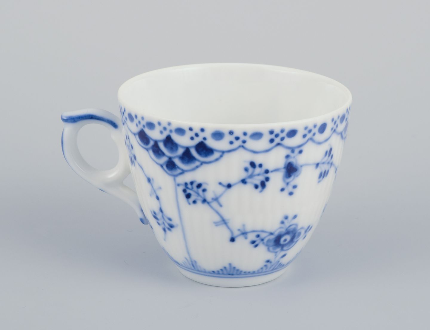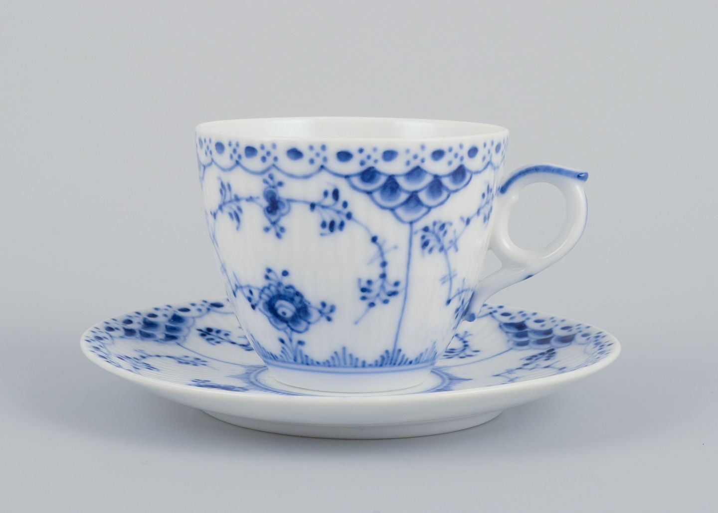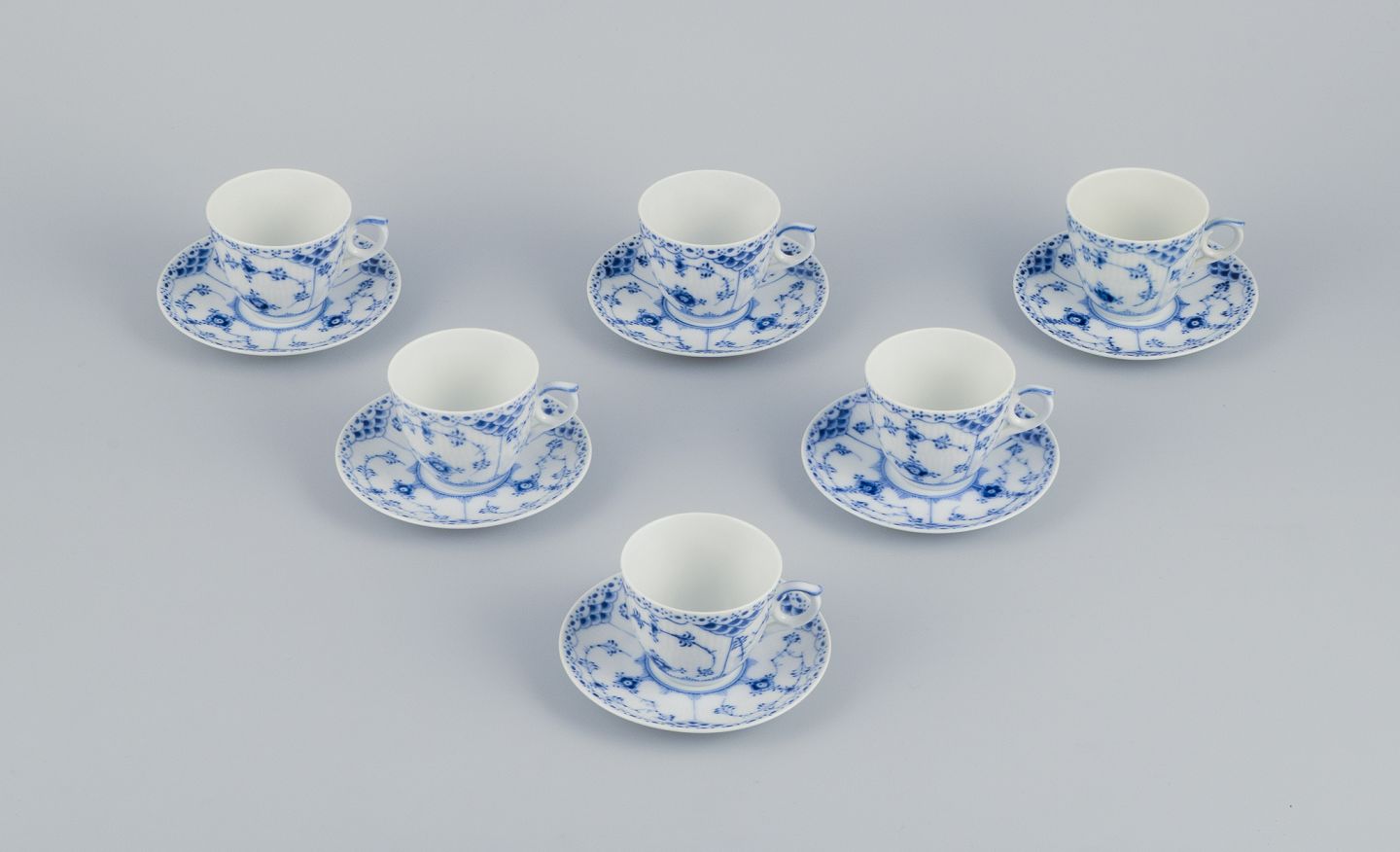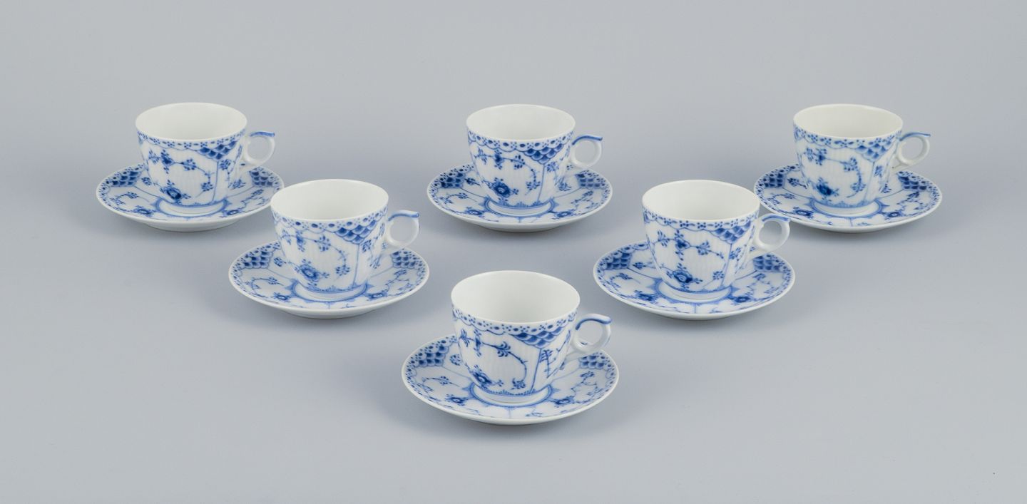 Royal Copenhagen Musselmalet Halvblonde. Et sæt på seks kaffekopper med tilhørende underkopper.
