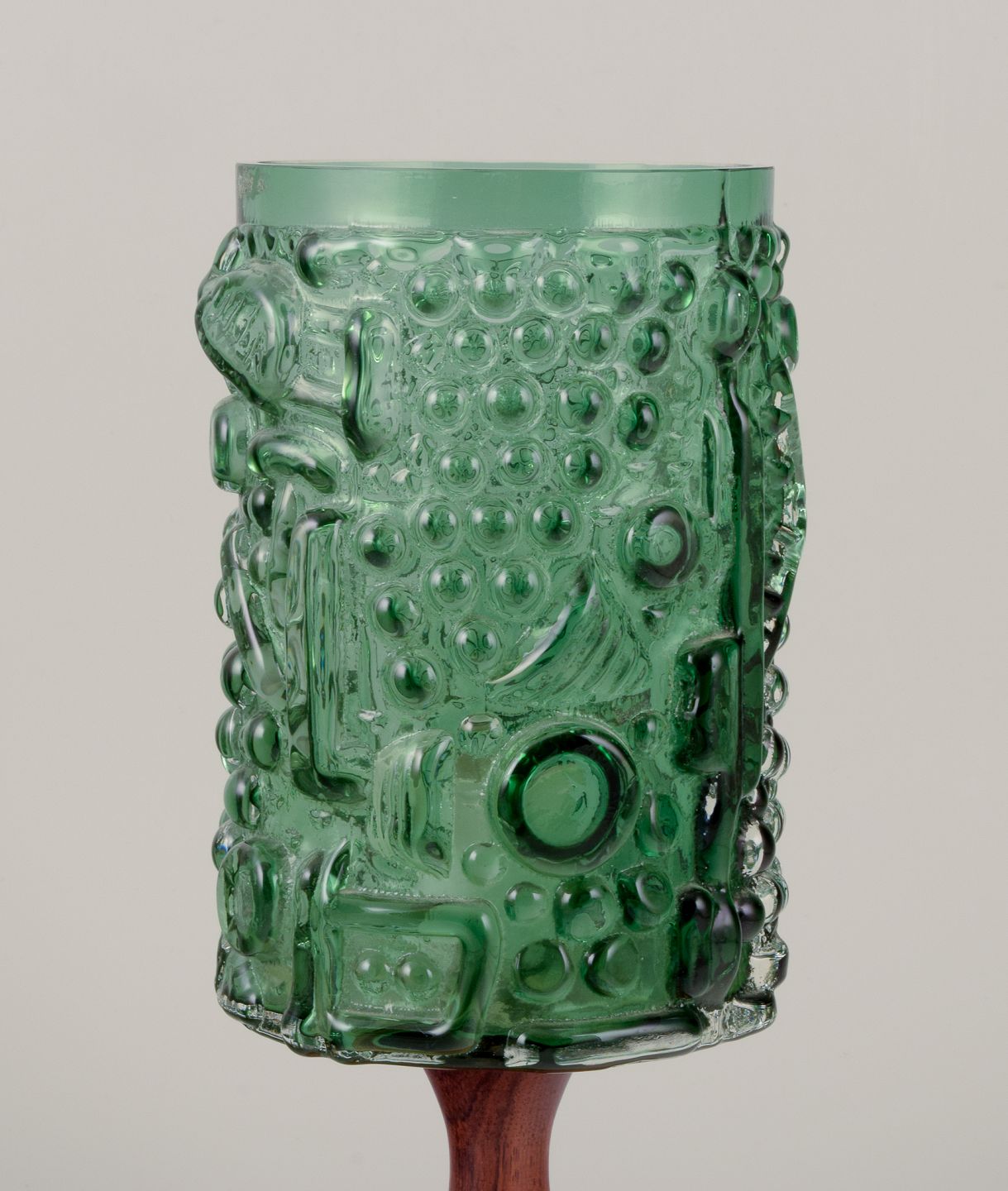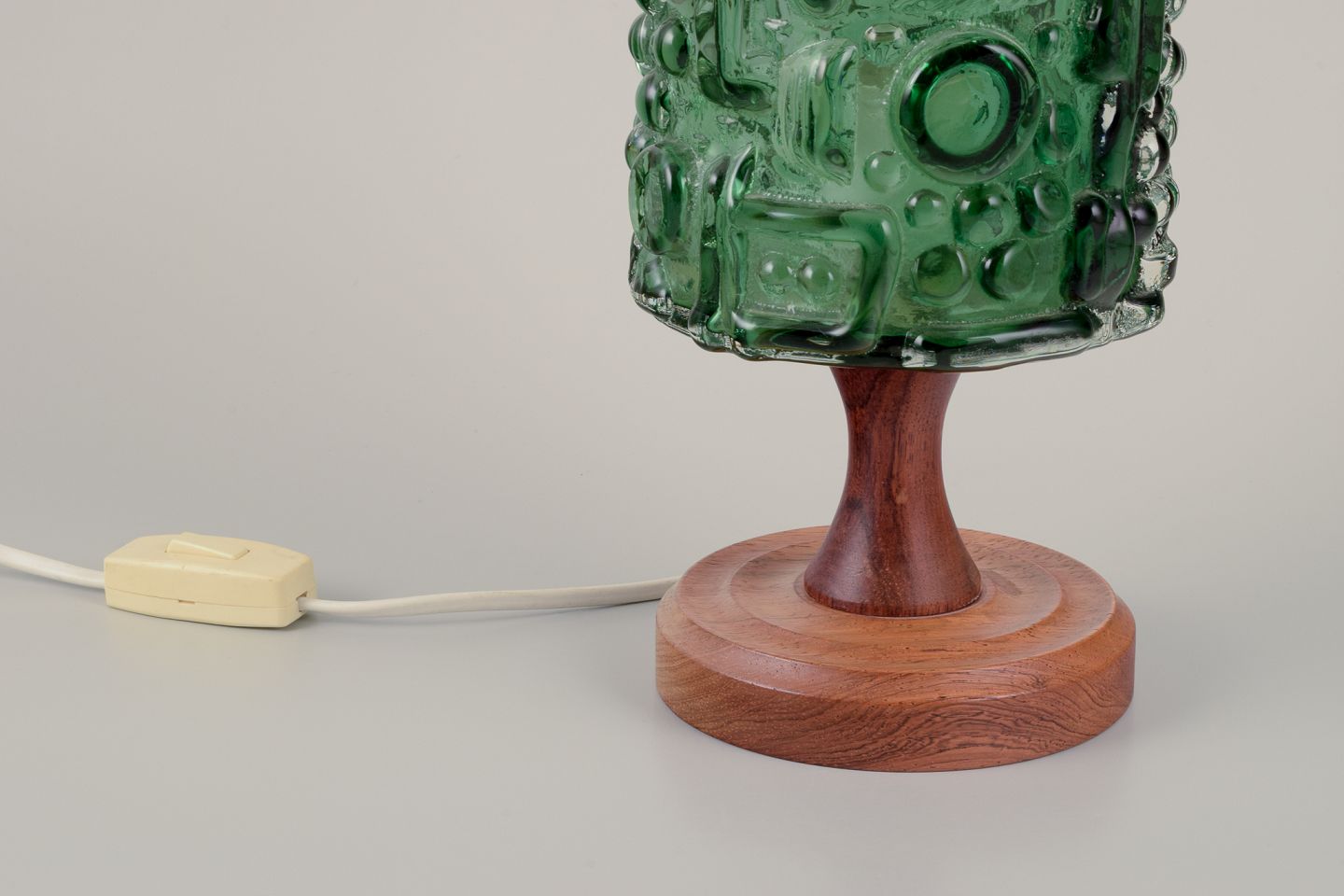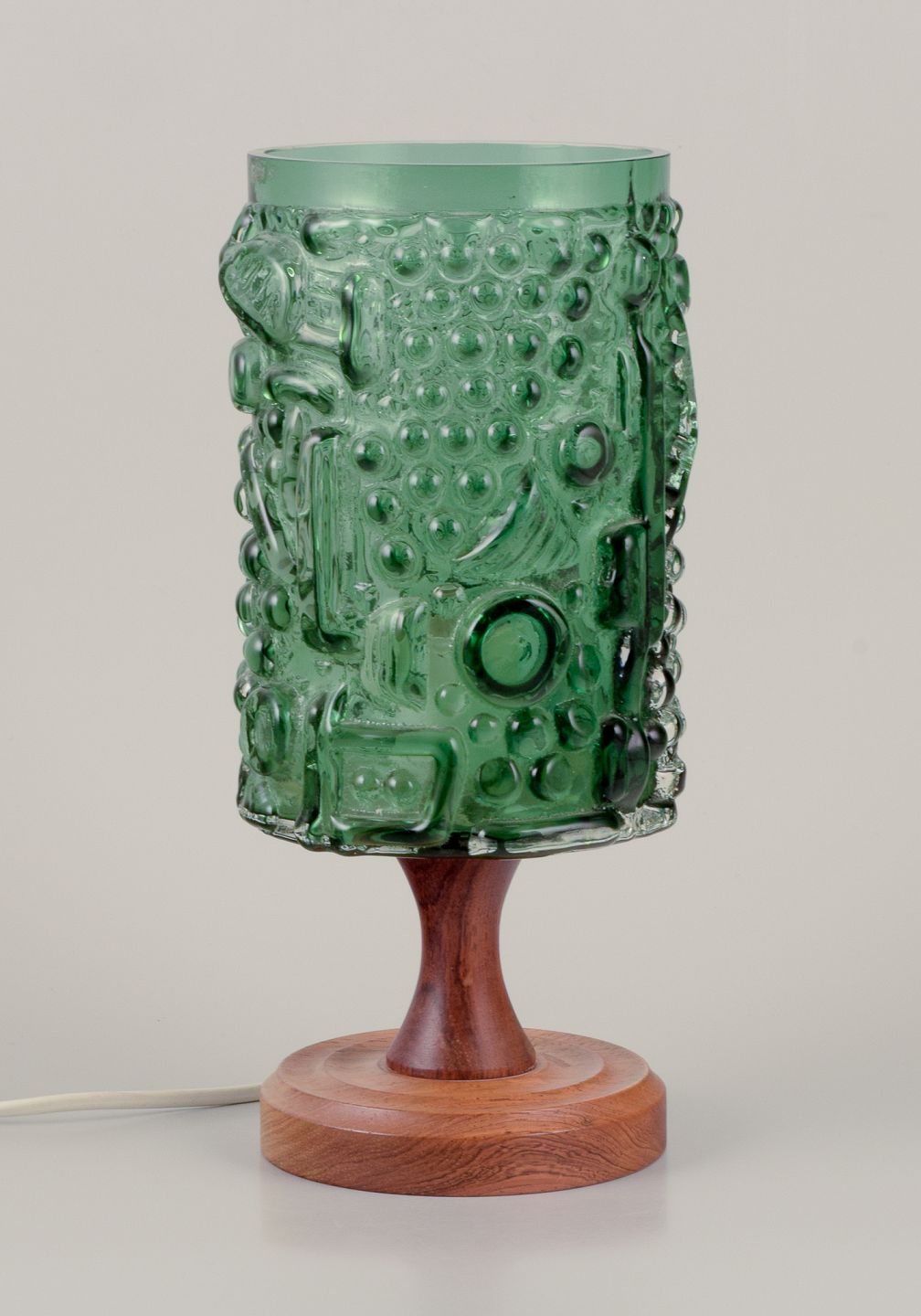 Josef Schott, tjekkisk/svensk glaskunstner. Bordlampe i kunstglas, træfod. Grønt glas, abstrakt motiv. 1970’erne. Perfekt stand. Mål: H 29,0 cm. x D 13,0 cm. Ledning 140 cm.