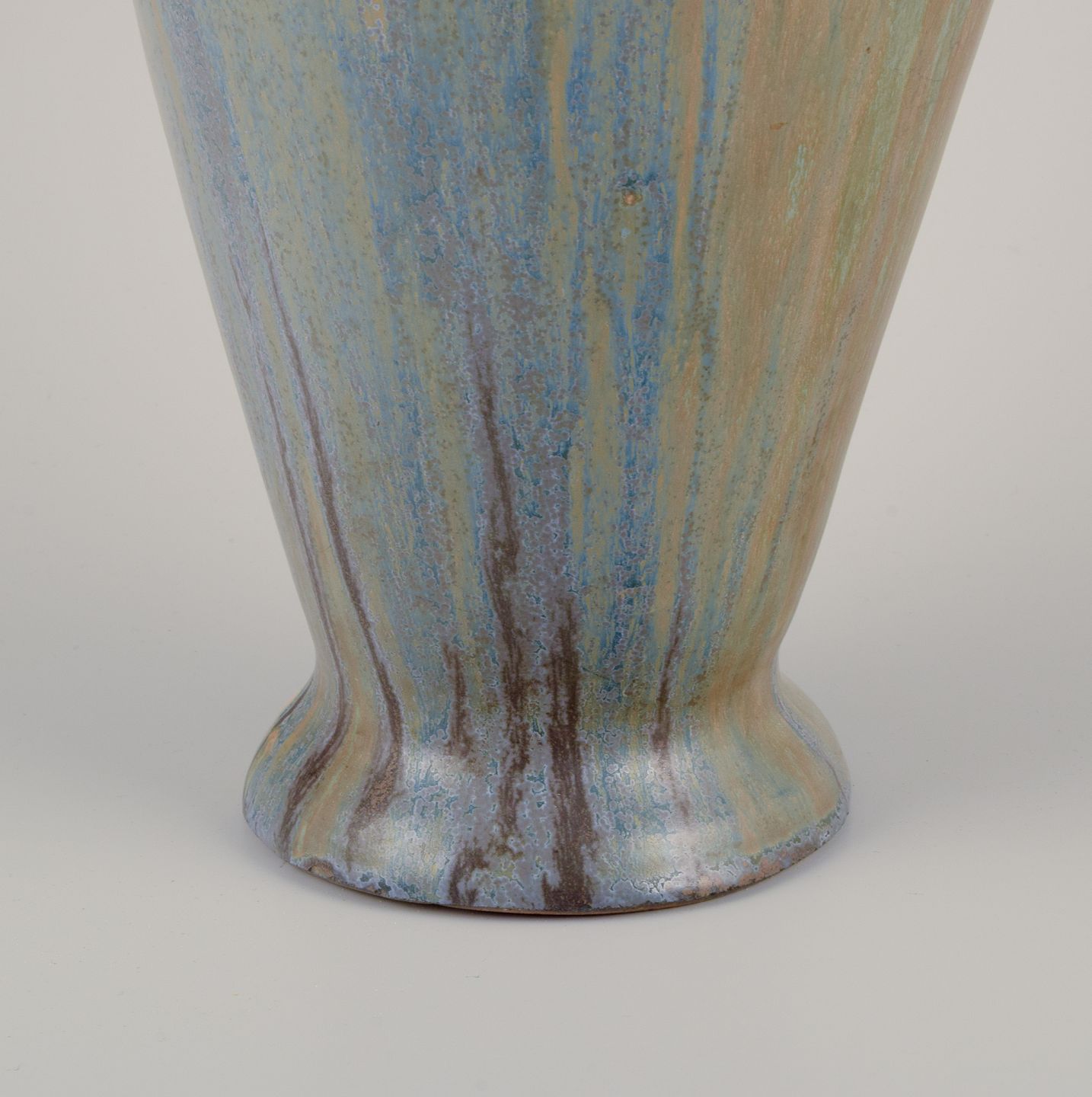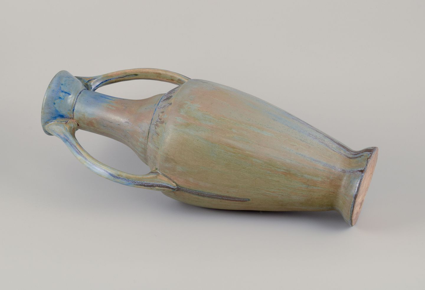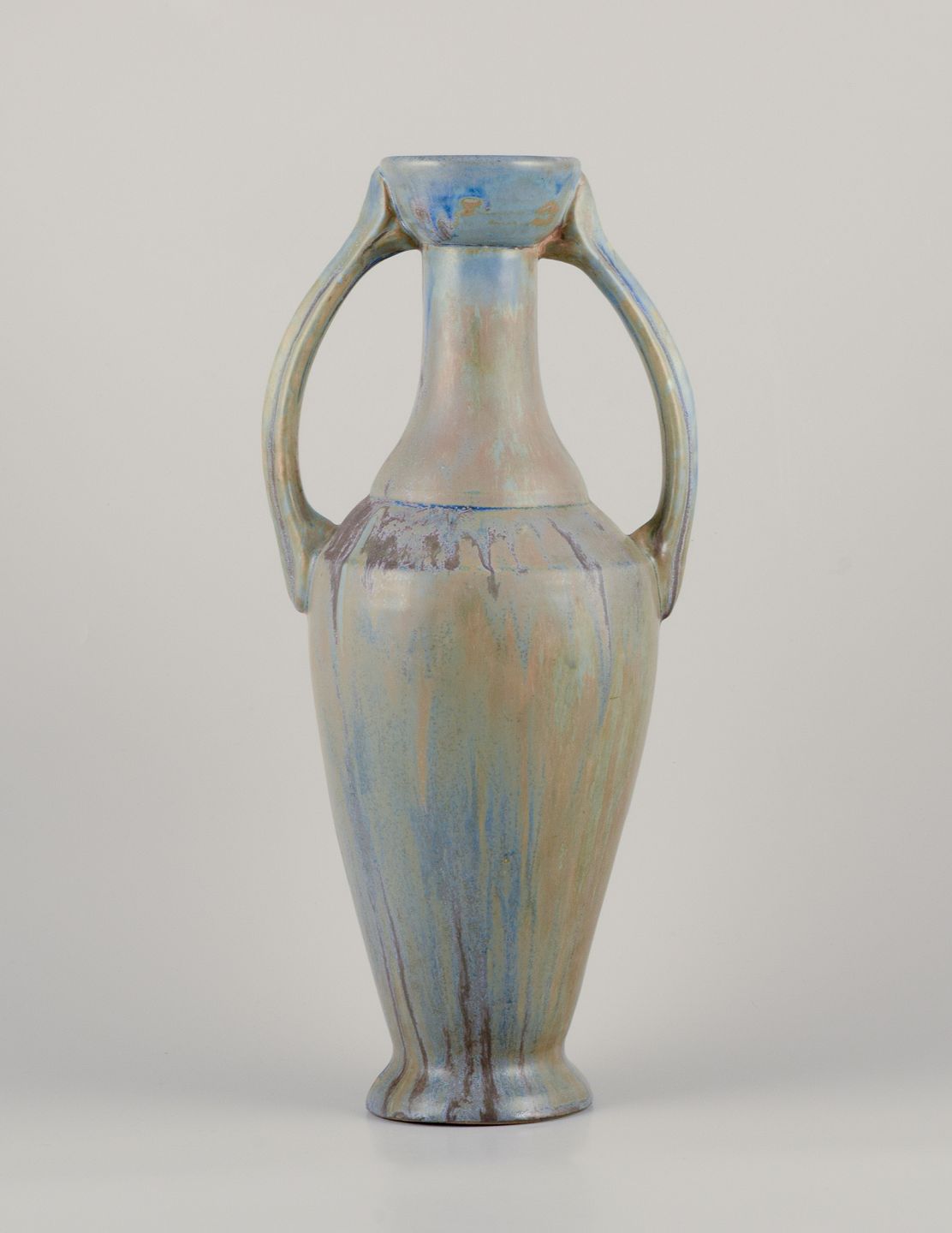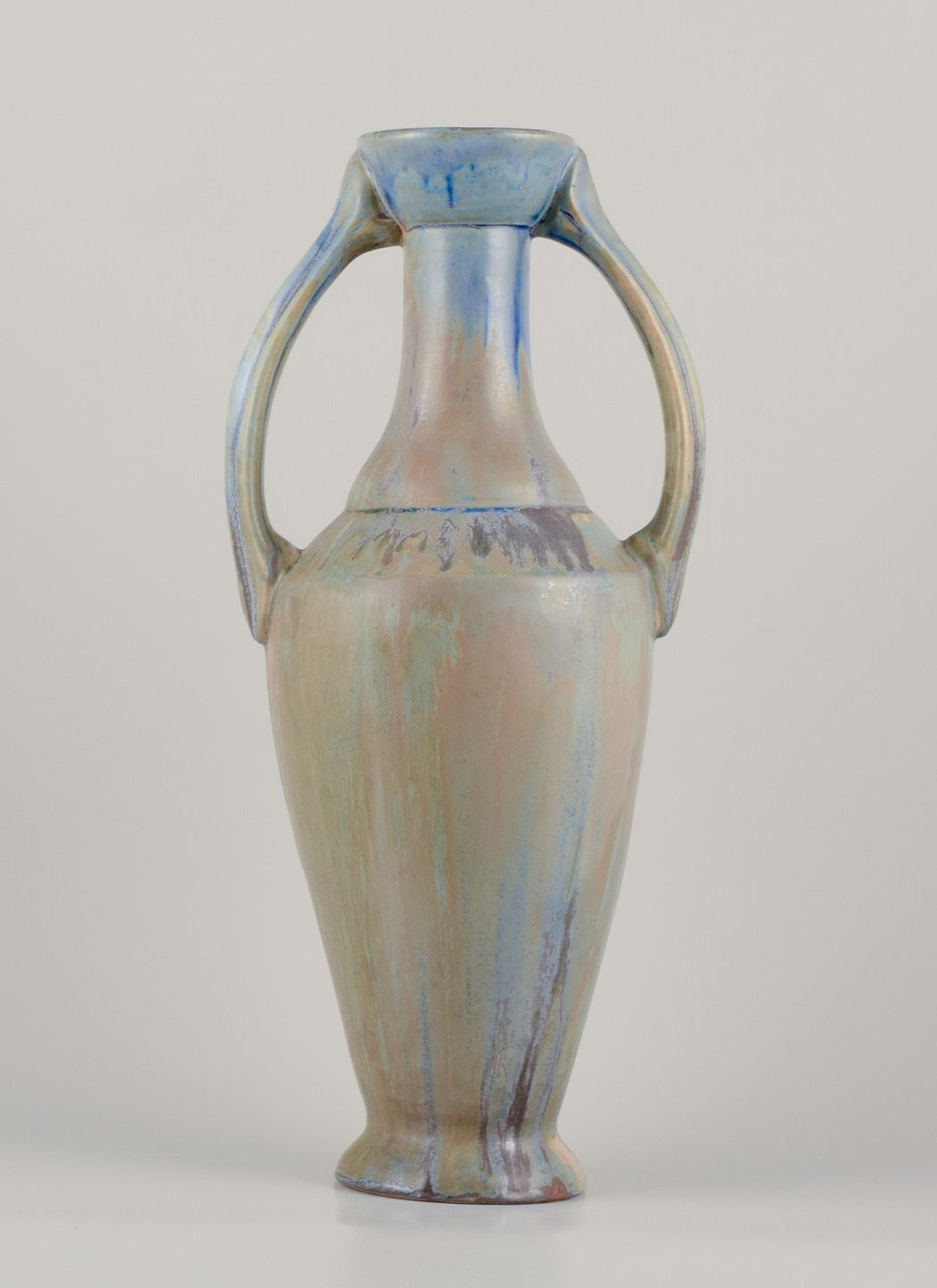 Klassisk amfora-form. Håndglaseret i blå, grønne og brune nuancer.