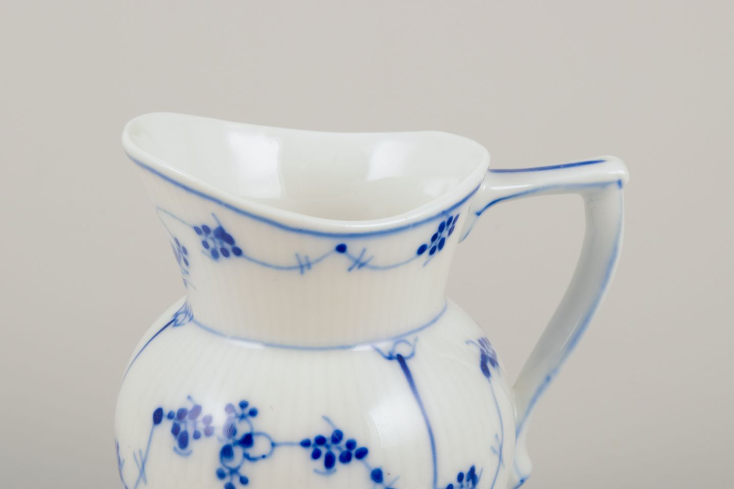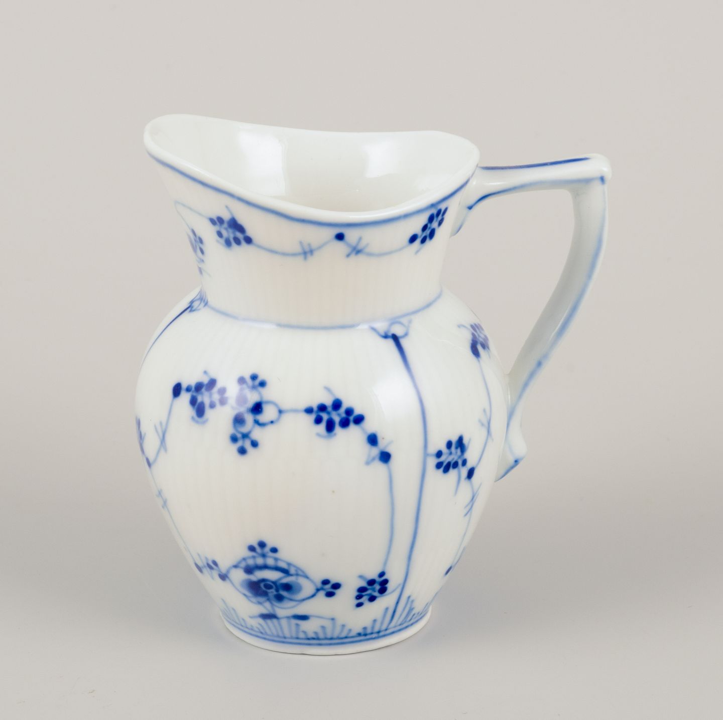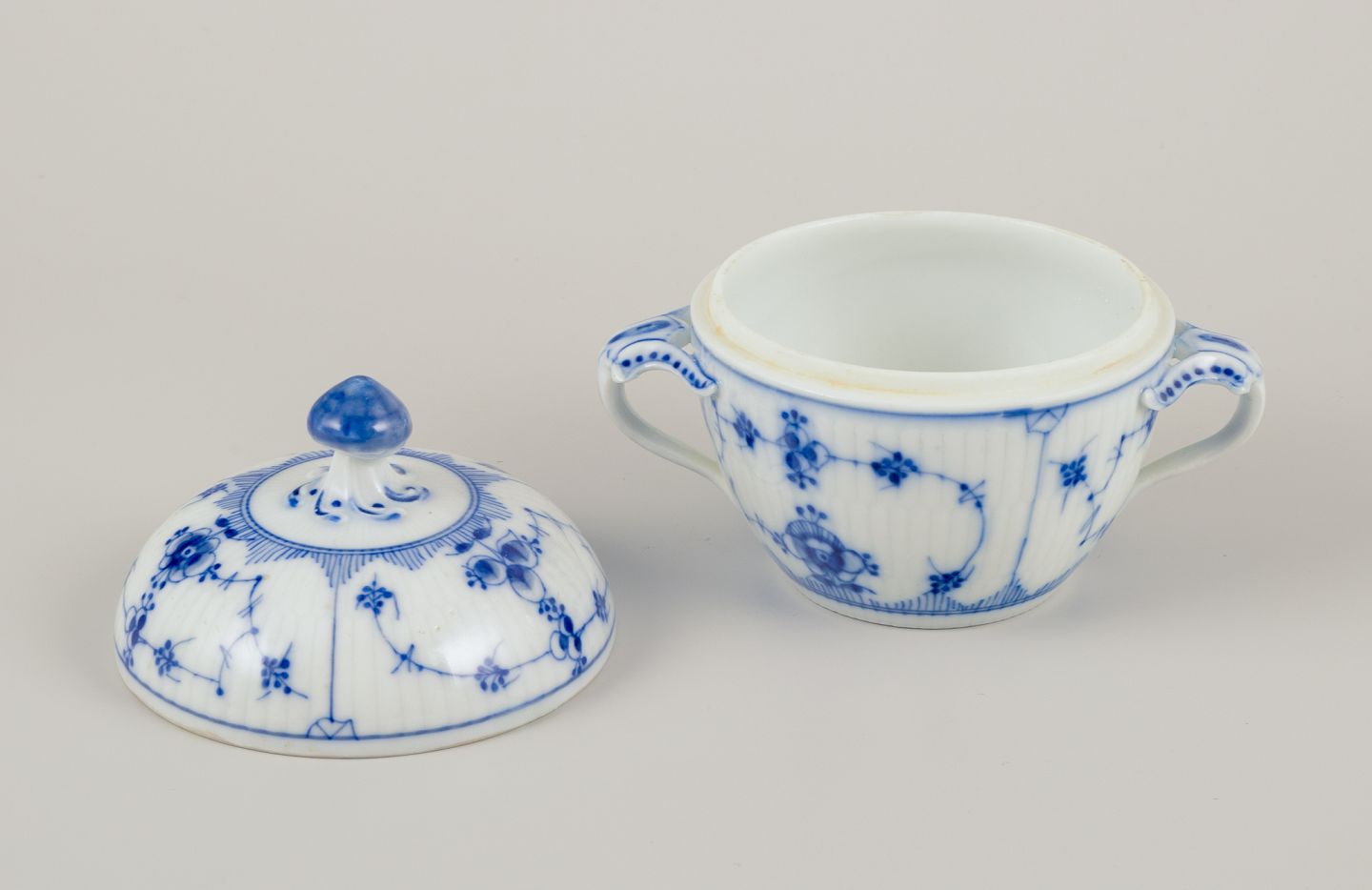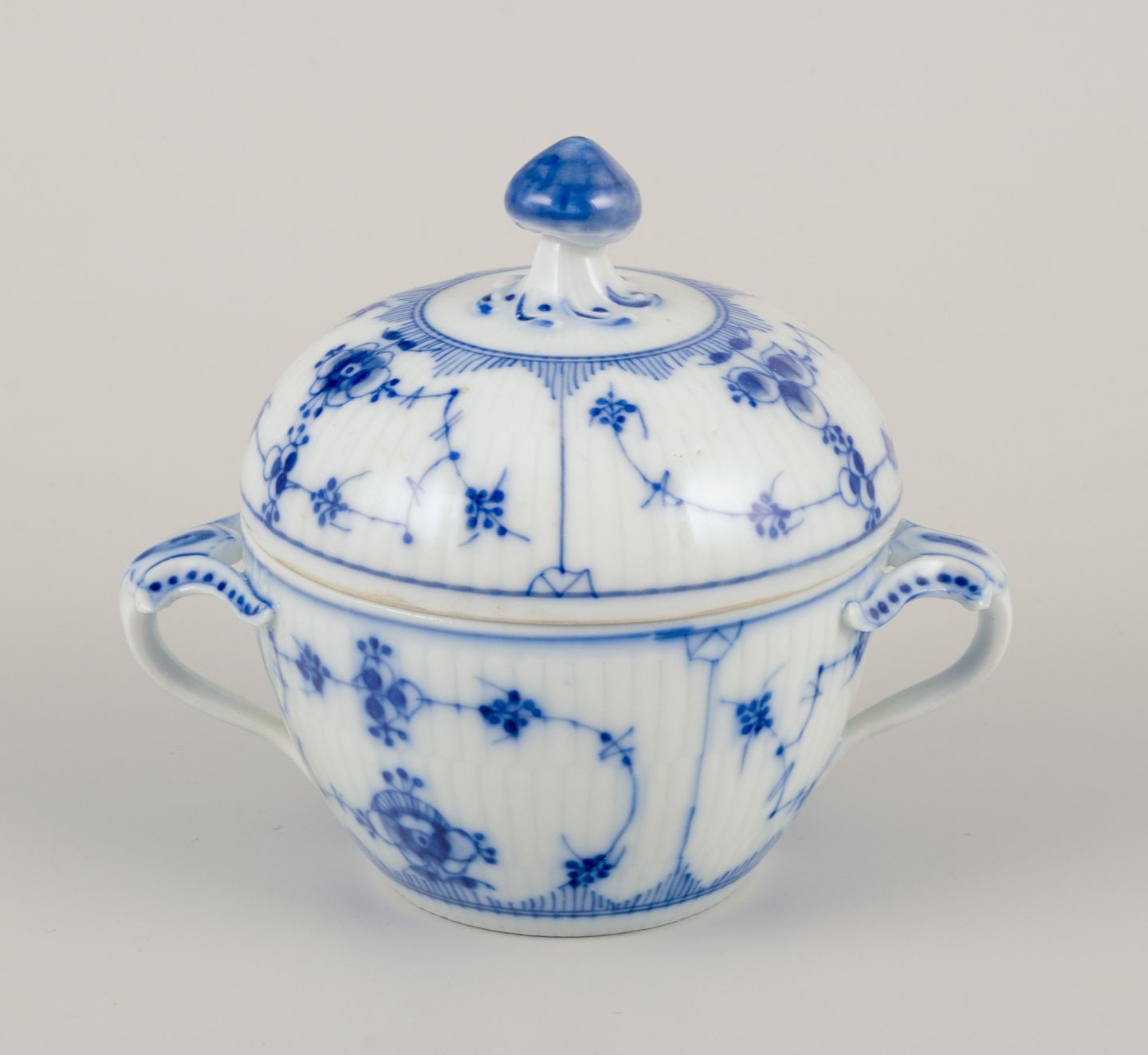 Royal Copenhagen Musselmalet Riflet. Flødekande og sukkerskål. 1800-tallet. Perfekt stand. Stemplet med modellørnumre. Flødekande: H 9,5 cm. x B 8,5 cm. med hank. Sukkerskål: H 11,0 cm. x D 9,5 cm.