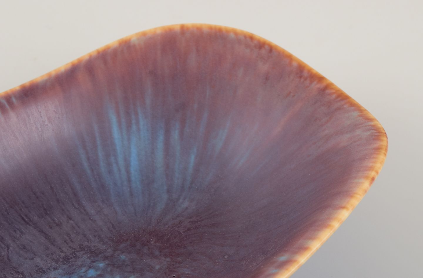 Aflang keramikskål, glasur i blåbrune nuancer.