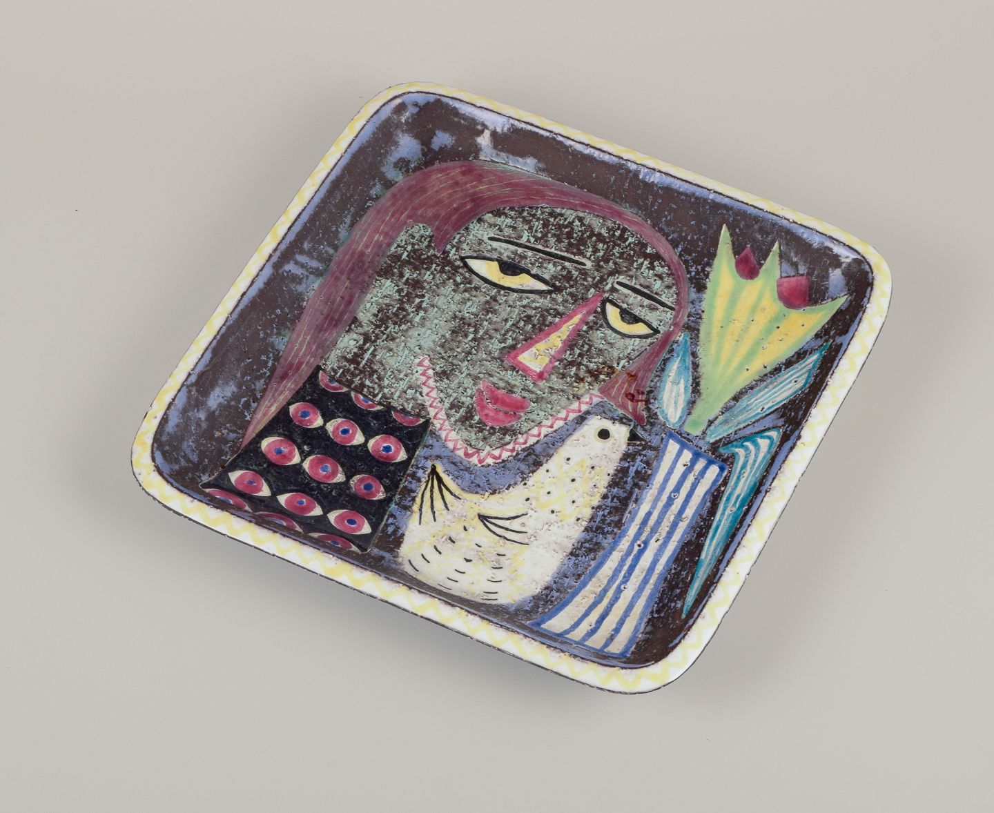Mari Simmulson (1911-2000) for Upsala Ekeby. Stor keramikskål. Hånddekoreret med motiv af fugl, blomster i vase og kvindeansigt.