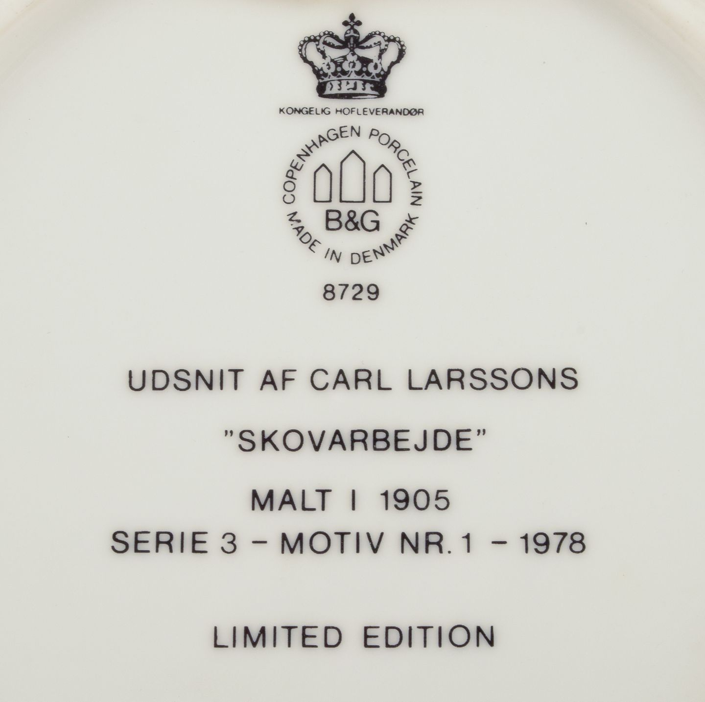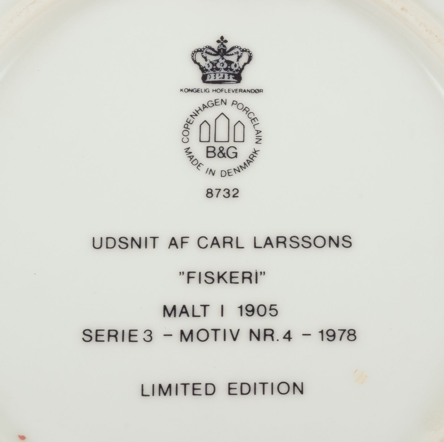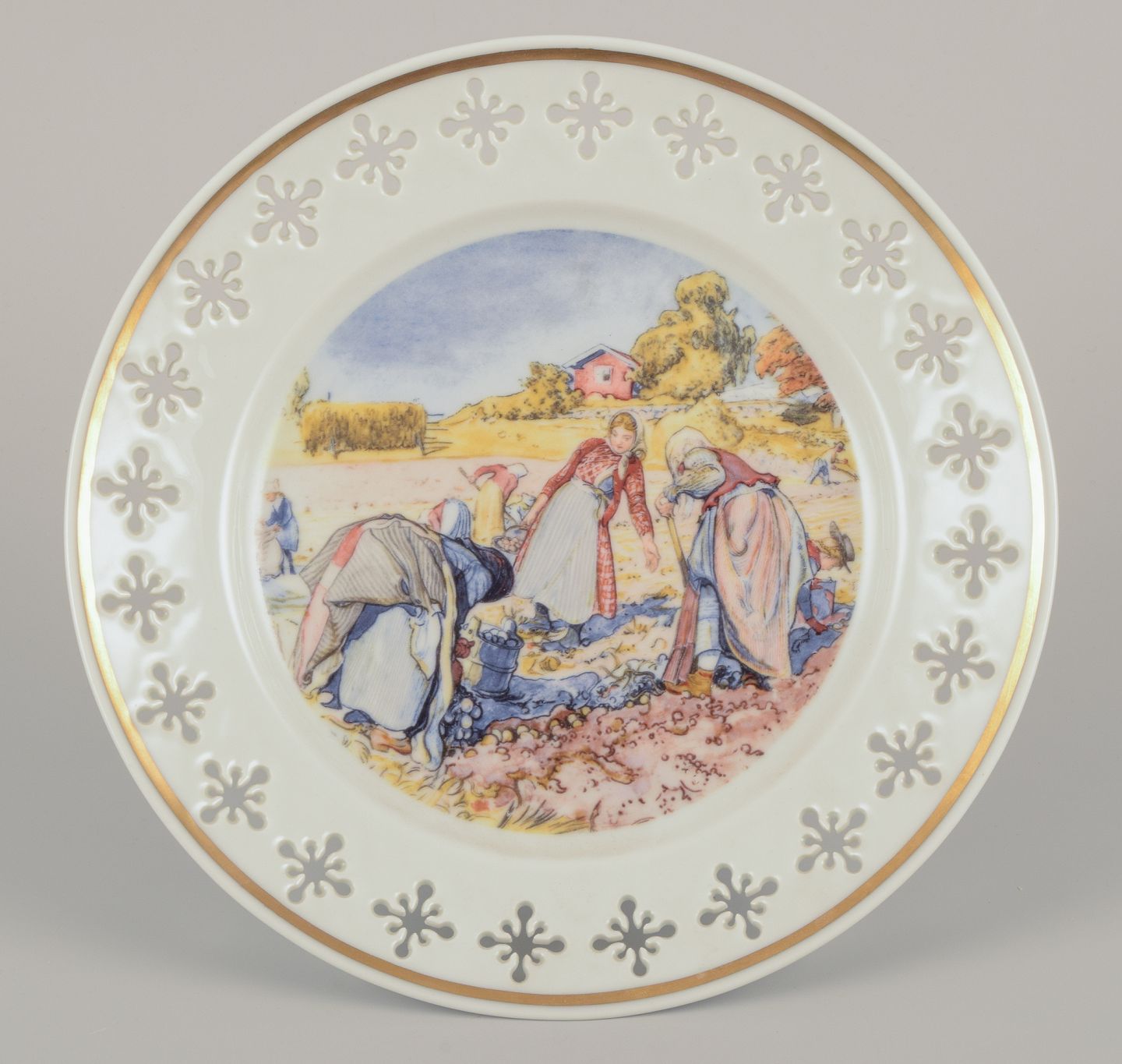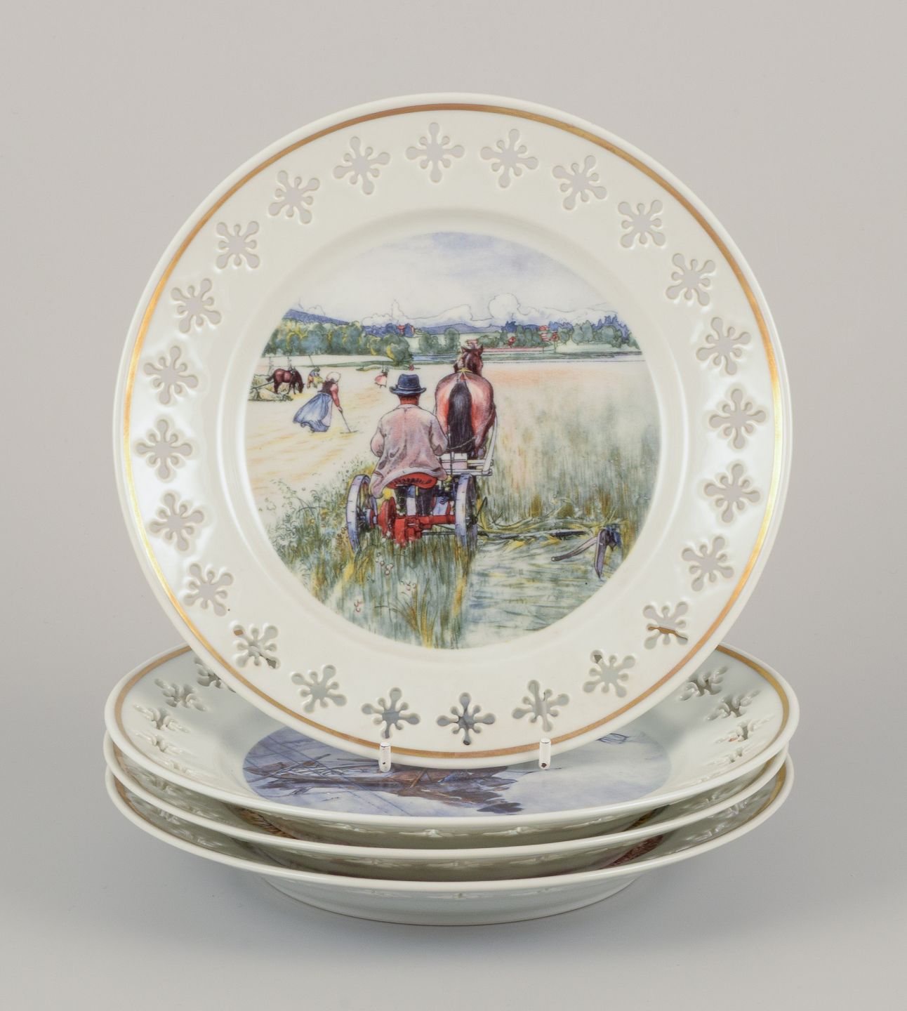 Bing og Grøndahl, Danmark. Et sæt på fire porcelænstallerkner, motiver fra Carl Larssons malerier. Gennembrudt kant.