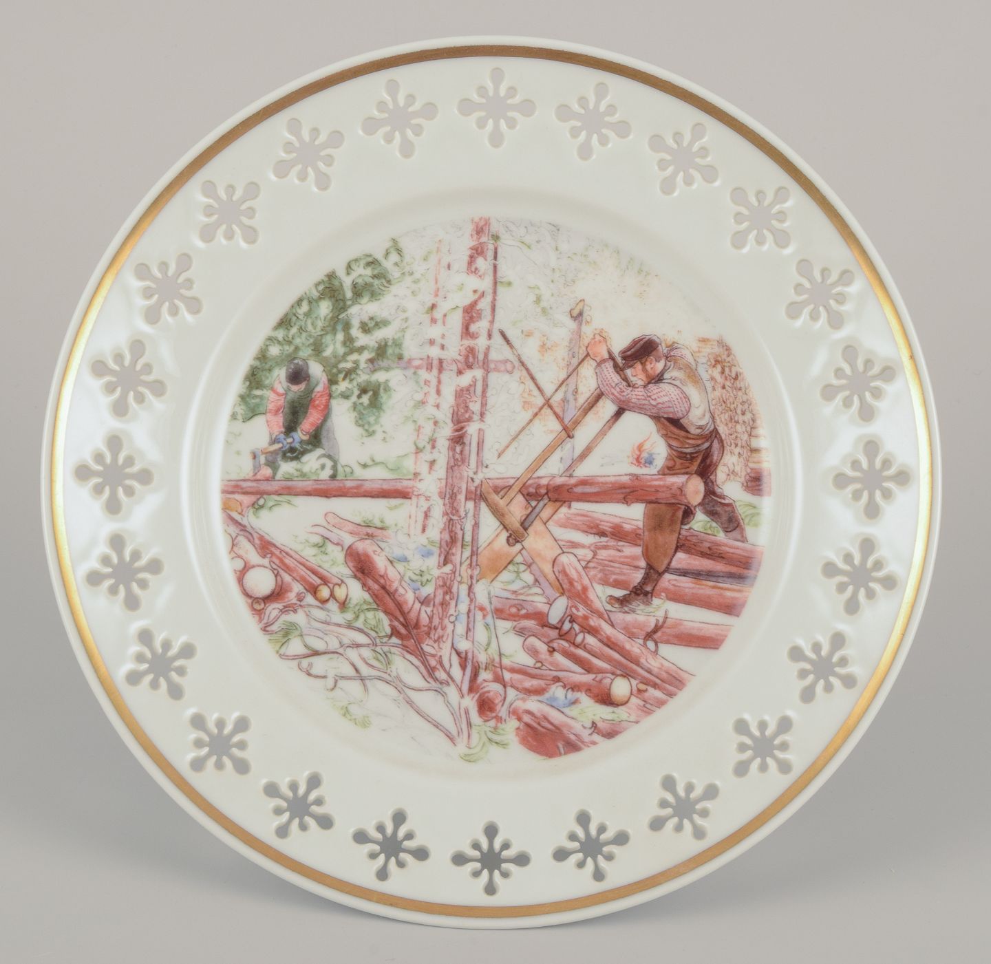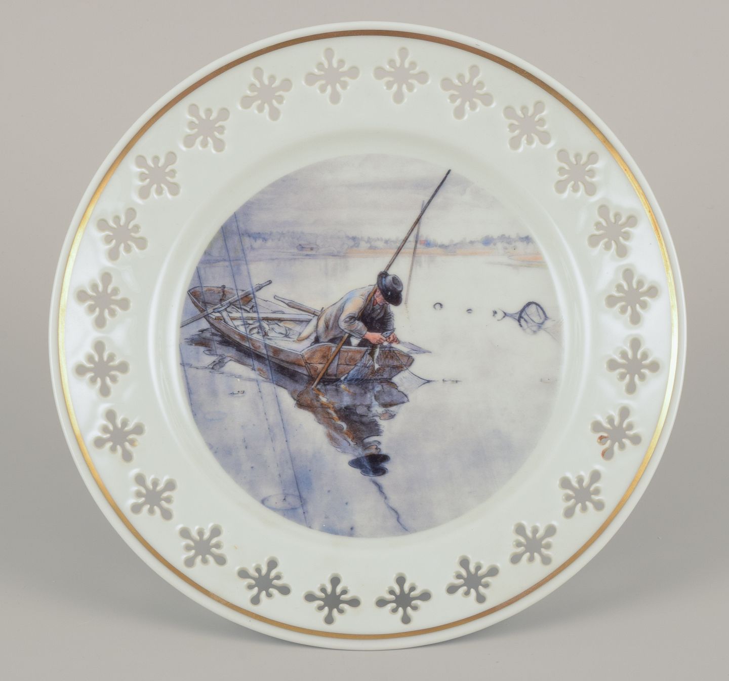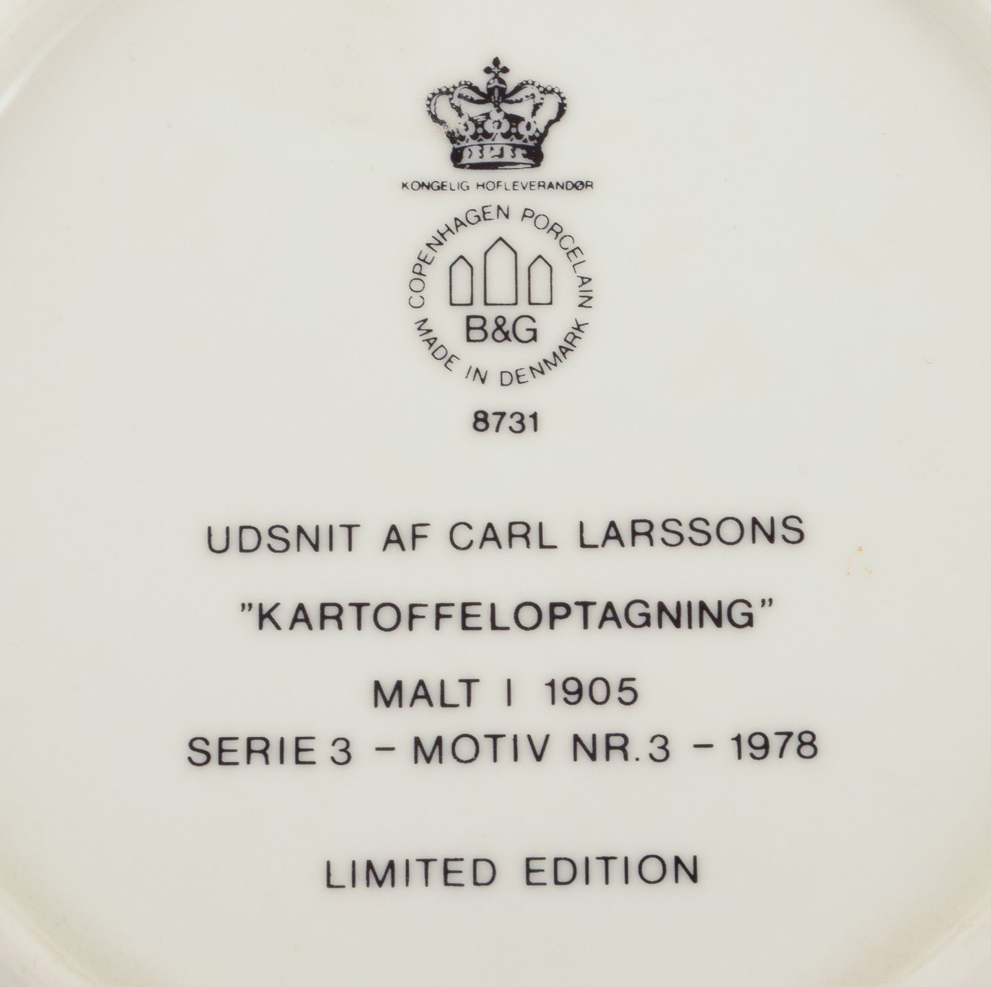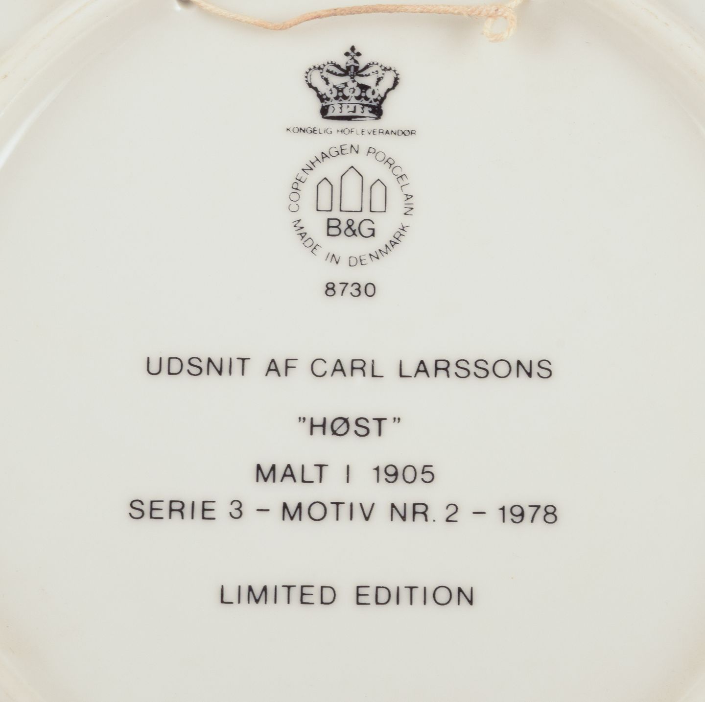 Bing og Grøndahl, Danmark. Et sæt på fire porcelænstallerkner, motiver fra Carl Larssons malerier. Gennembrudt kant.