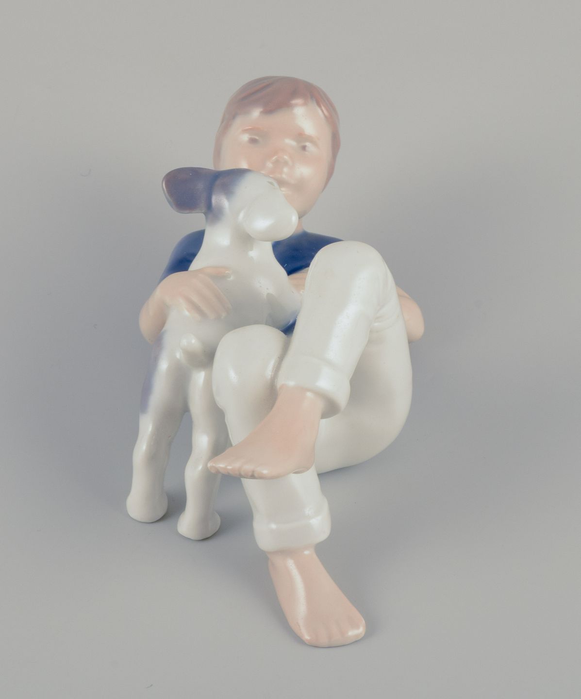 Royal Copenhagen. Porcelænsfigur af dreng med hundehvalp. Sjælden figur. Modelnummer 5660. Ca. 1930’erne. Stemplet. I perfekt stand. Tredje sortering. Mål: L 13,0 cm. x H 5,0 cm.