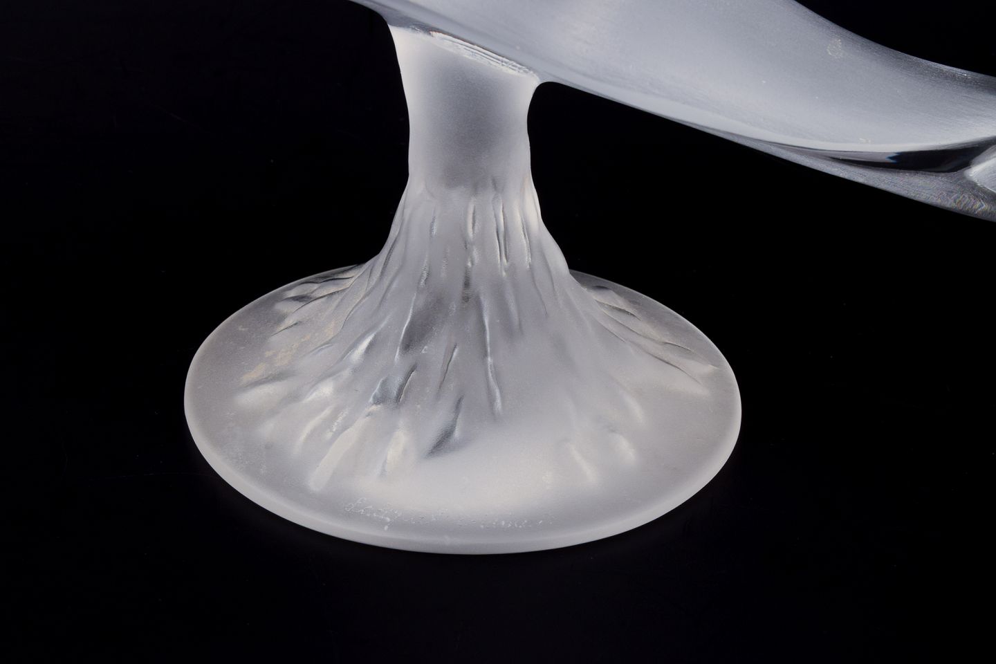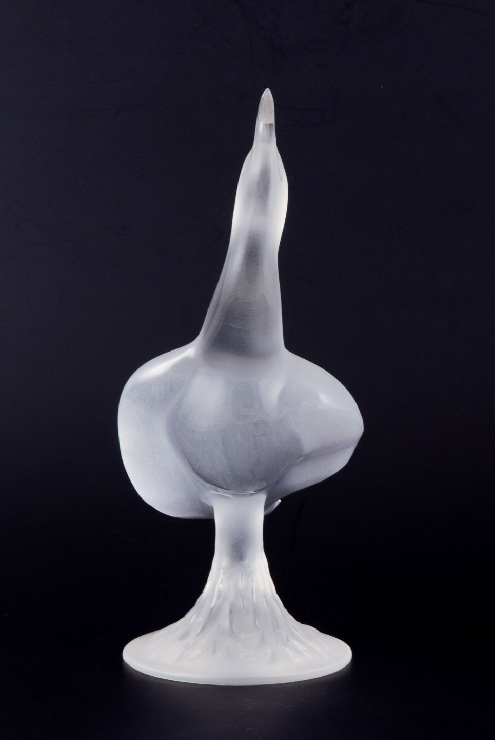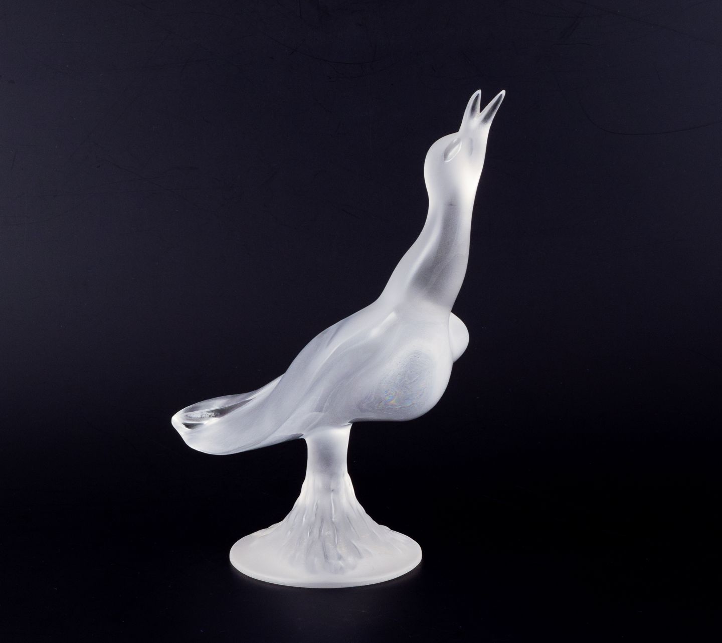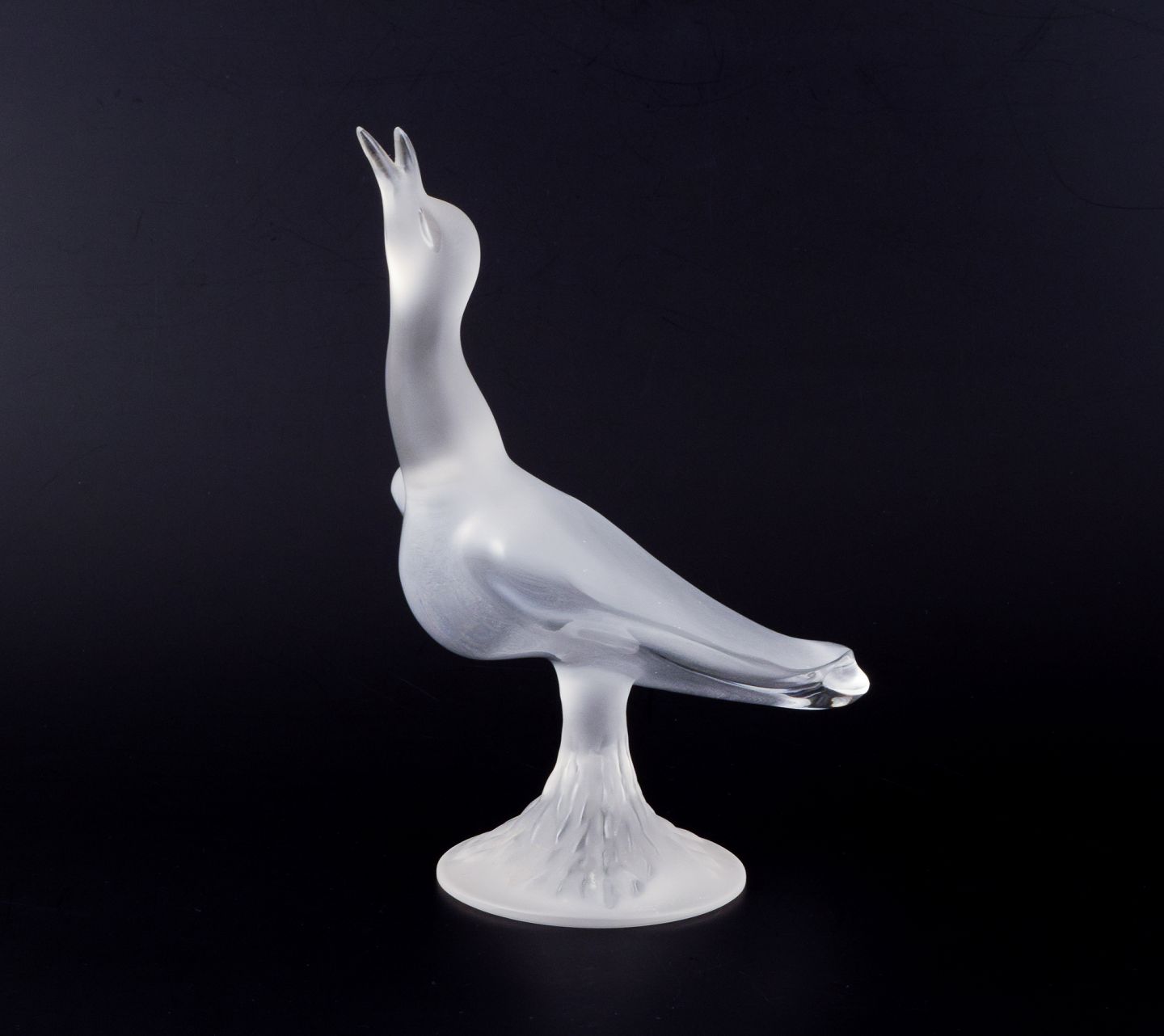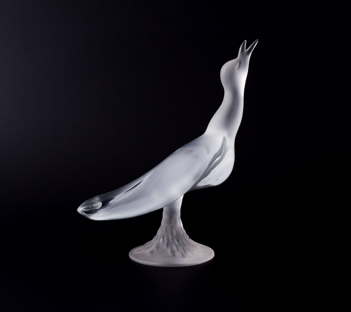 Stor kunstglasskulptur af fugl i klart glas.