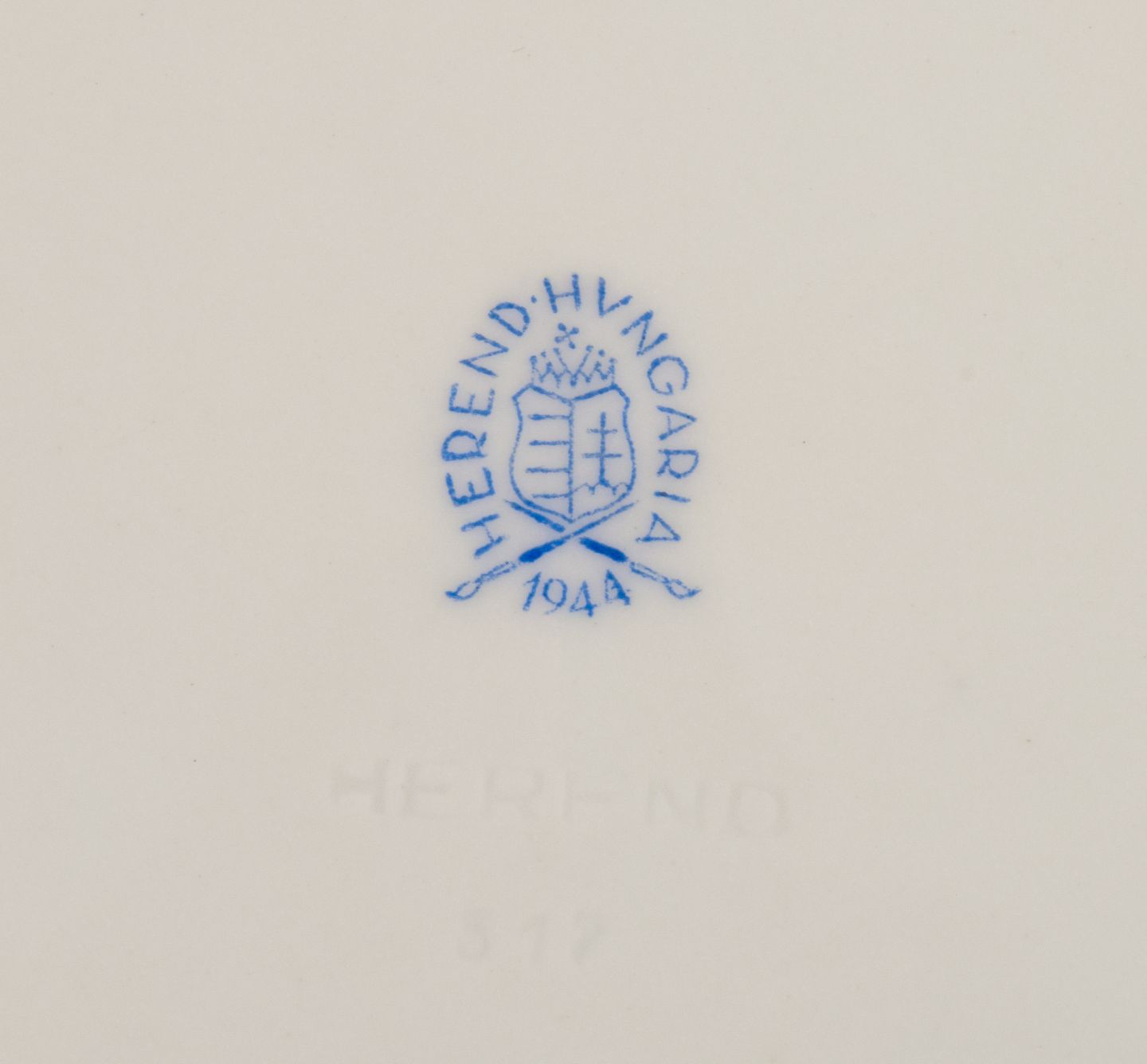 Herend, et sæt på tolv porcelænstallerkner. Håndmalet med polykrome blomstermotiver. Lyserød kant. Stemplet og dateret 1944. Perfekt stand. Fremstår ubrugte. Mål: D 18,5 cm.