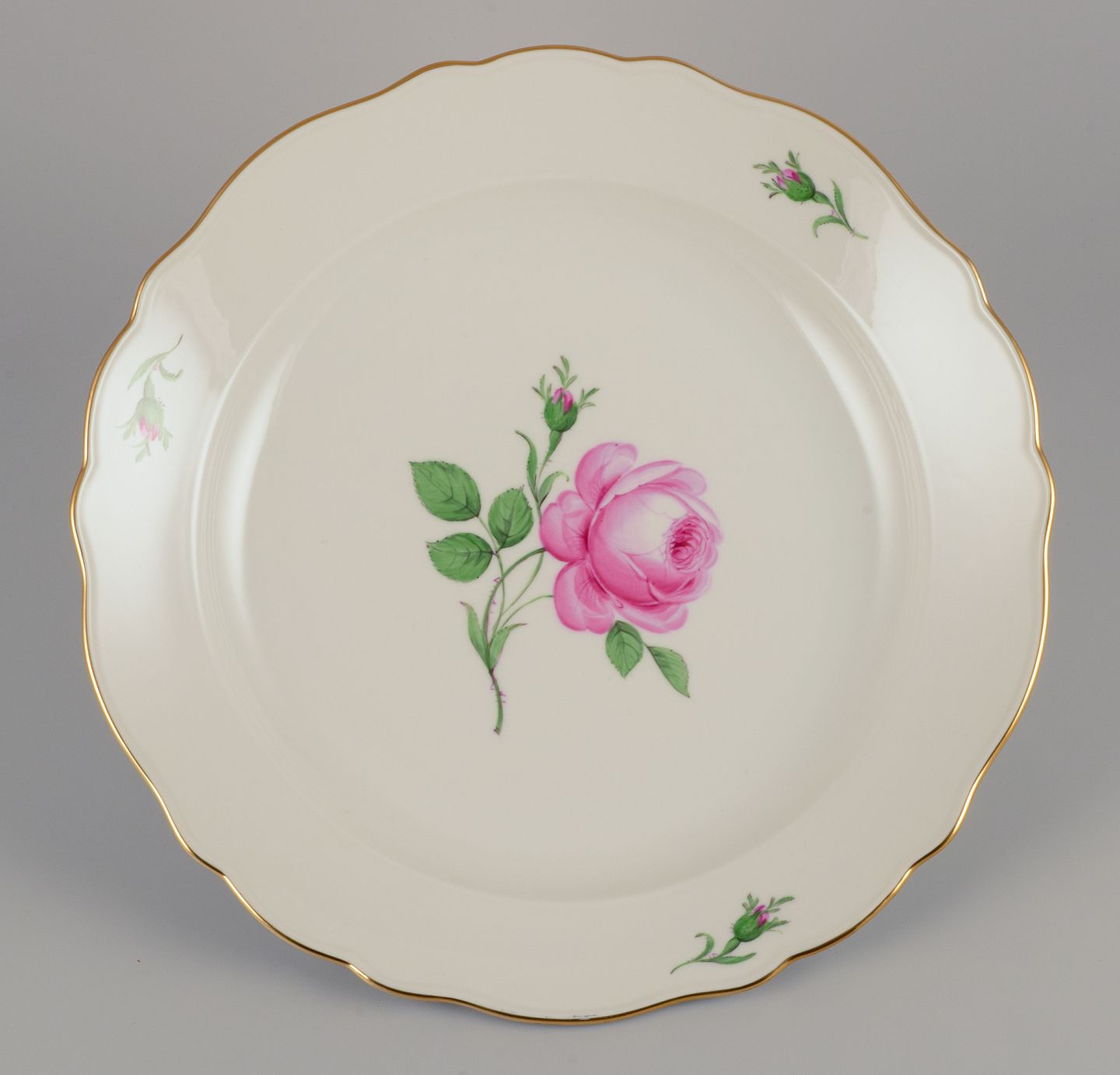 Meissen, stort rundt ”Pink Rose” serveringsfad. Håndmalet med lyserød rose, guldkant. Ca. 1920/30’erne. Stemplet. Tredje sortering. I flot stand med minimalt brugspræg. Mål: D 35,5 cm. x H 5,5 cm.