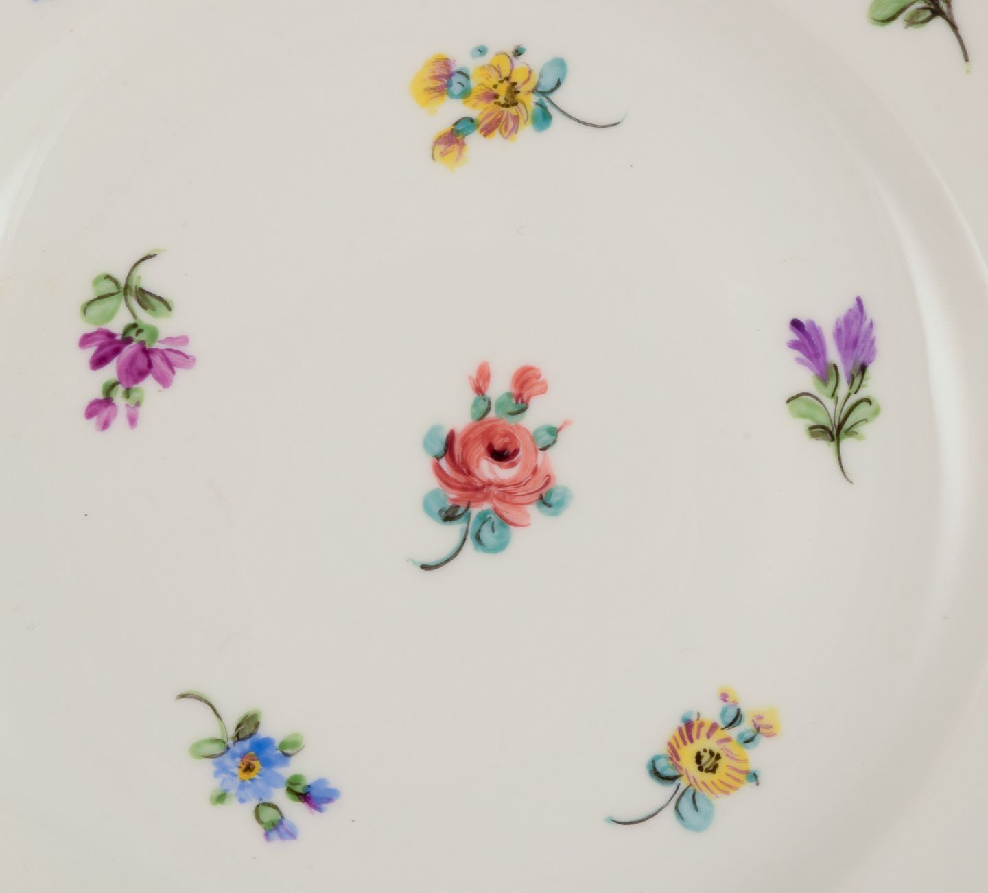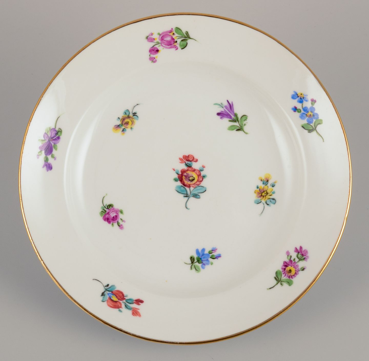 Meissen, Tyskland, fire tallerkner. Håndmalet med polykrome blomstermotiver, guldkant. Ca. 1920. Stemplet. Første sortering. I perfekt stand. Mål: D 18,0 cm.
