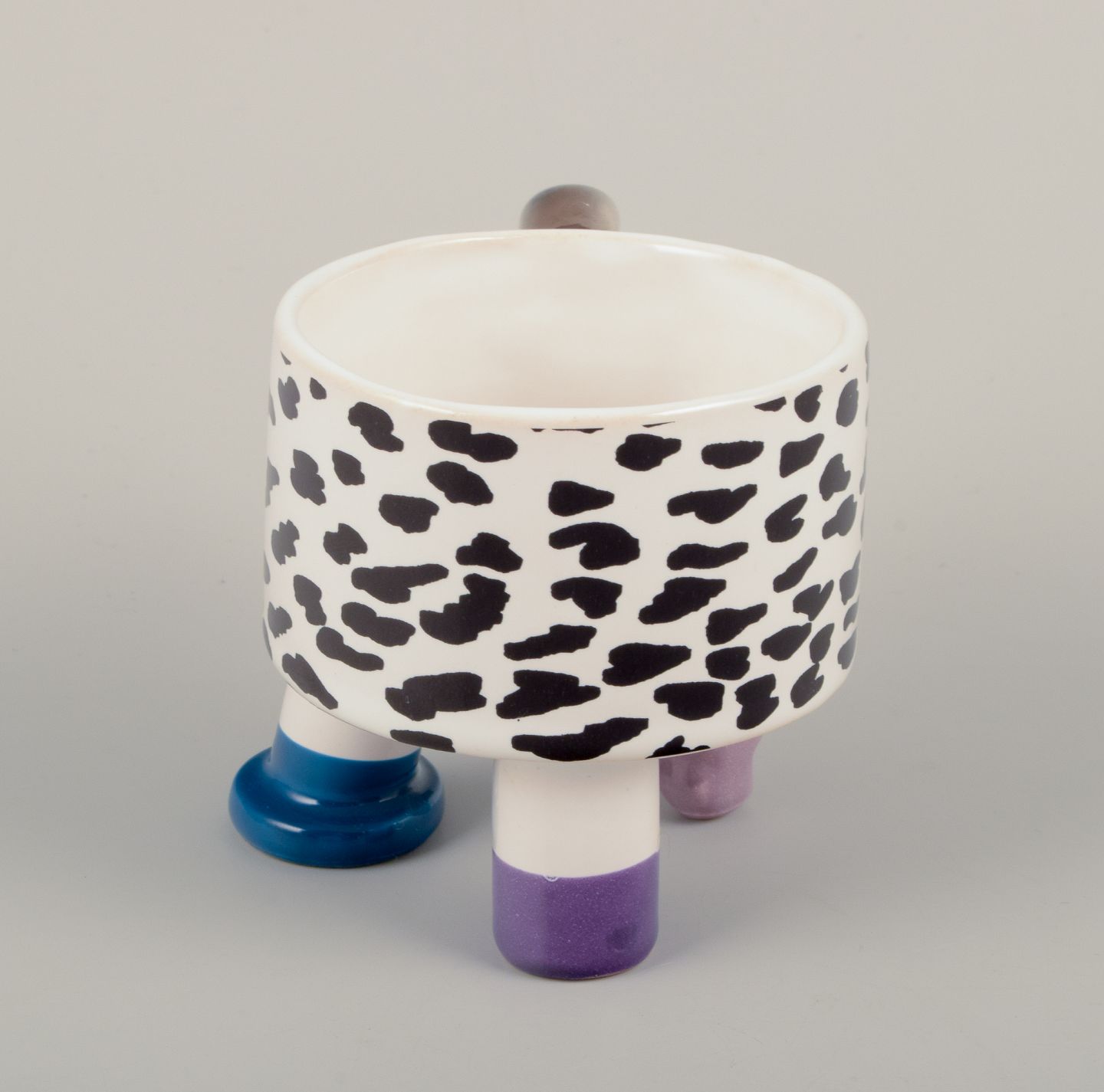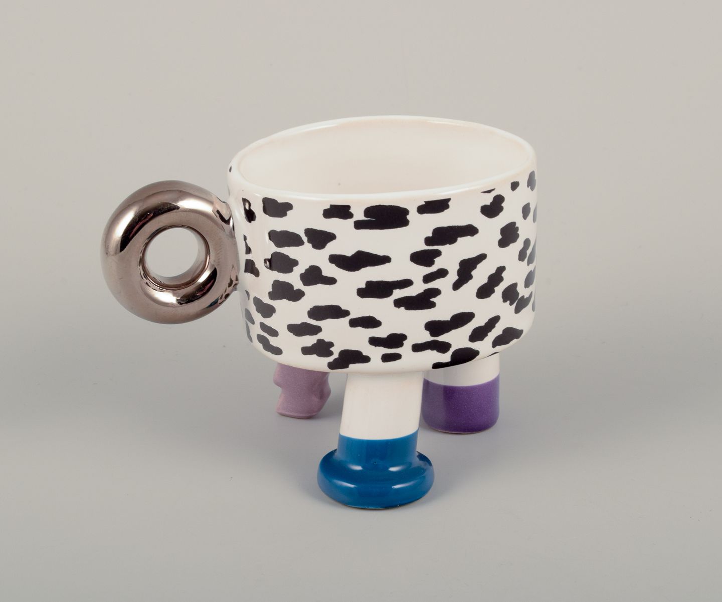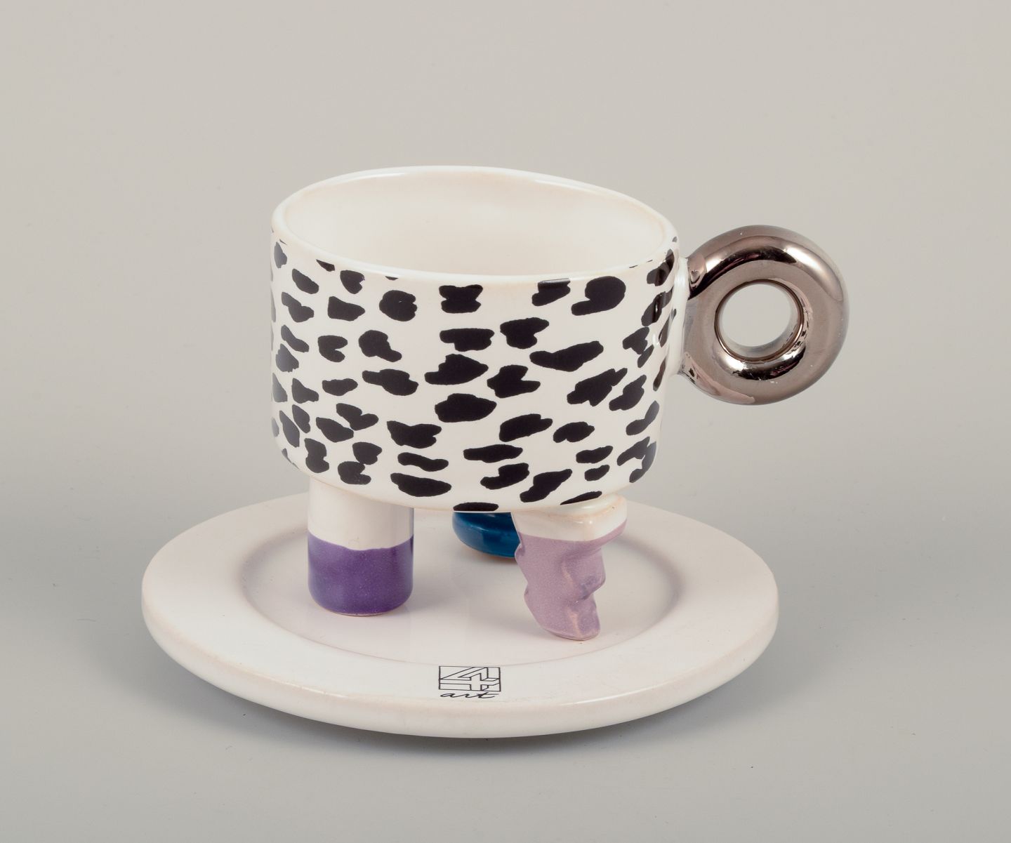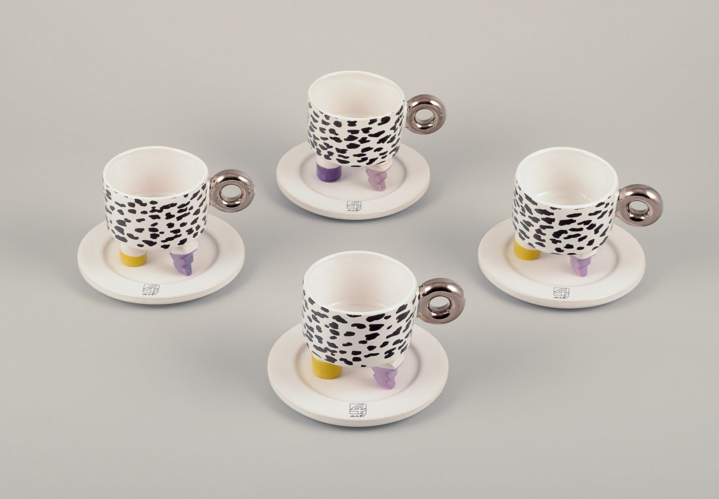 Fransk studio keramiker. Fire par kaffekopper i fajance. Abstrakt futuristisk stil. Sent 1900-tallet. Stemplet. Perfekt stand. Kop: H 8,0 cm. x D 7,0 cm. uden hank Underkop: D 12,5 cm.