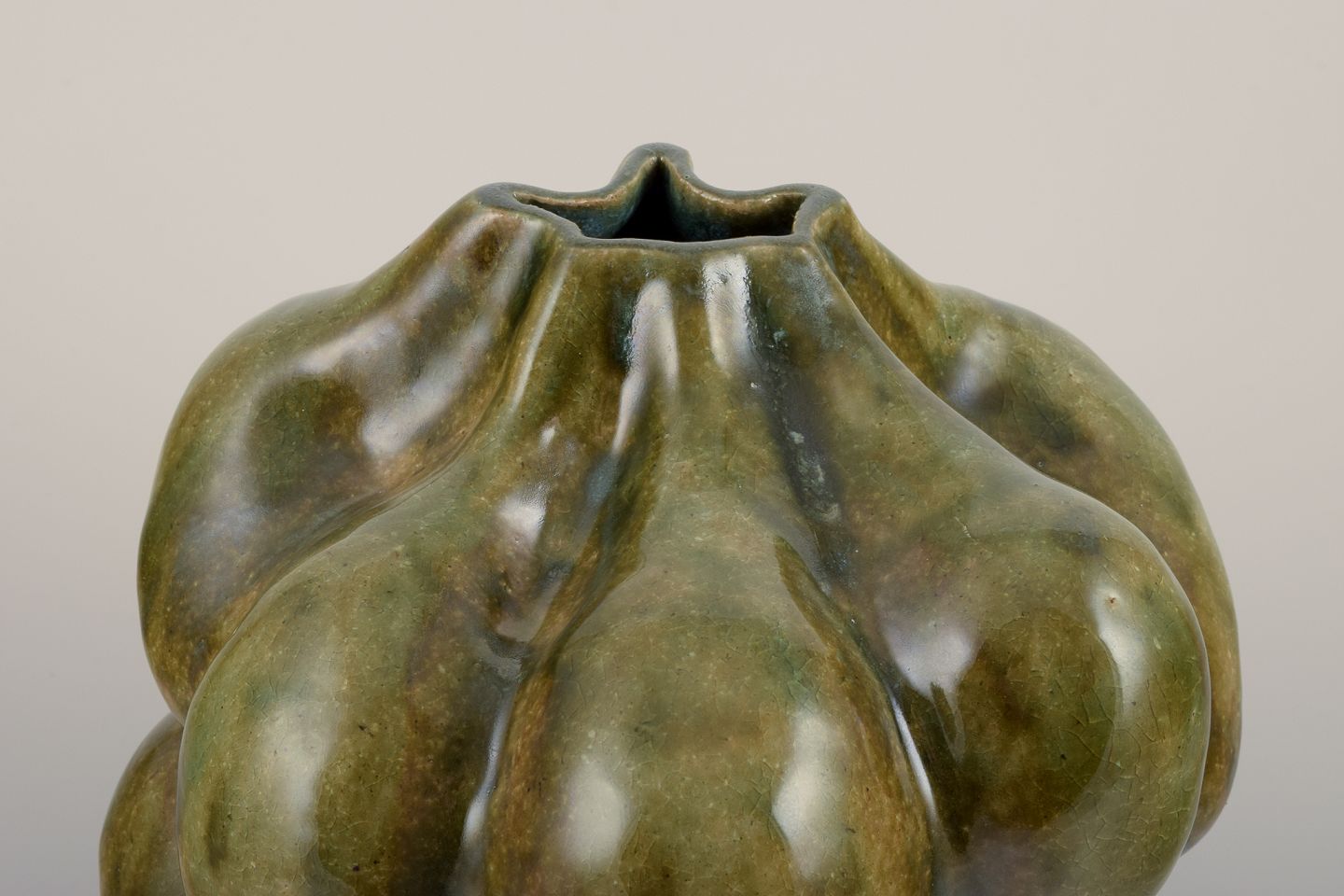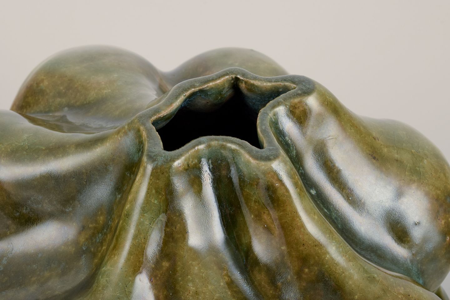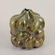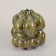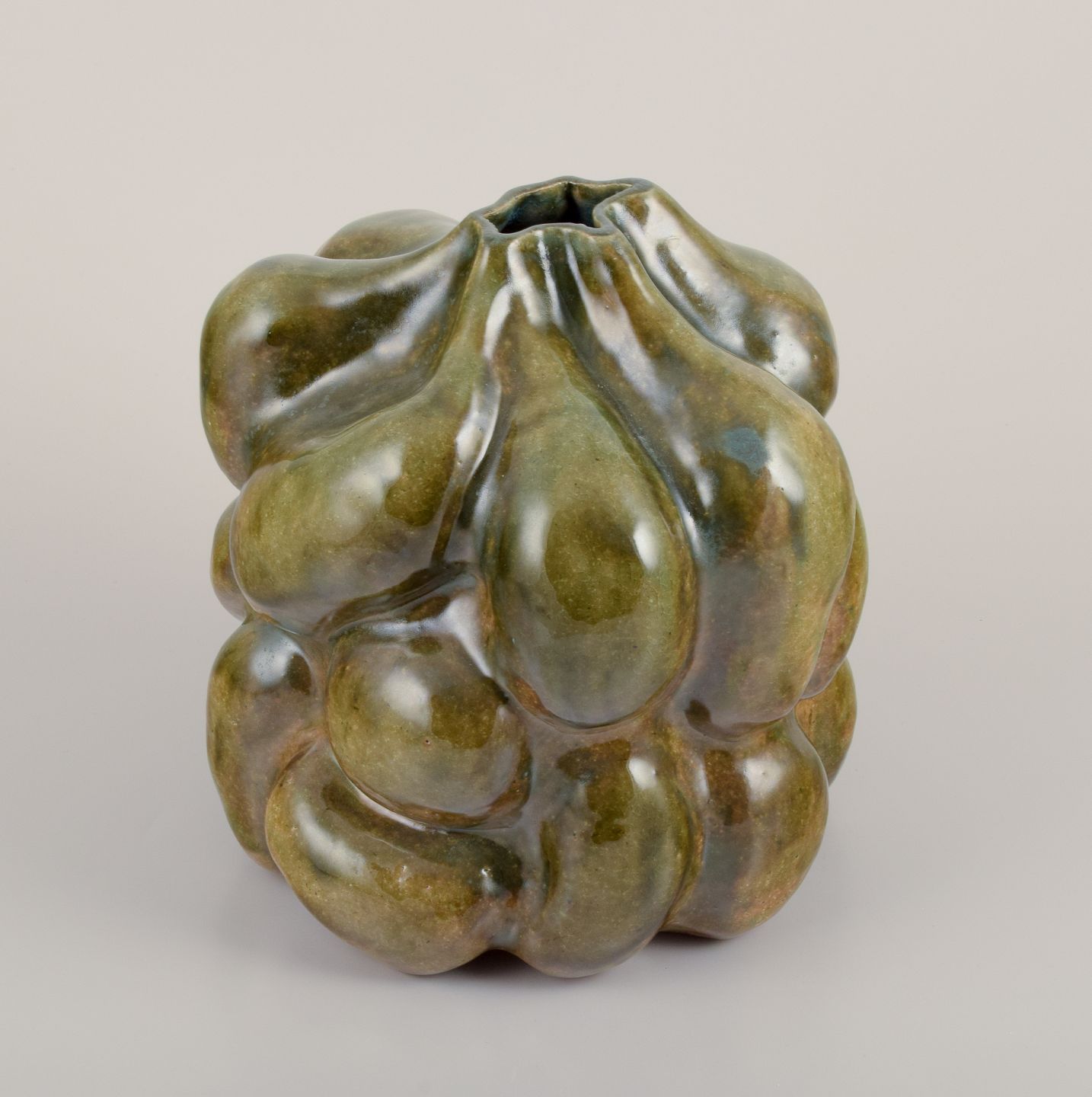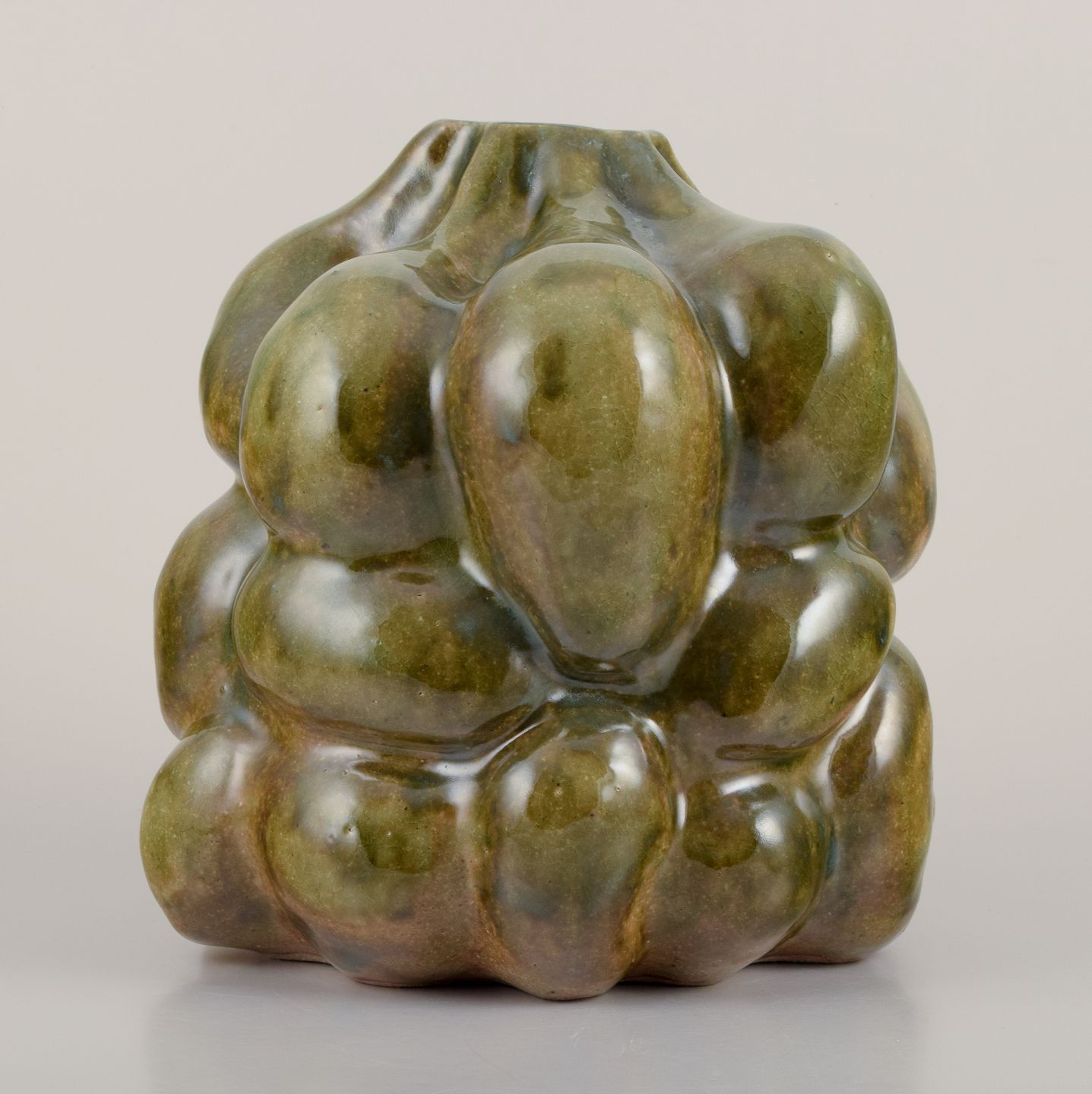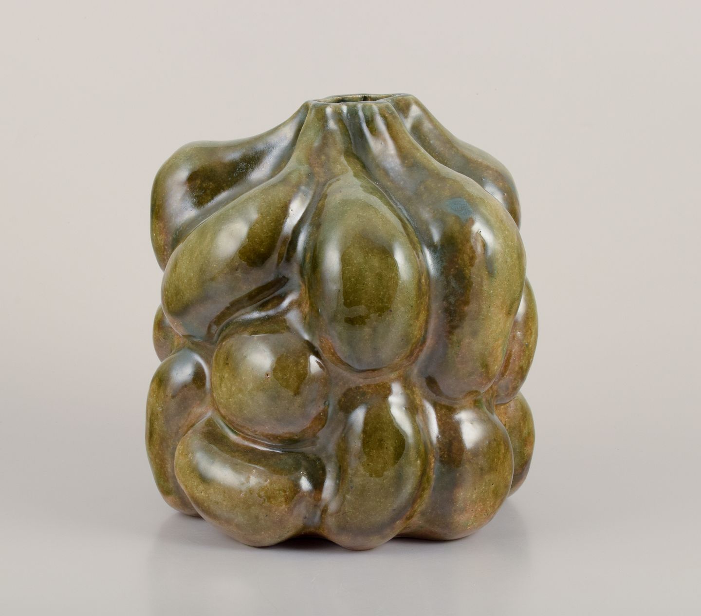 Large, one of a kind sculptural vessel in stoneware clay. Covered in a dark yellowish green clear glaze. The vase is organically shaped in protrusions shaped by the artists hands.