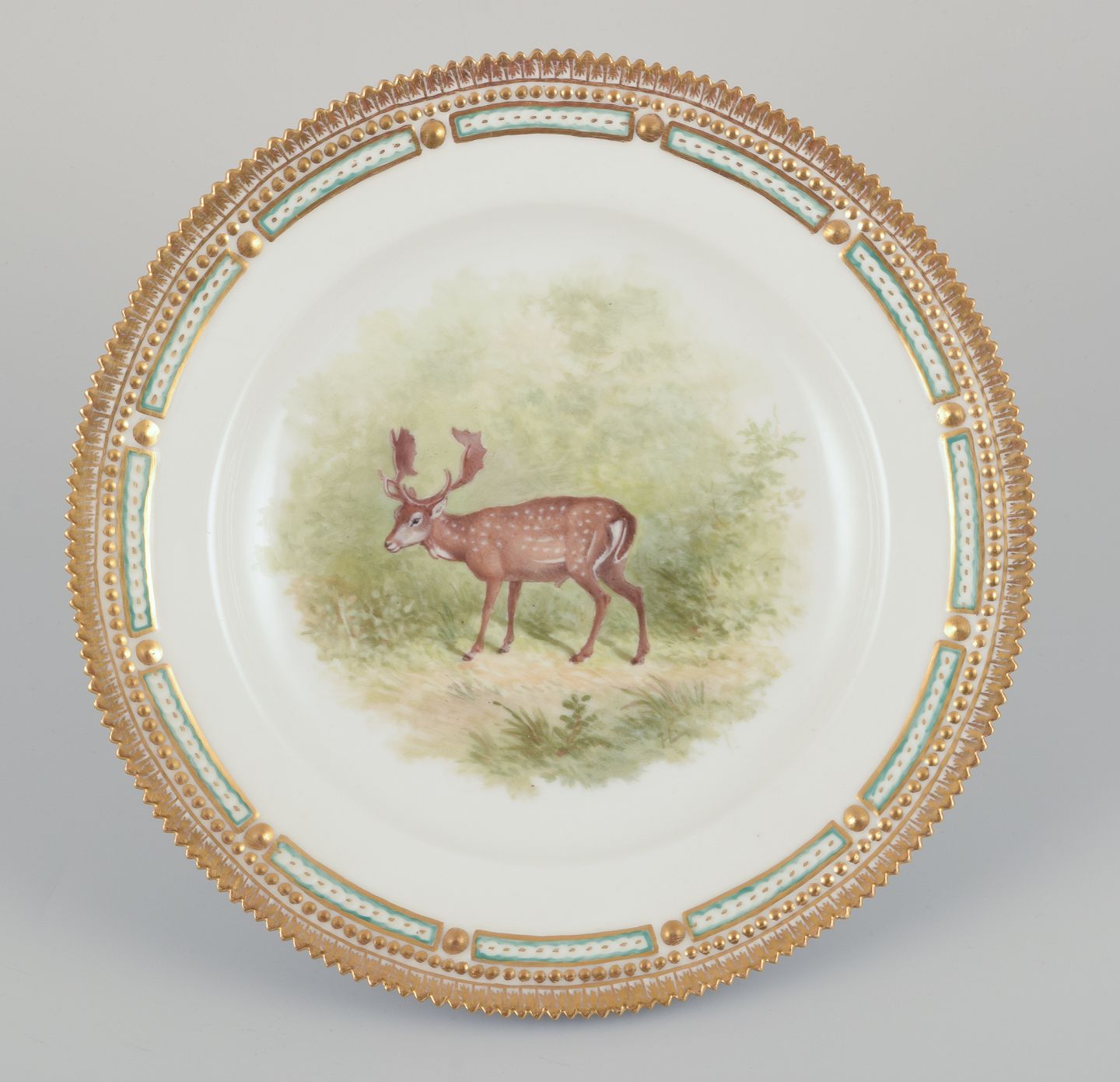 Royal Copenhagen Fauna Danica, hjemmedekoreret middagstallerken med motiv af dådyr. Guldkant. Håndmalet. Datering: 1926 Signeret: HL Perfekt stand. Anden sortering. Mål: D 25,2 cm.