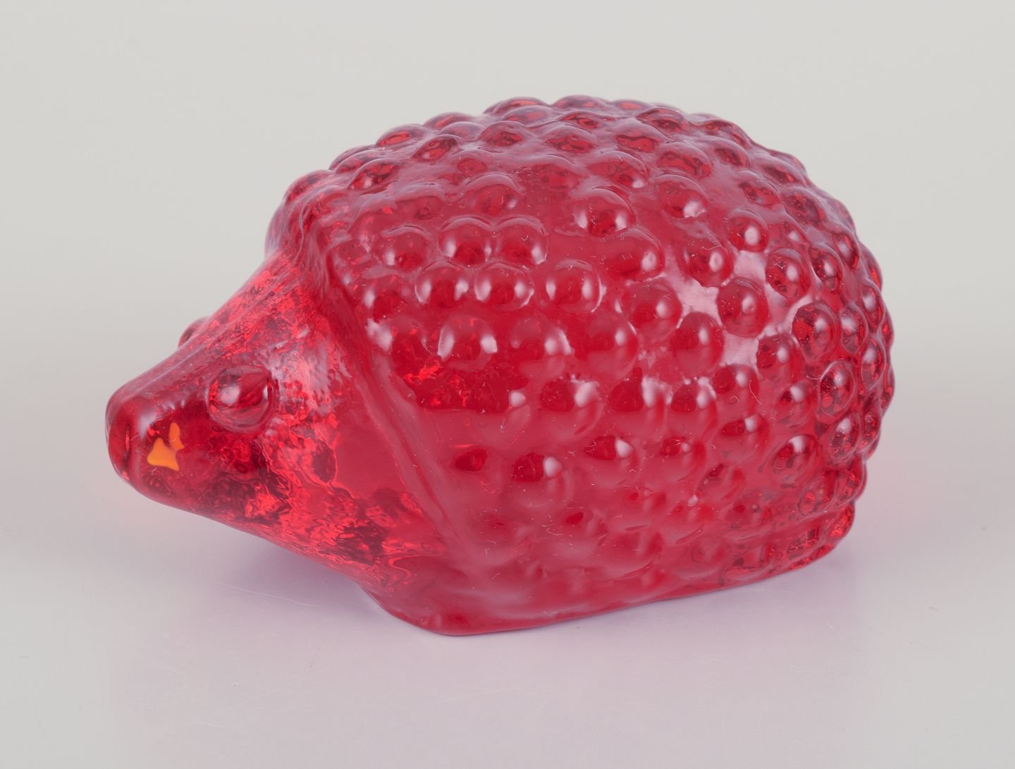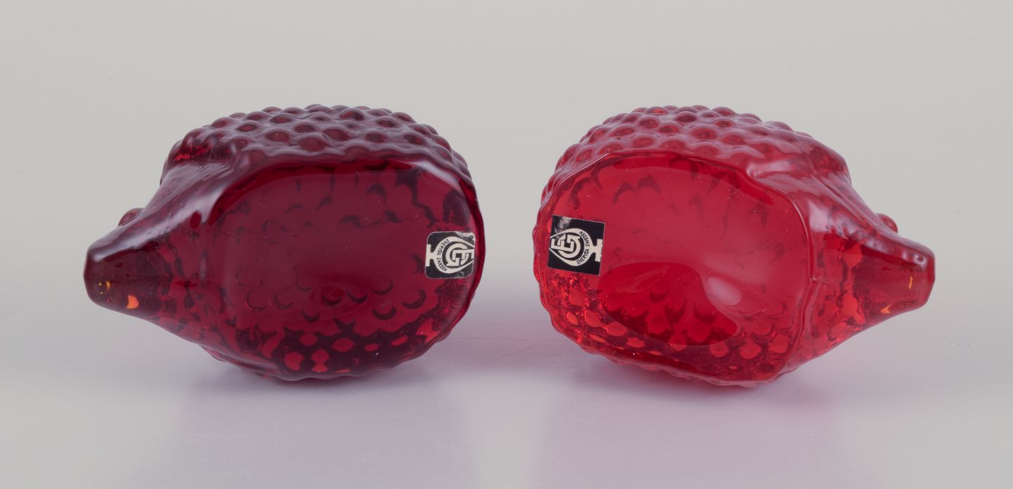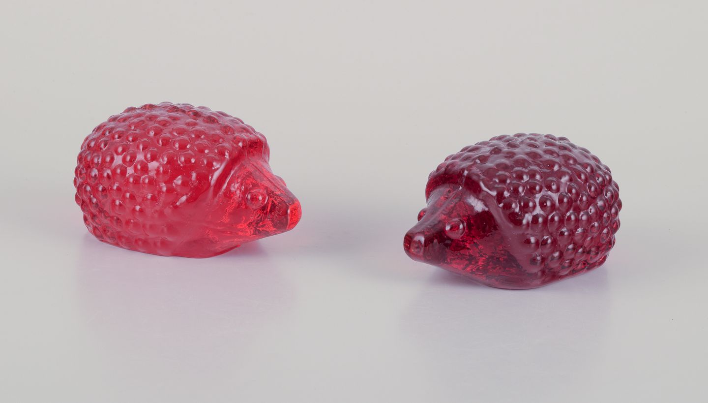 Svensk glaskunstner, Eneryda, Sverige. To pindsvin i to nuancer af rødt kuntglas. Ca. 1970. Mærkat. Perfekt stand. Mål: L 10,0 cm. B 6,0 cm. x H 5,5 cm.