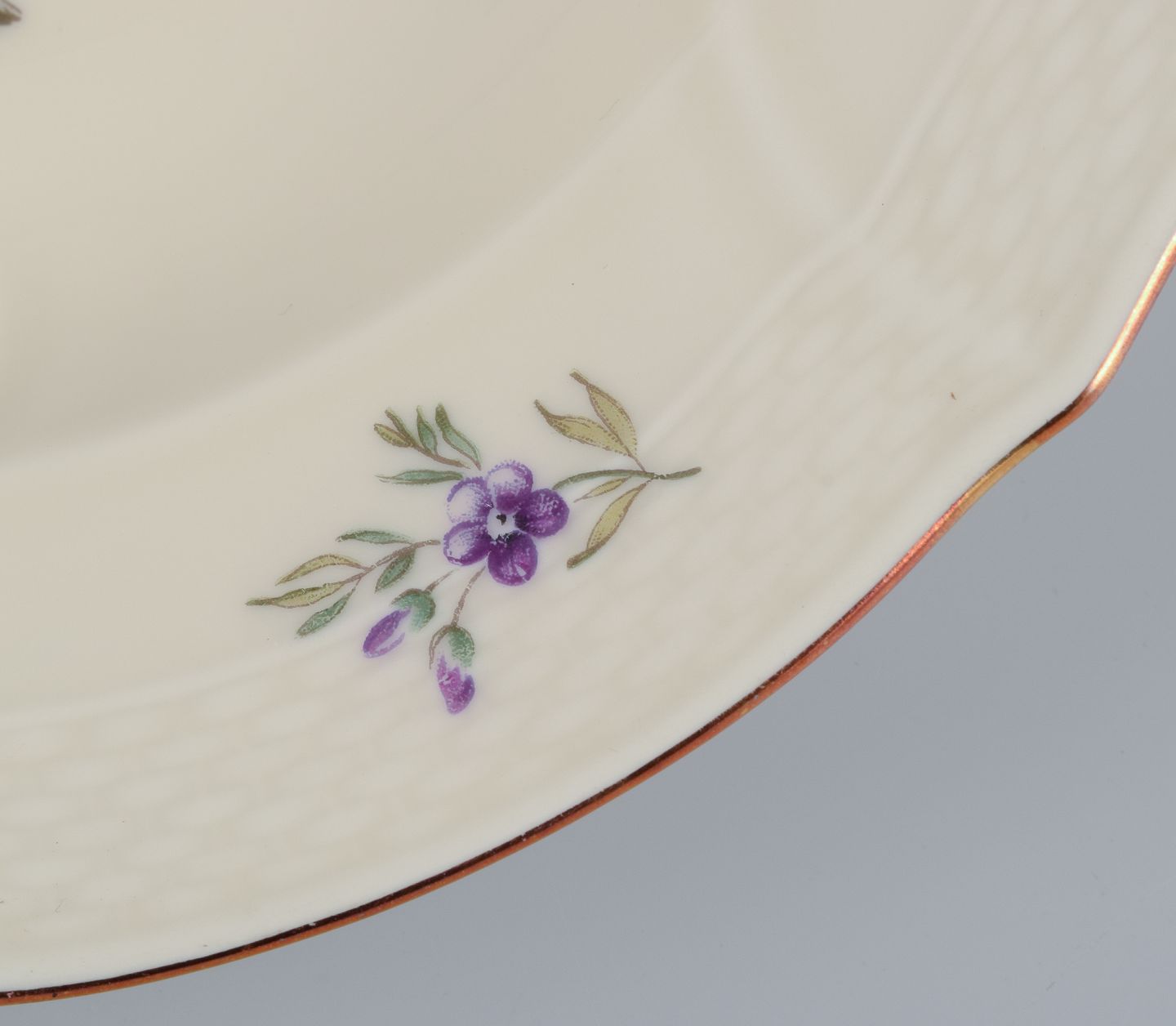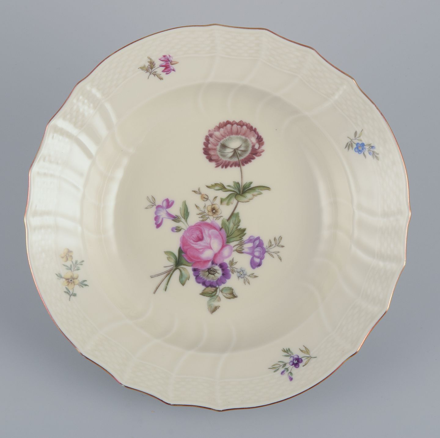 Royal Copenhagen ”Frijsenborg”. Seks dybe tallerkener i håndmalet porcelæn med blomster og guldkant.