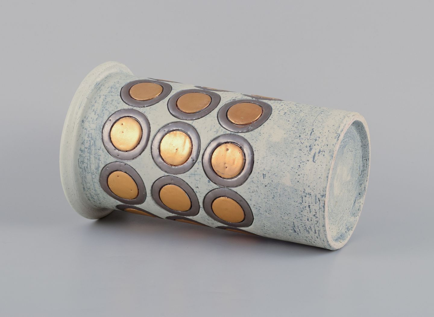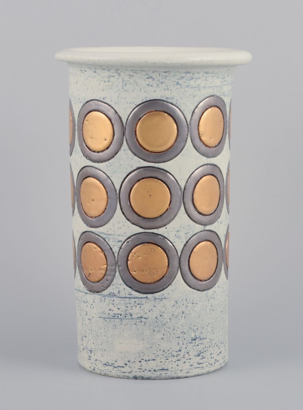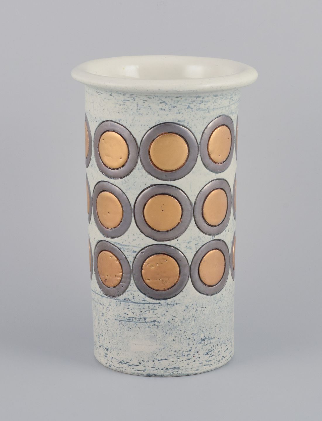 Aldo Londi for Bitossi, Italien, stor ”Ikano” keramikvase i retrostil. Grå glasur. Designet med cirkler dekoreret i sølv og guld. 1970’erne. I perfekt stand. Mål: H 21,5 cm. x D 13,0 cm.