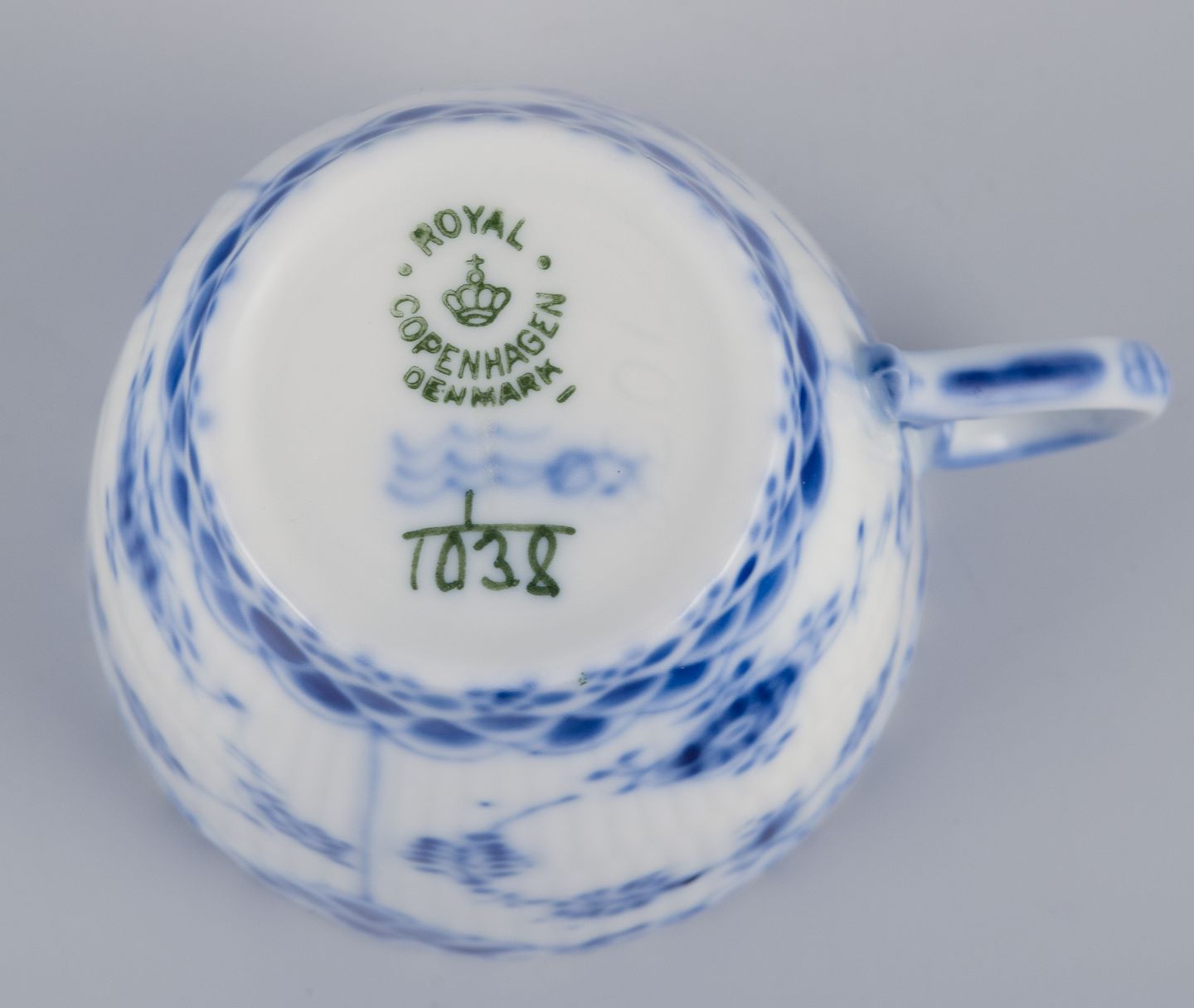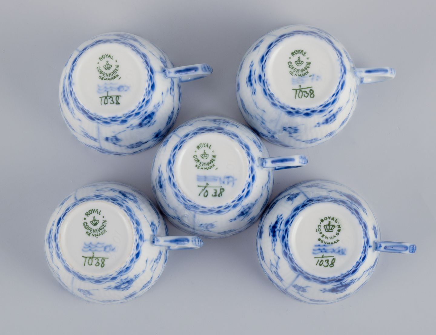 Royal Copenhagen Musselmalet Helblonde, fem mokkakopper og underkopper.