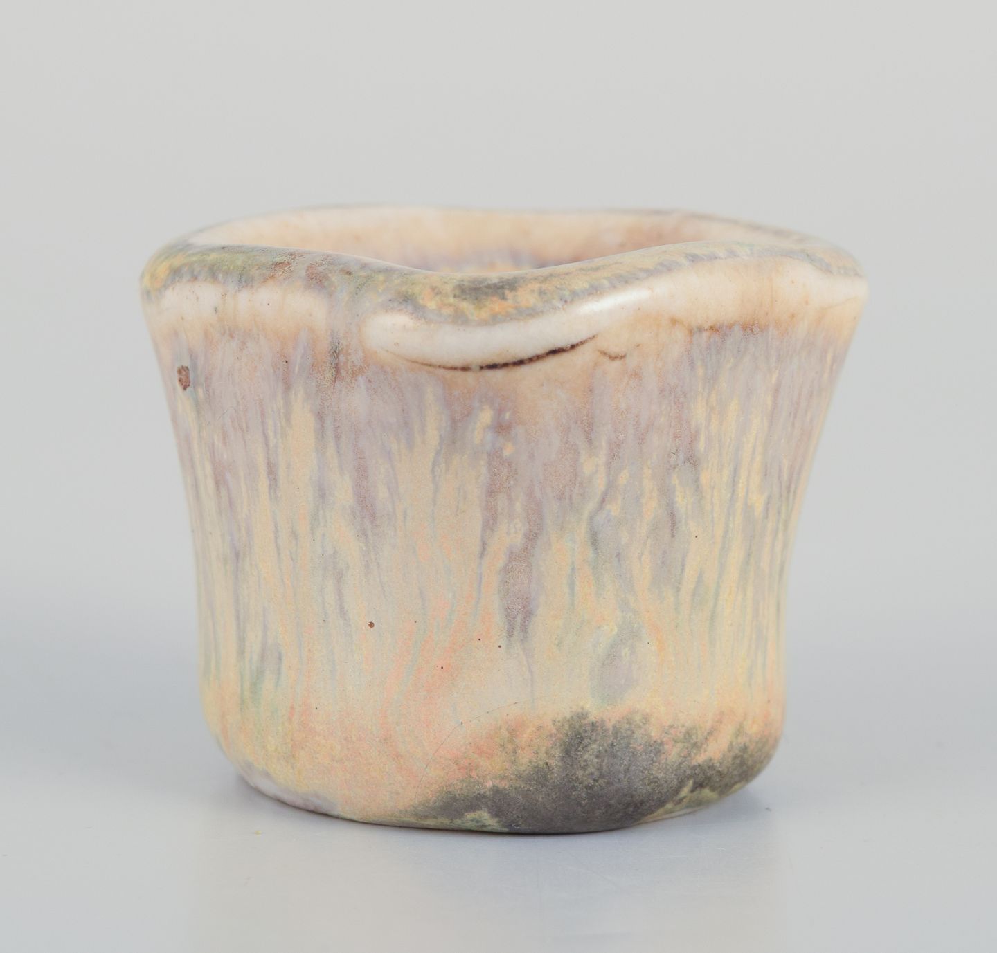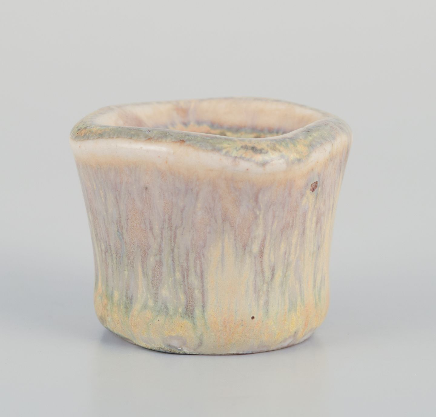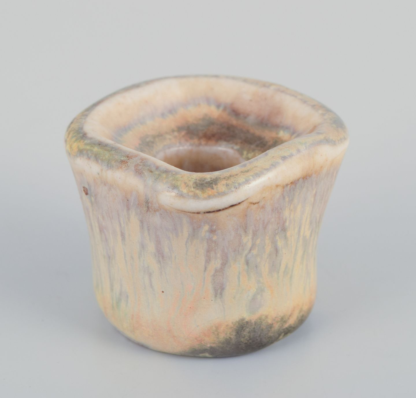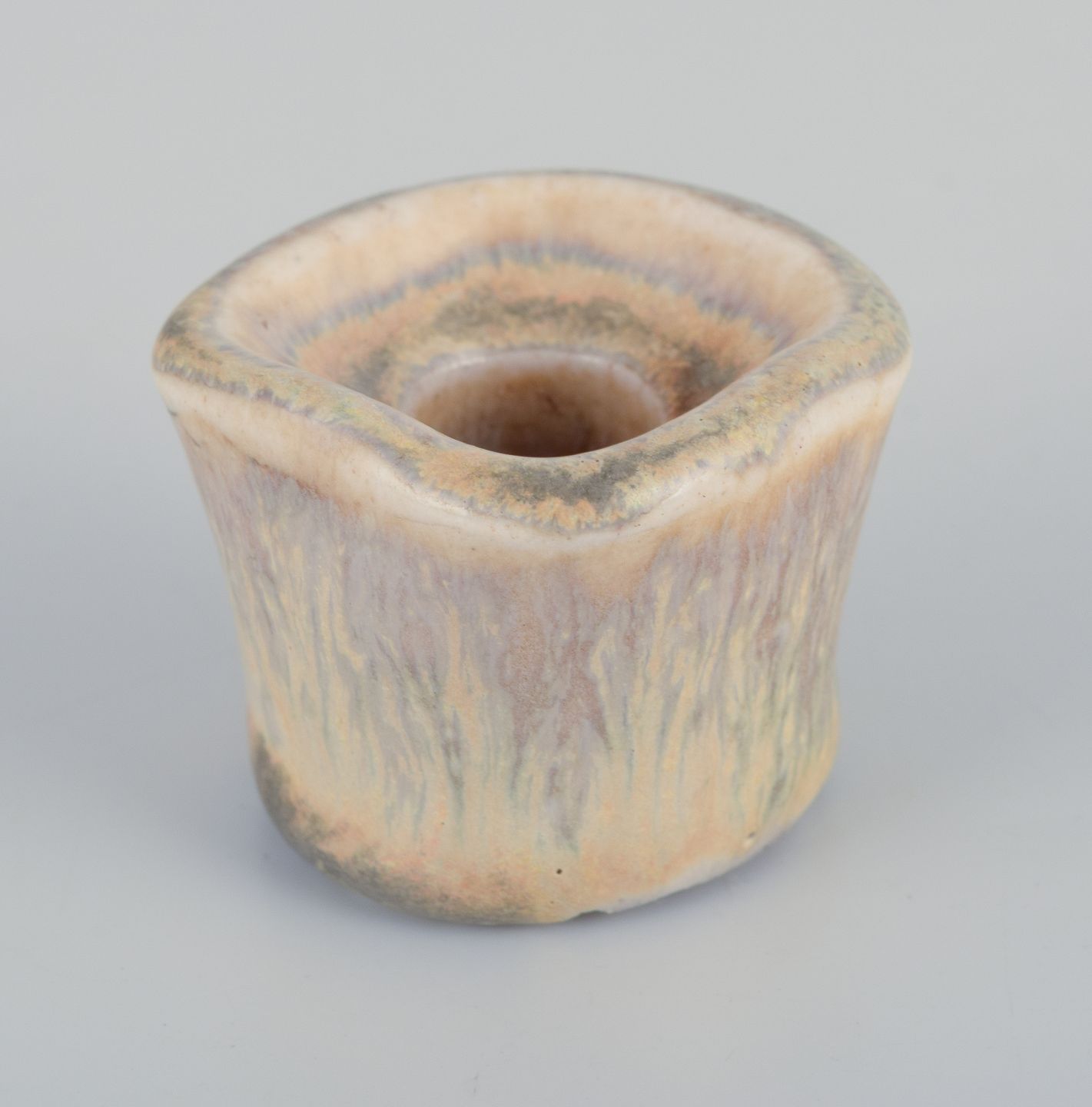 Lille lysestage i keramik. Glasur i gule og sandfarvede toner.