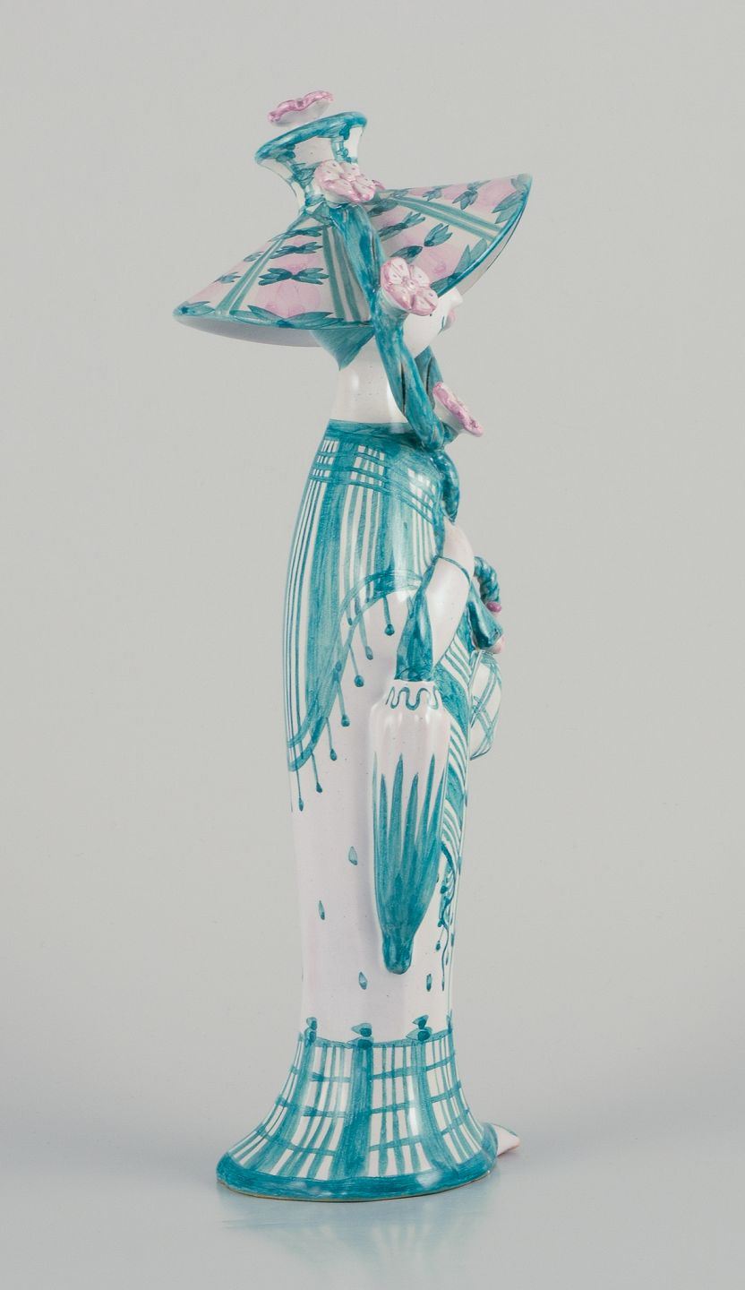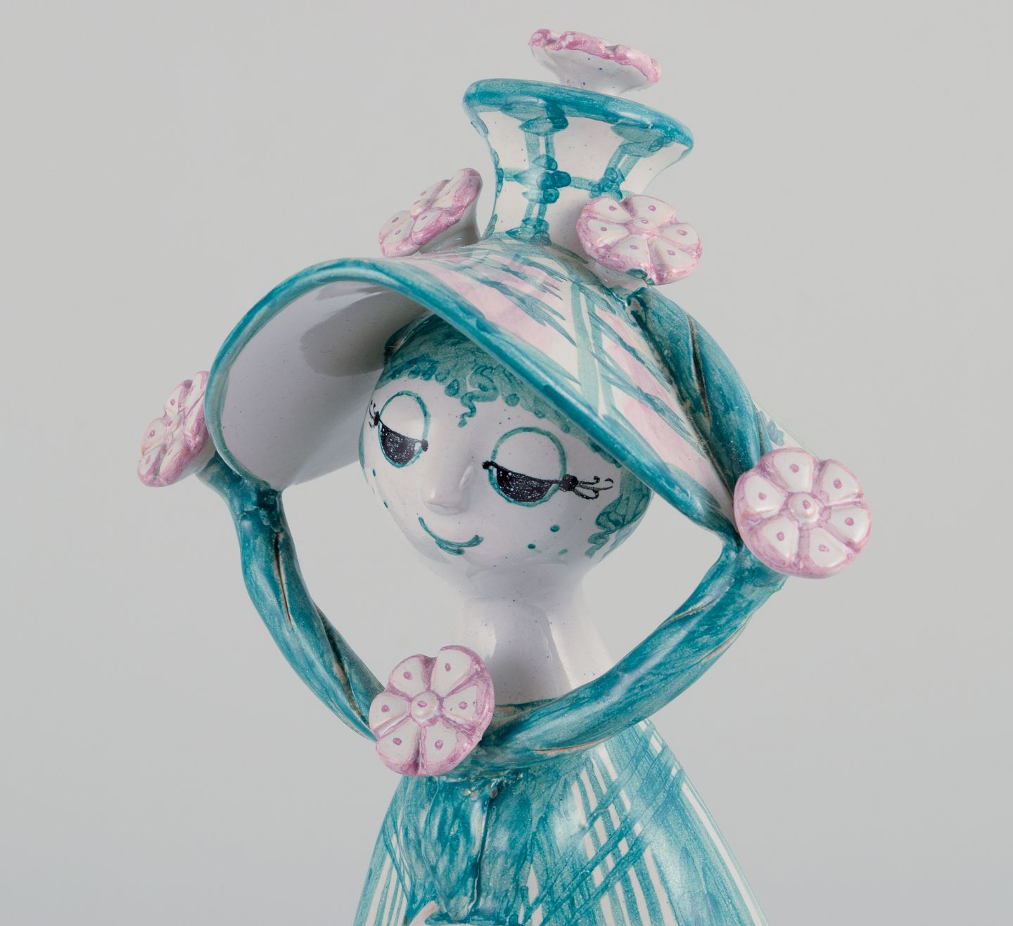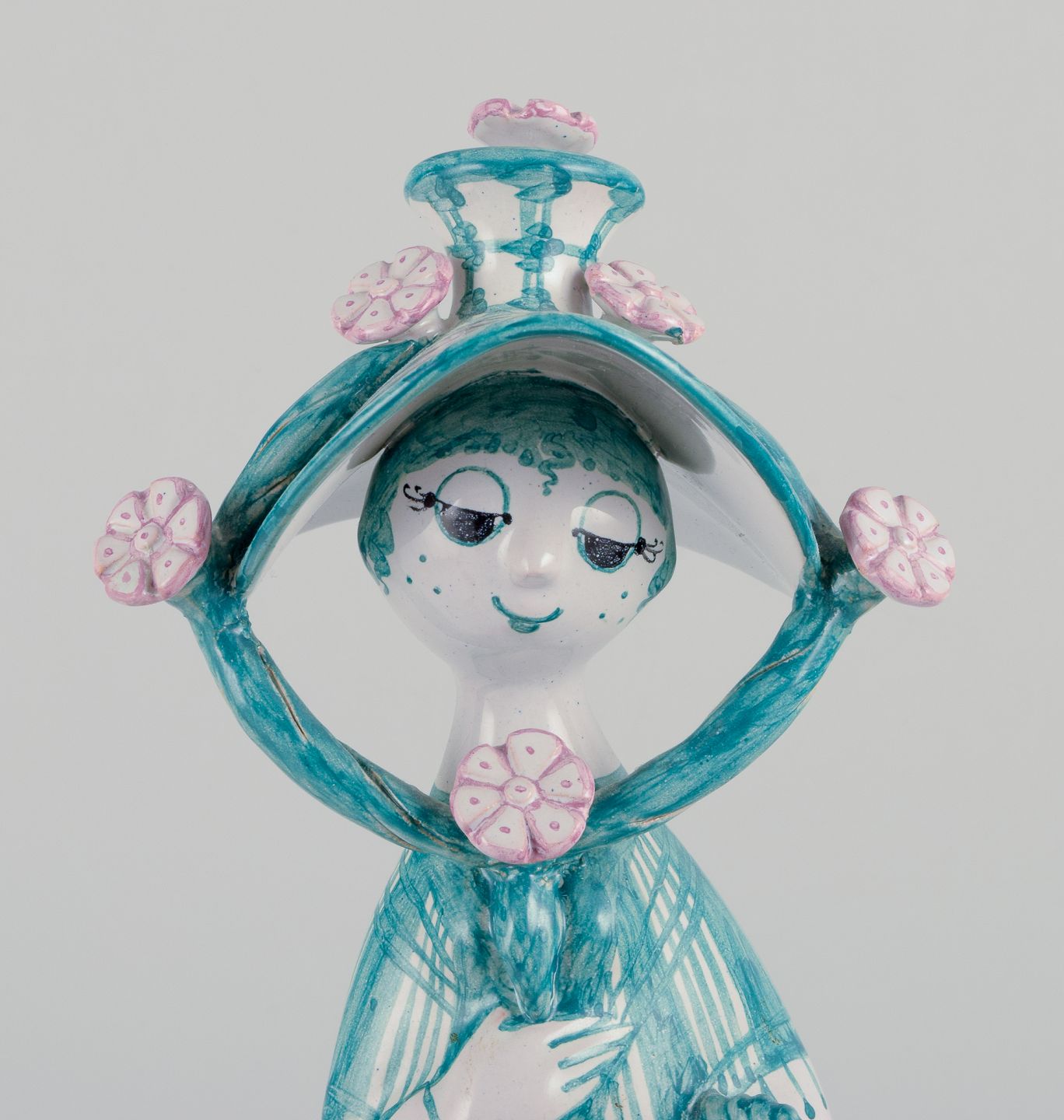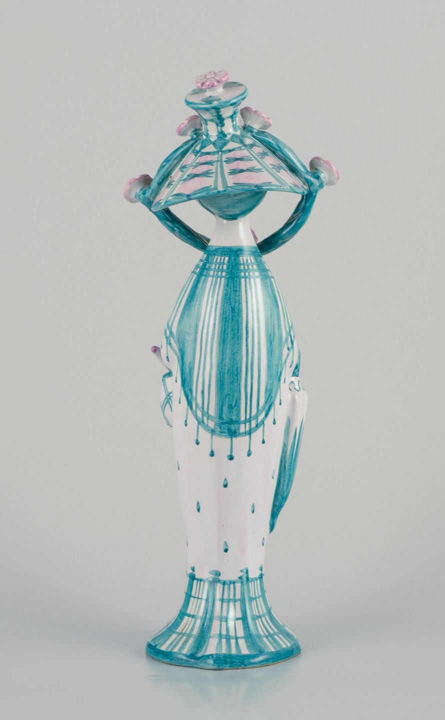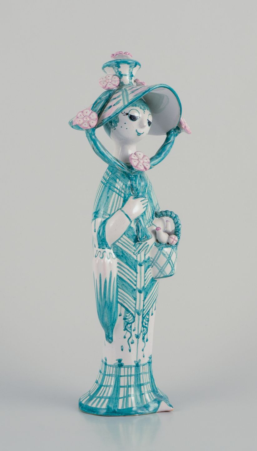 Bjørn Wiinblad (1918-2006) unik figur i keramik. "Efterår" dekoreret med grøn og rosa glasur på lysegrå base. Fra "Årstiderne".