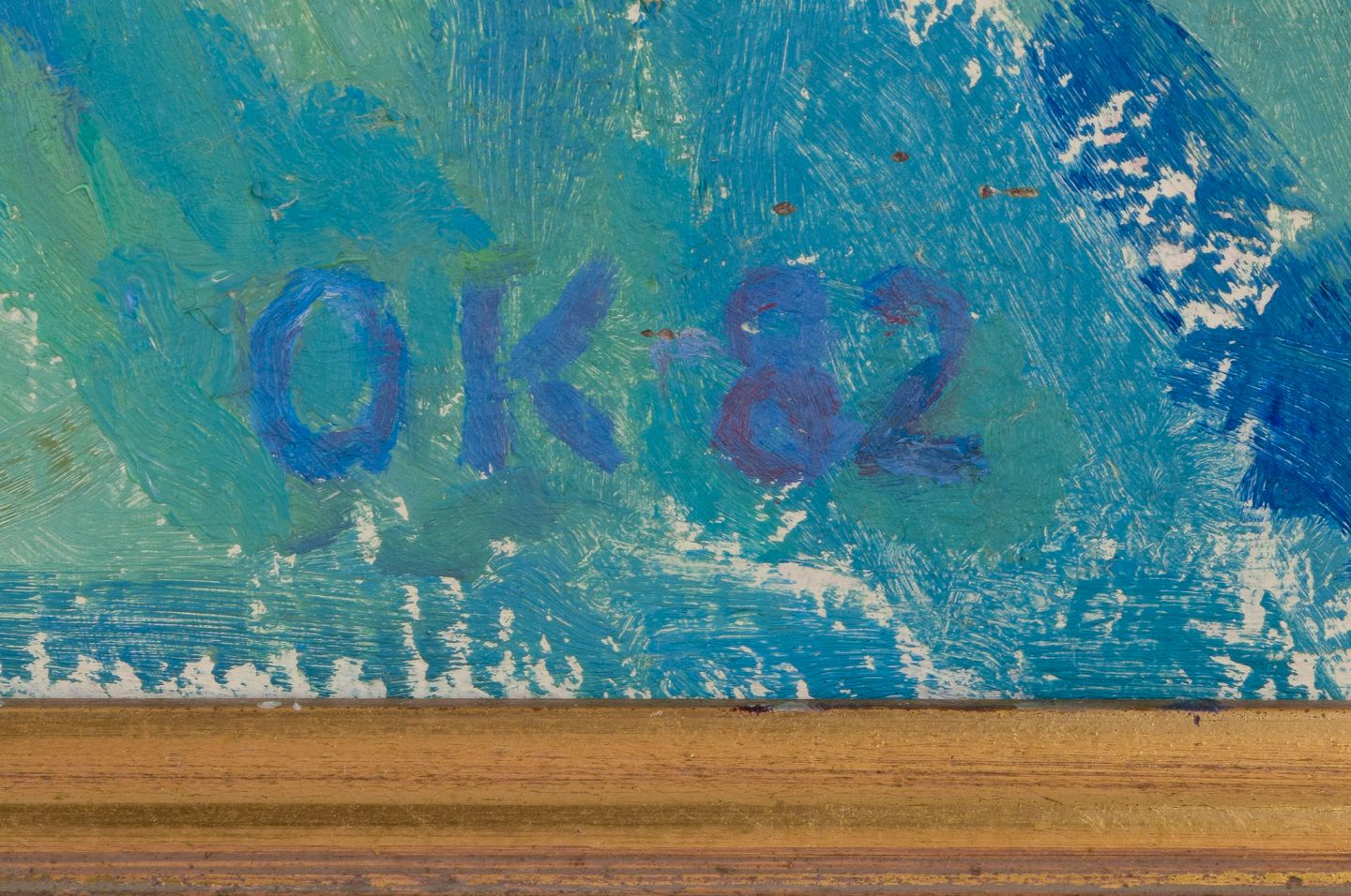 Ole Kielberg (1911-1985), dansk maler. Olie på lærred. Blomsteropstilling. Modernistisk stil. Signeret OK 82. Flot stand. Mål: 64,0 cm. x 53,0 cm. Totalmål: 78,0 cm. x 67,0 cm.