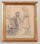 Blyantstegning. Dobbeltportræt af rygvendte piger i interiør.