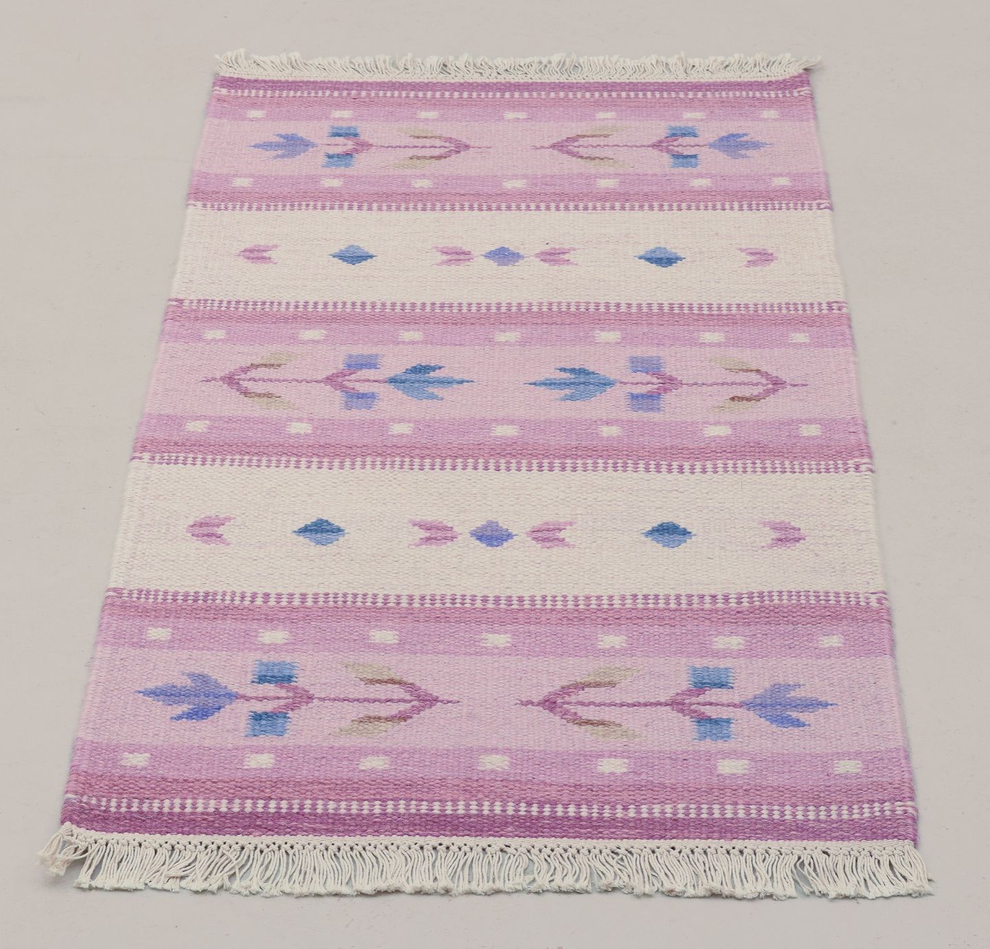 Svensk tekstildesigner. Håndvævet tæppe i ren uld. Rölakan-teknik. Blomstermotiver. Lyserøde og blå farver. Midt 1900-tallet. I flot stand med minimalt brugspræg. Mål: 138 cm. x 66 cm.