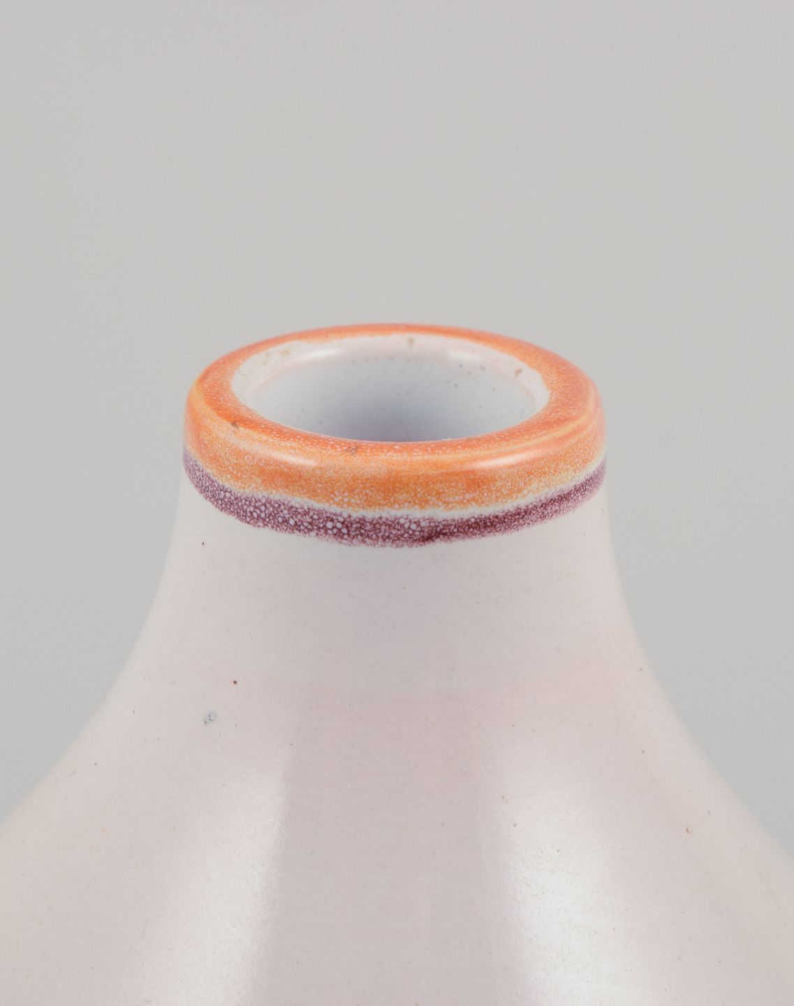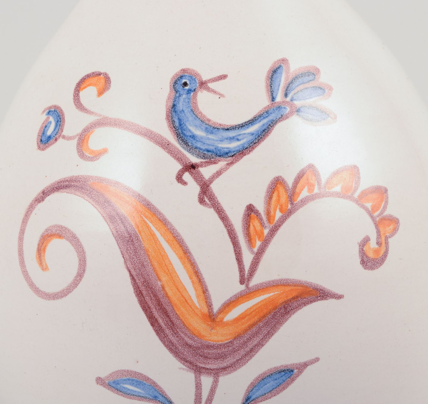 Gertrud Kudielka for Hjort, Bornholm. Unika keramikvase. Motiv af fugl på gren. Hvidglaseret håndmalet stentøj. Midt 1900-tallet. Stemplet. I perfekt stand. Mål: H 13,0 cm. x D 9,0 cm.