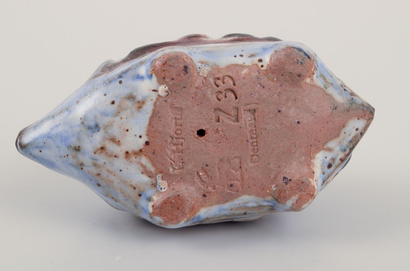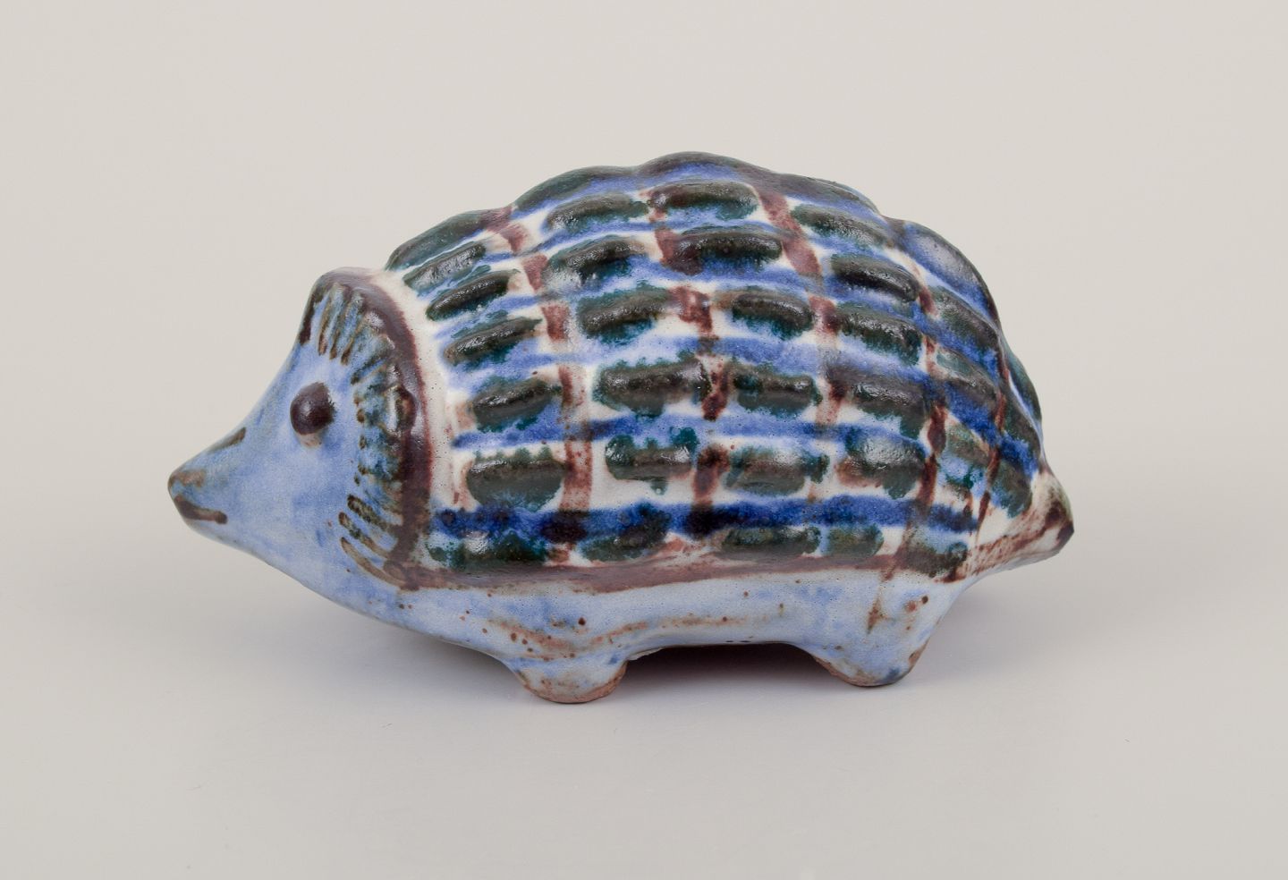 Hjorth, Bornholm. Pindsvineunge i stentøj. Glasur i blålige nuancer. Ca. 1960’erne. Stemplet. Perfekt stand. Mål: L 8,0 cm. x B 4,5 cm. x H 4,0 cm.