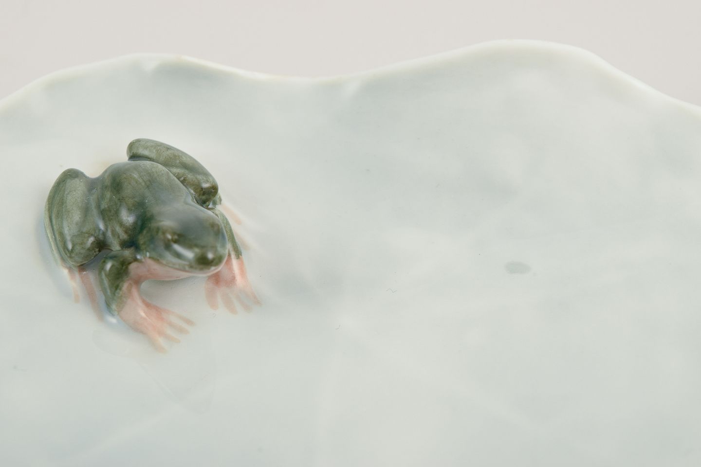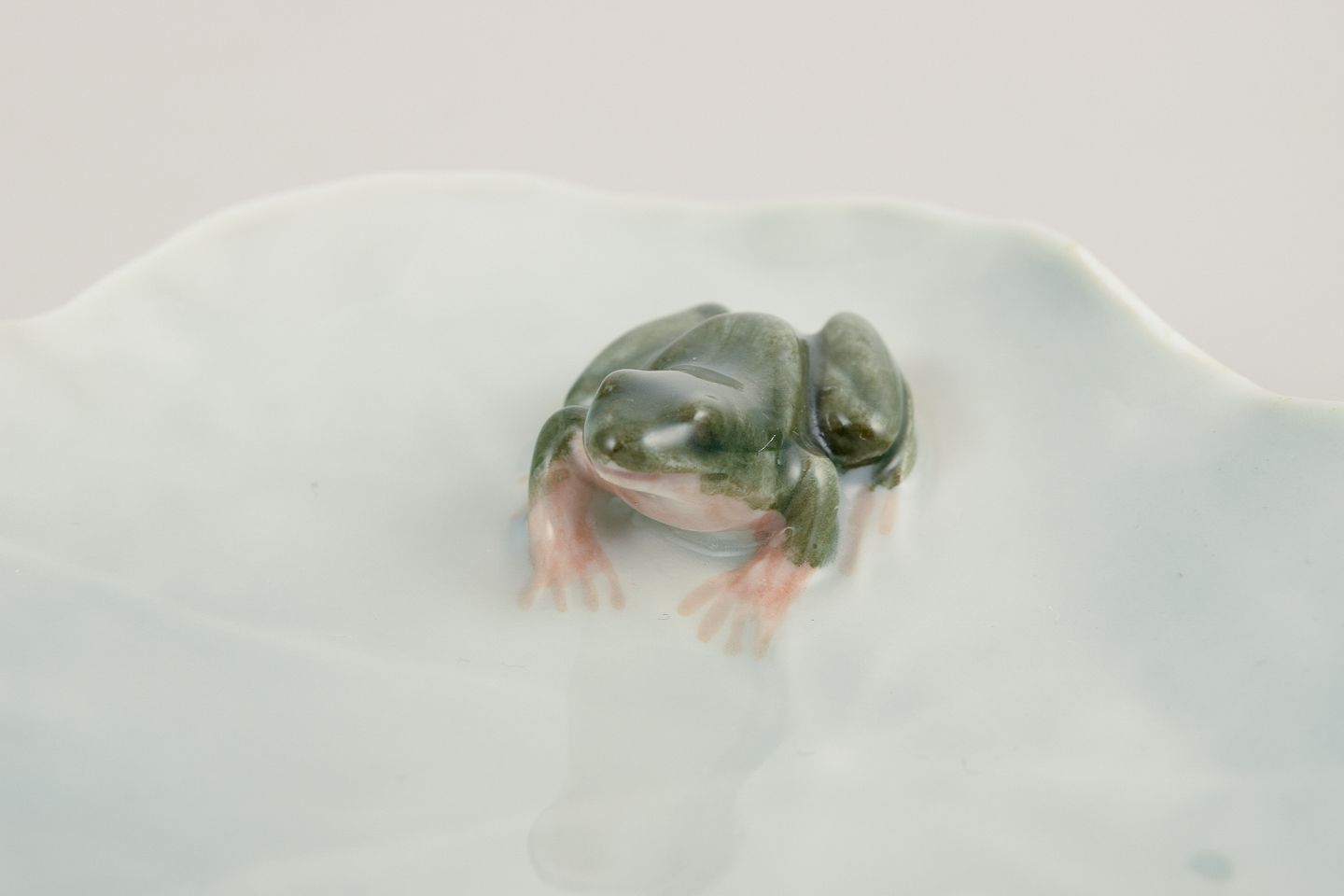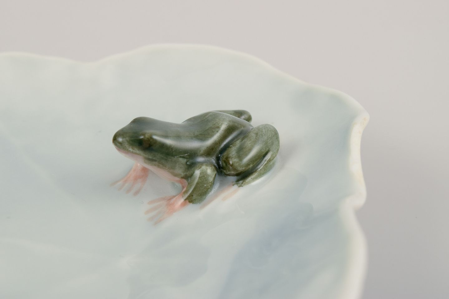 Royal Copenhagen, lille Art Nouveau fad med frø. Datering: 1969-1974. Modelnummer: 2477. I perfekt stand. Anden sortering. Mål: D 10,7 cm. x H 2,0 cm.