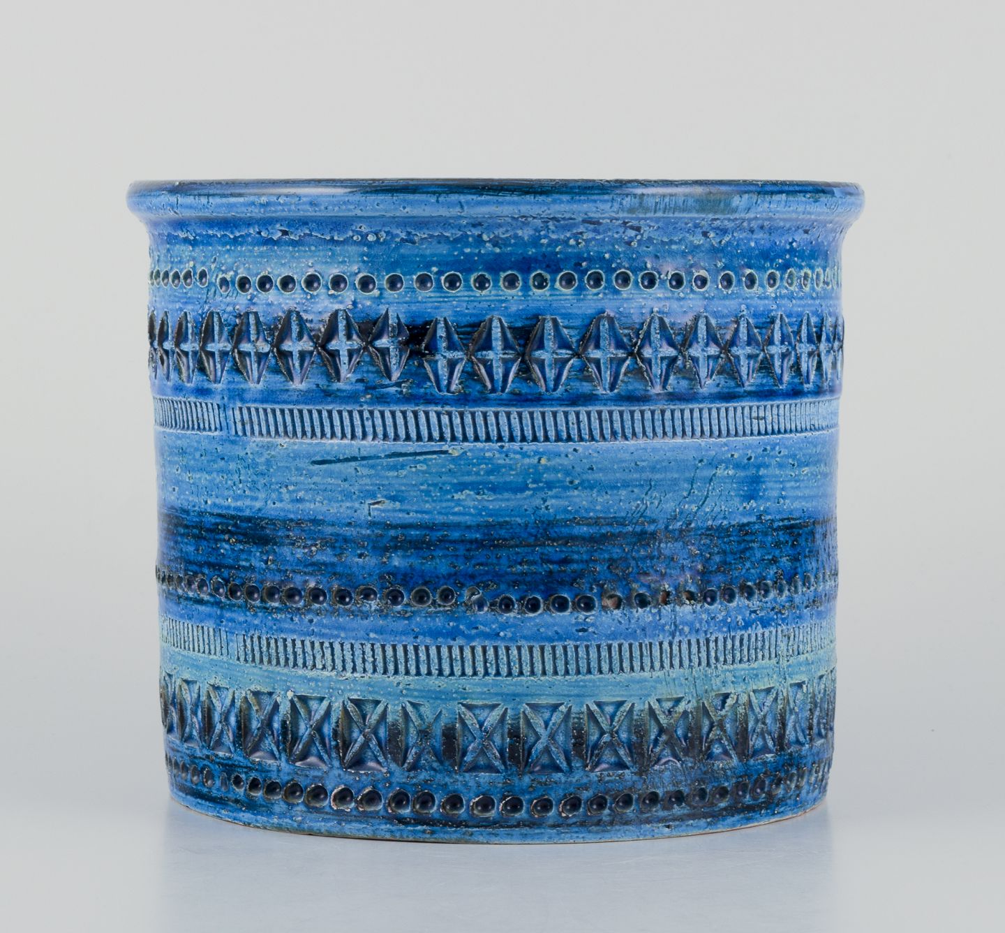 Aldo Londi for Bitossi. Stor urtepotteskjuler i Rimini-blå glaseret keramik med geometriske mønstre. 1960'erne. I flot stand. Stemplet. Måler: D 17,0 cm. x H 14,5 cm.
