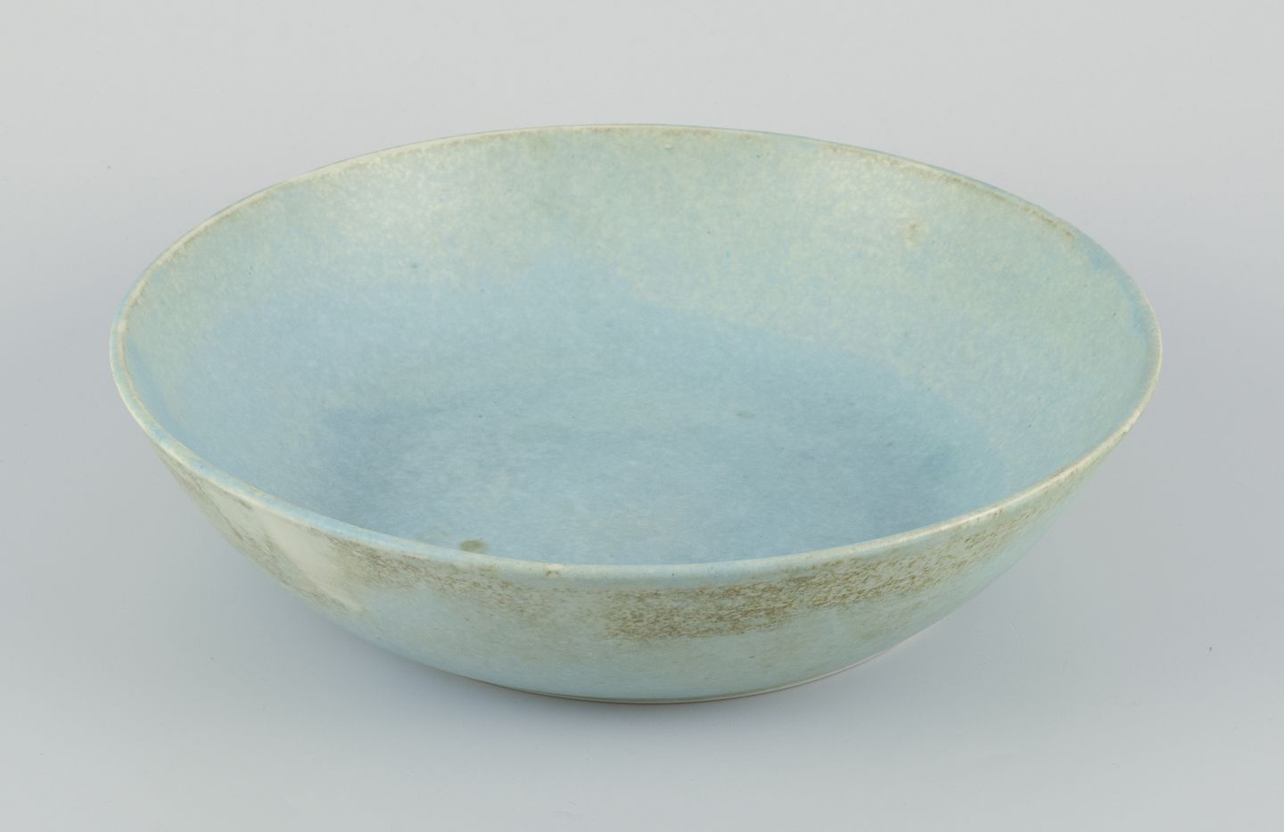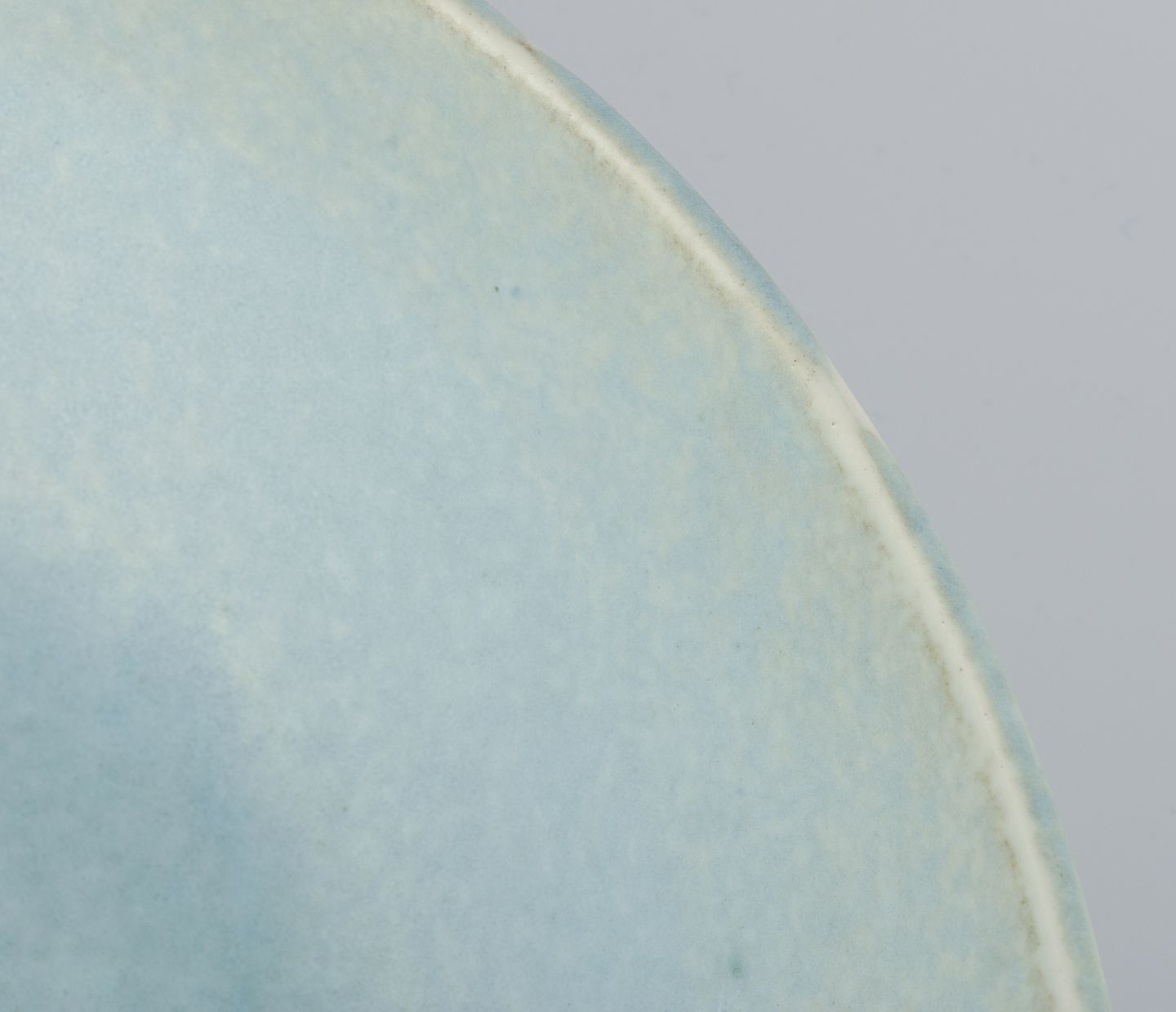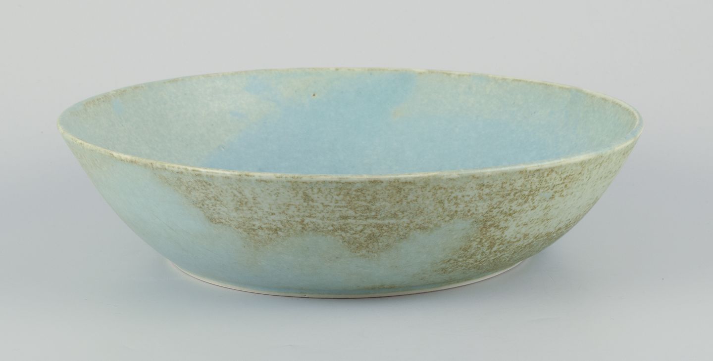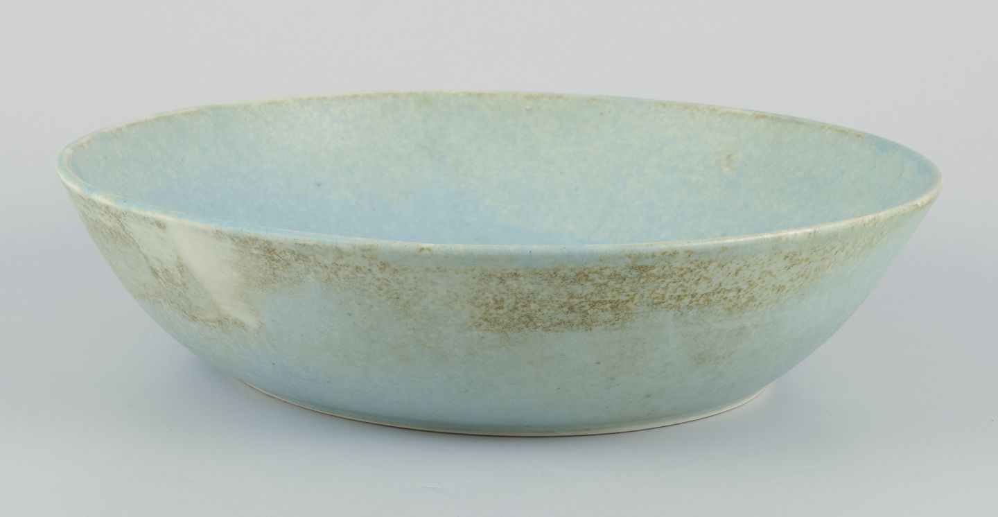 Europæisk studiokeramiker. Meget stor skål. Unika. Glasur i lyseblå og sandfarvede toner. Datering: Ca. 1980’erne. Utydelig kunstnersignatur. I perfekt stand. Mål: D 29,5 cm. x H 7,0 cm.