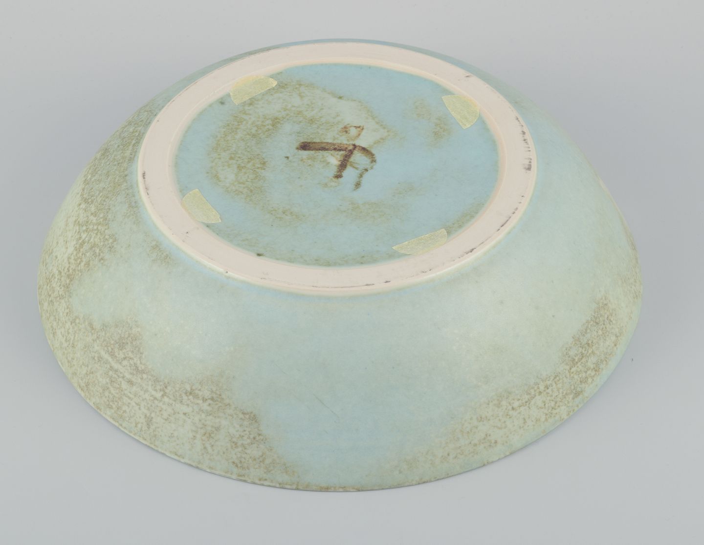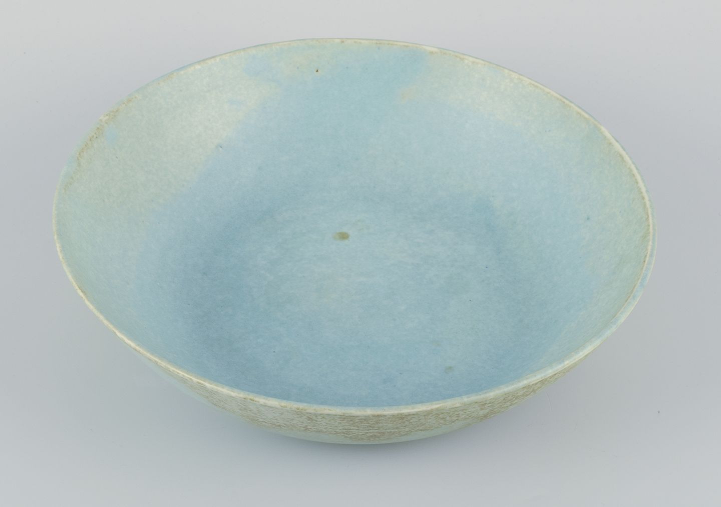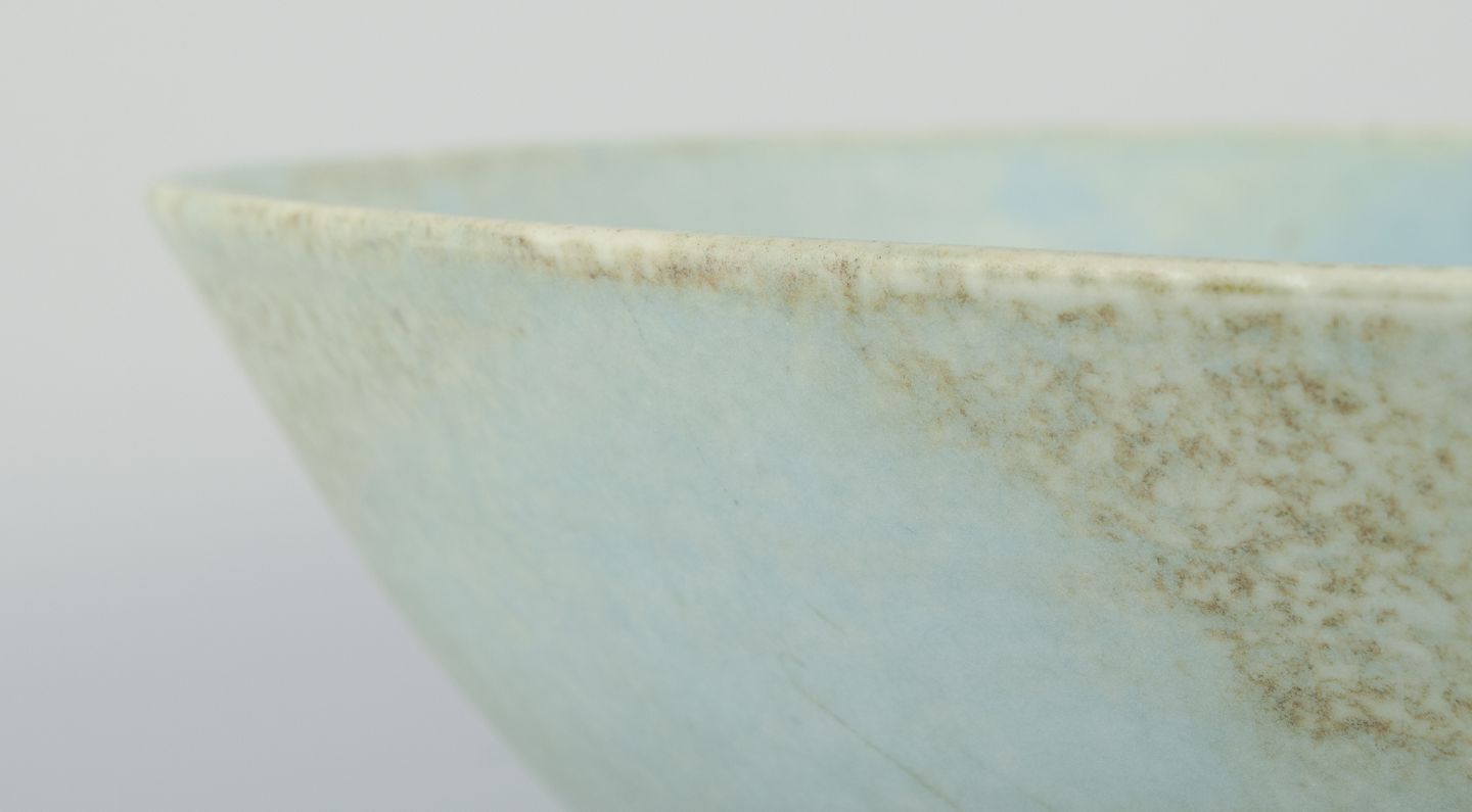 Europæisk studiokeramiker. Meget stor skål. Unika. Glasur i lyseblå og sandfarvede toner. Datering: Ca. 1980’erne. Utydelig kunstnersignatur. I perfekt stand. Mål: D 29,5 cm. x H 7,0 cm.