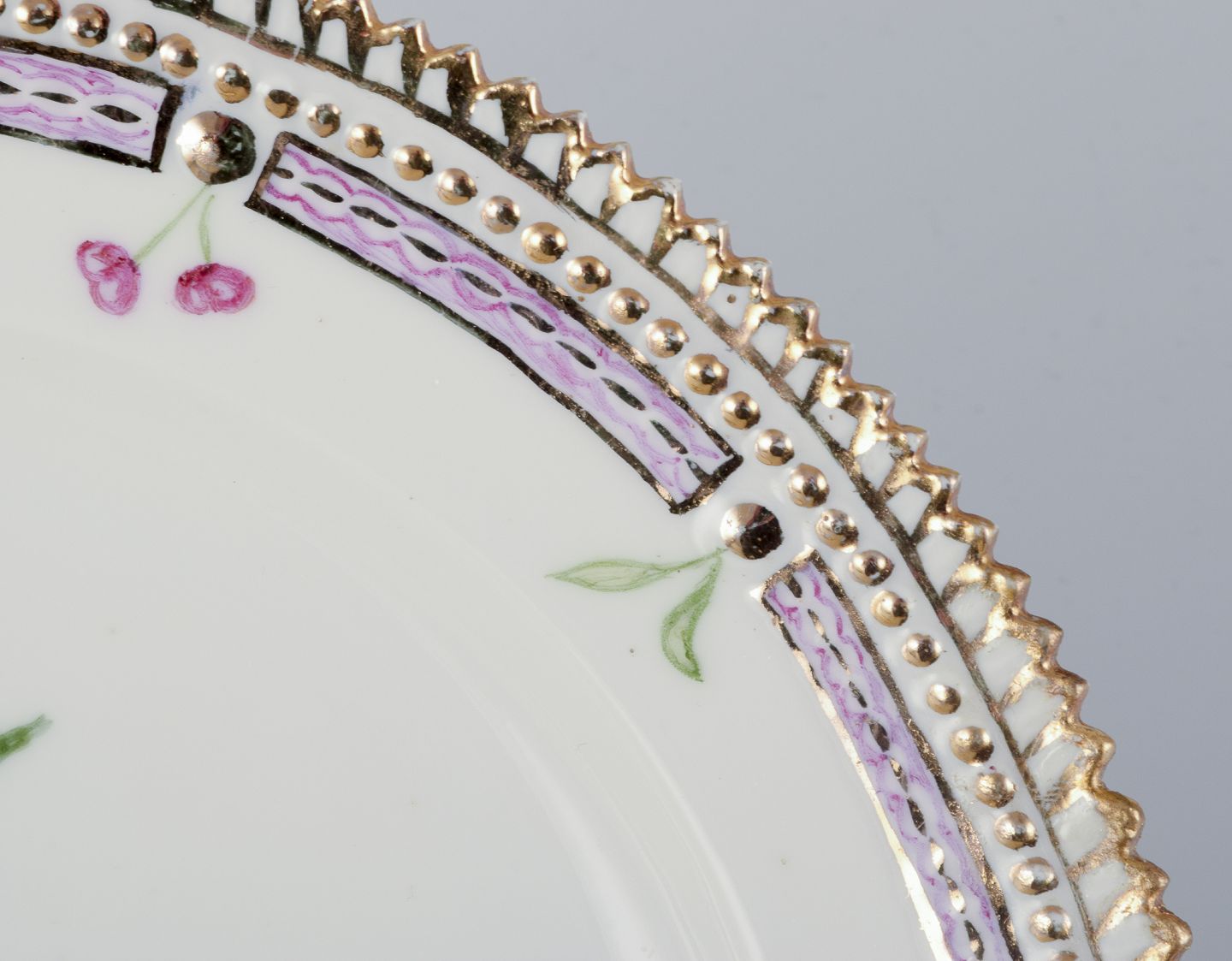 Royal Copenhagen Flora Danica. Frokosttallerken i håndmalet porcelæn med blomster og gulddekoration.
