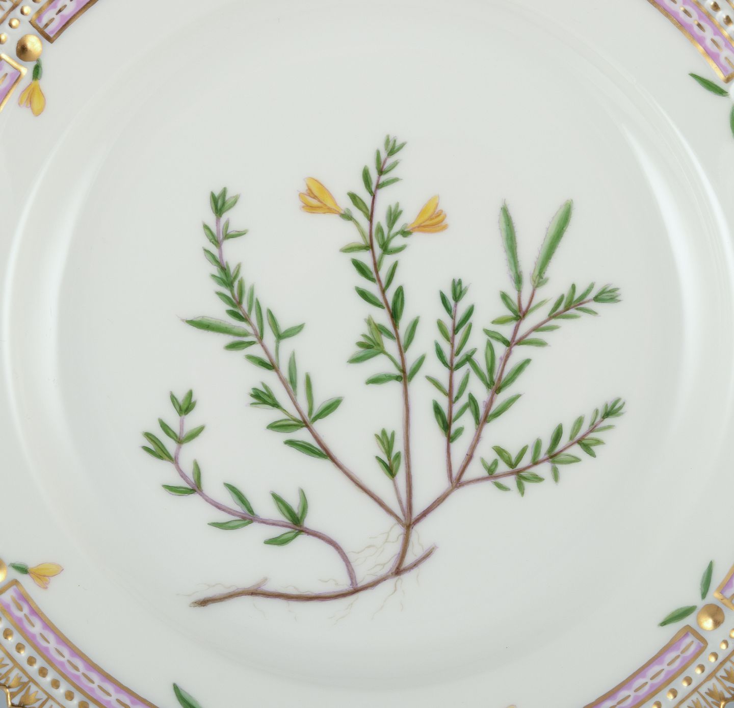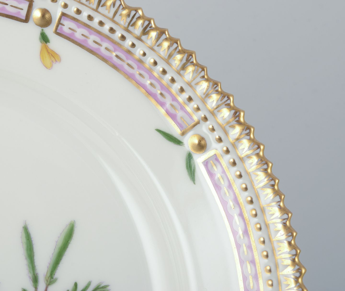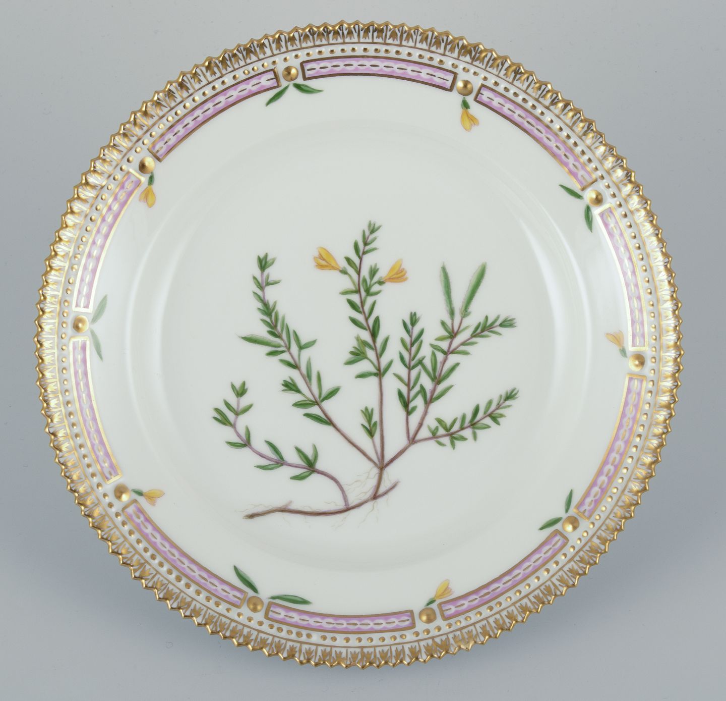 Royal Copenhagen Flora Danica tallerken i håndmalet porcelæn med blomster og gulddekoration.