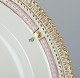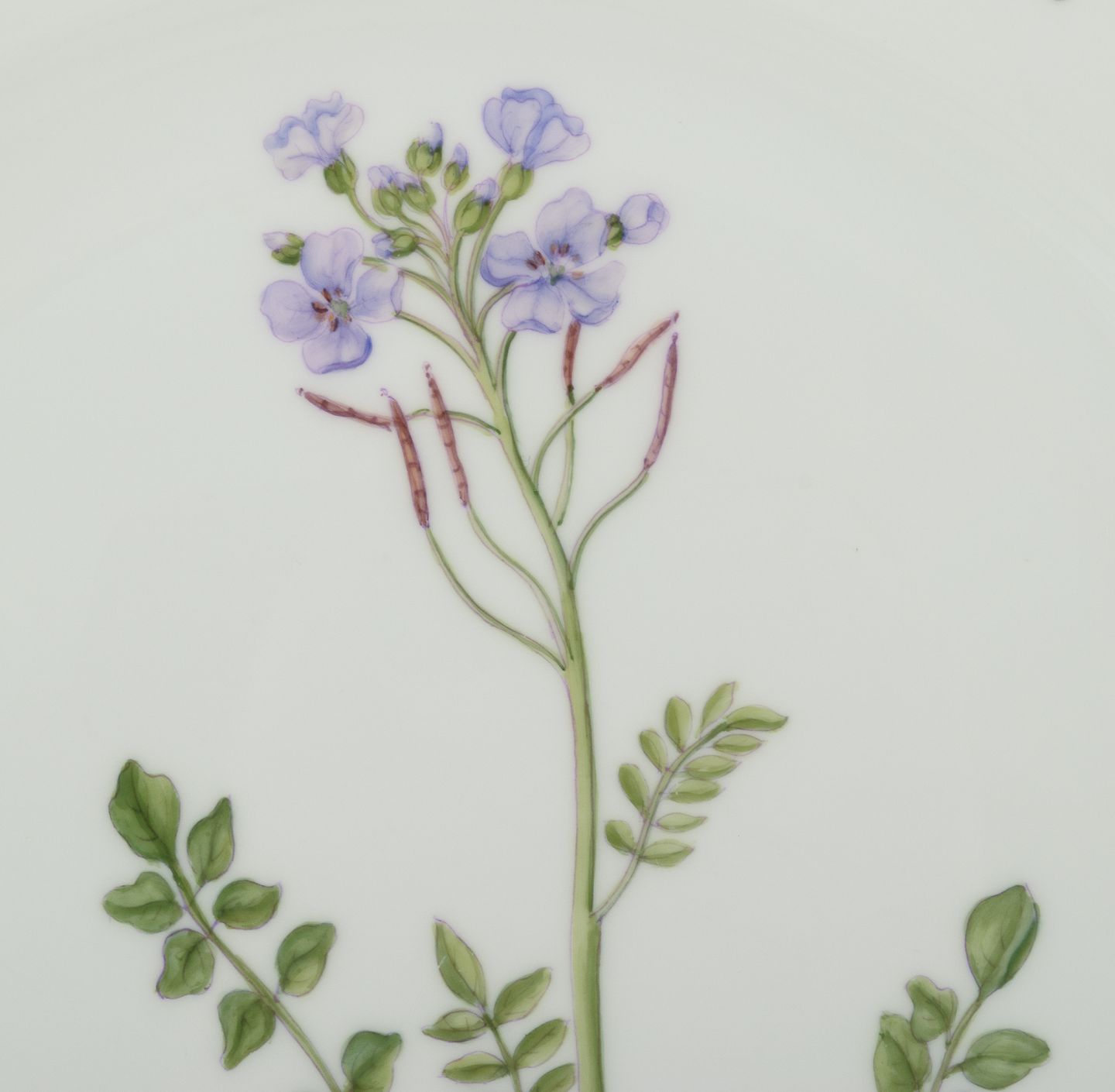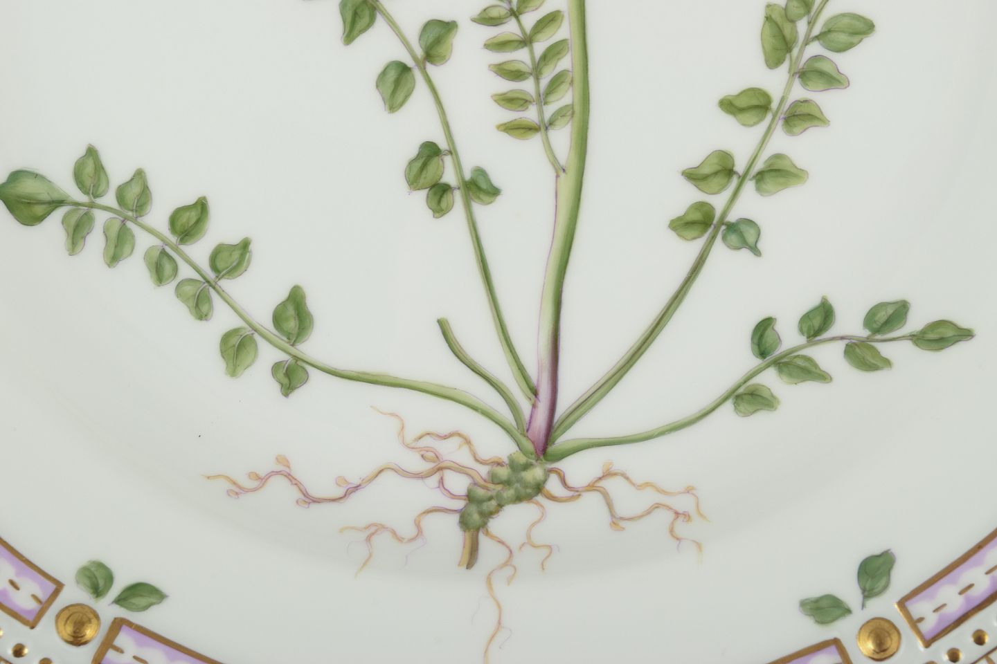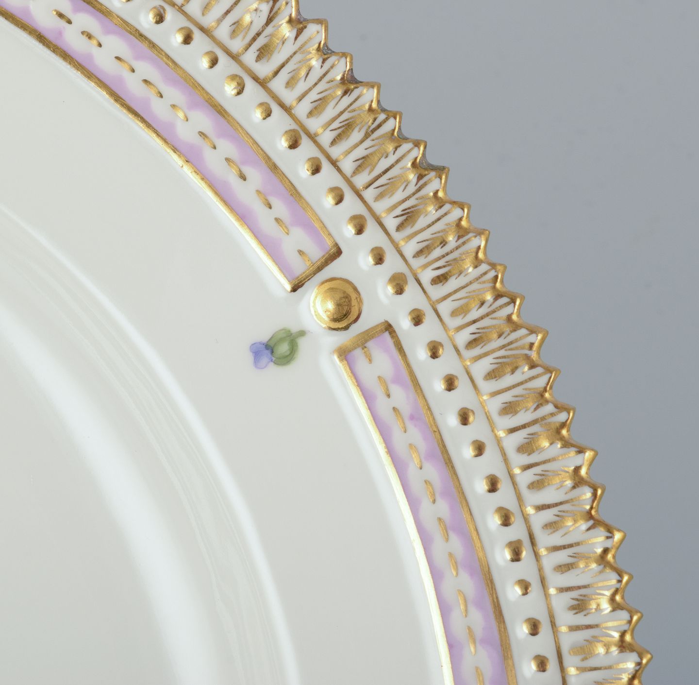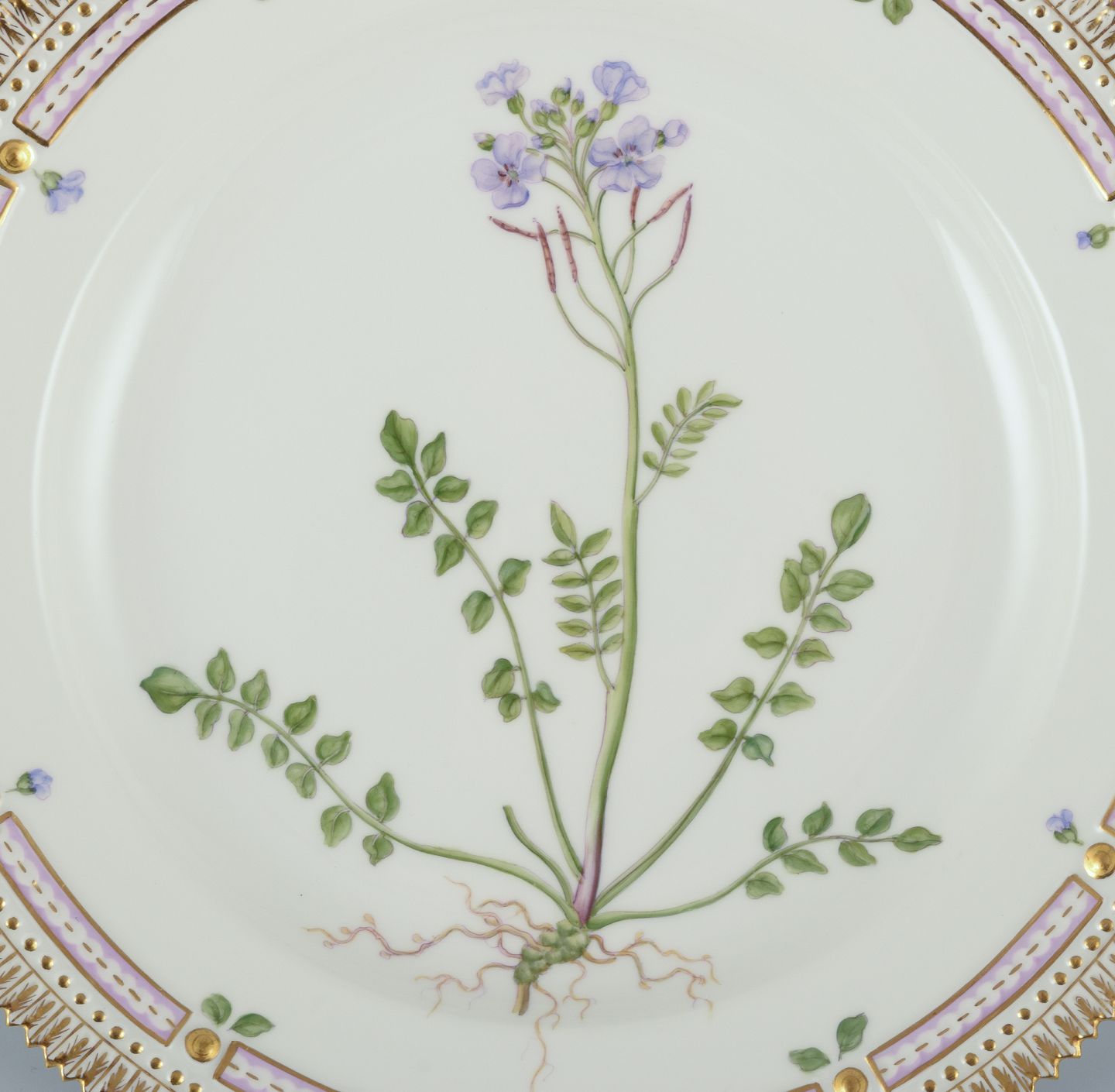 Royal Copenhagen Flora Danica middagstallerken i håndmalet porcelæn med blomster og gulddekoration.