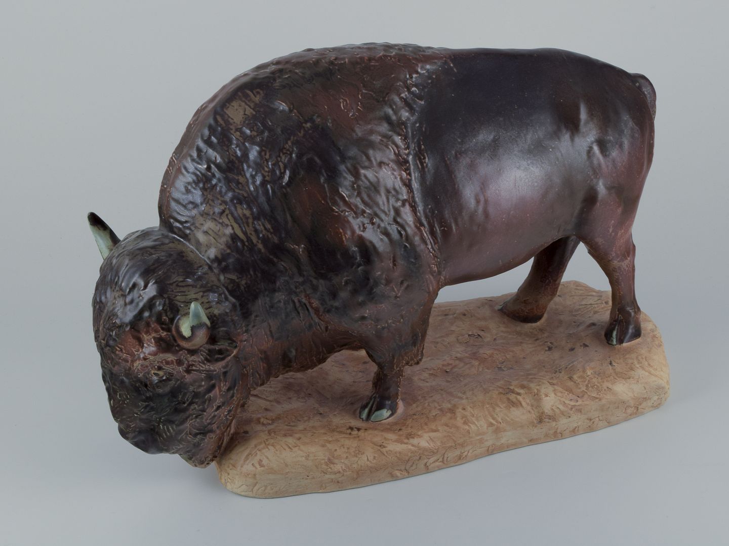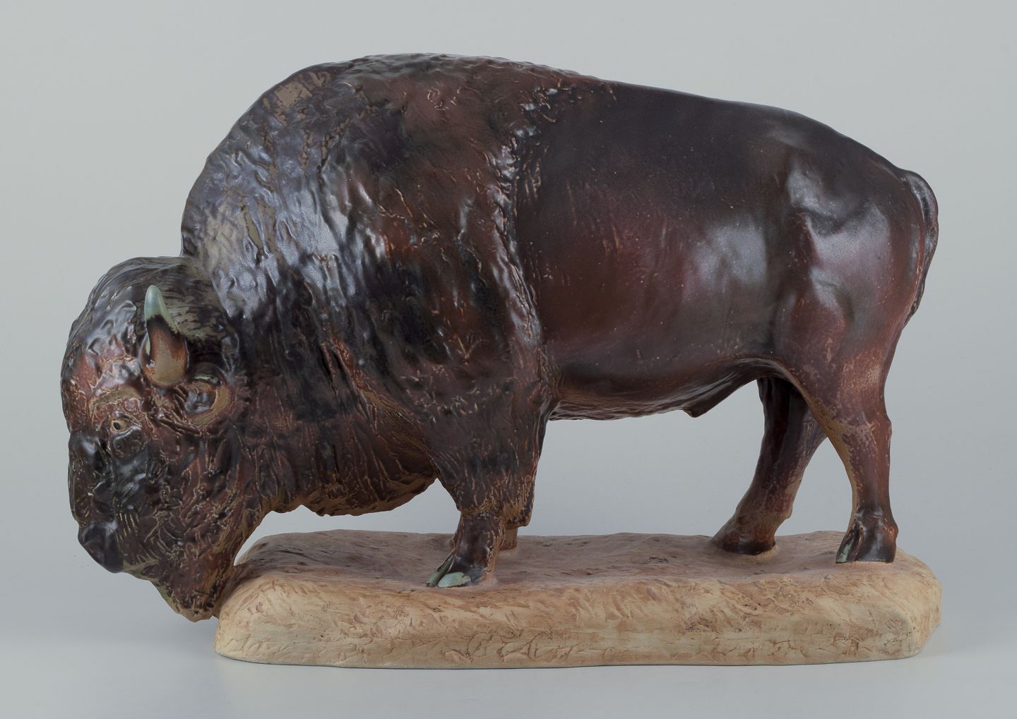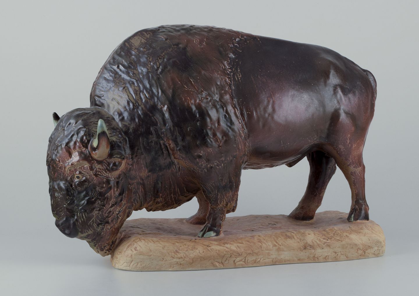 Kolossal og sjælden bisonokse i glaseret stentøj.