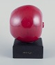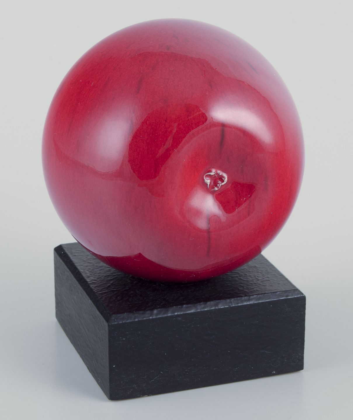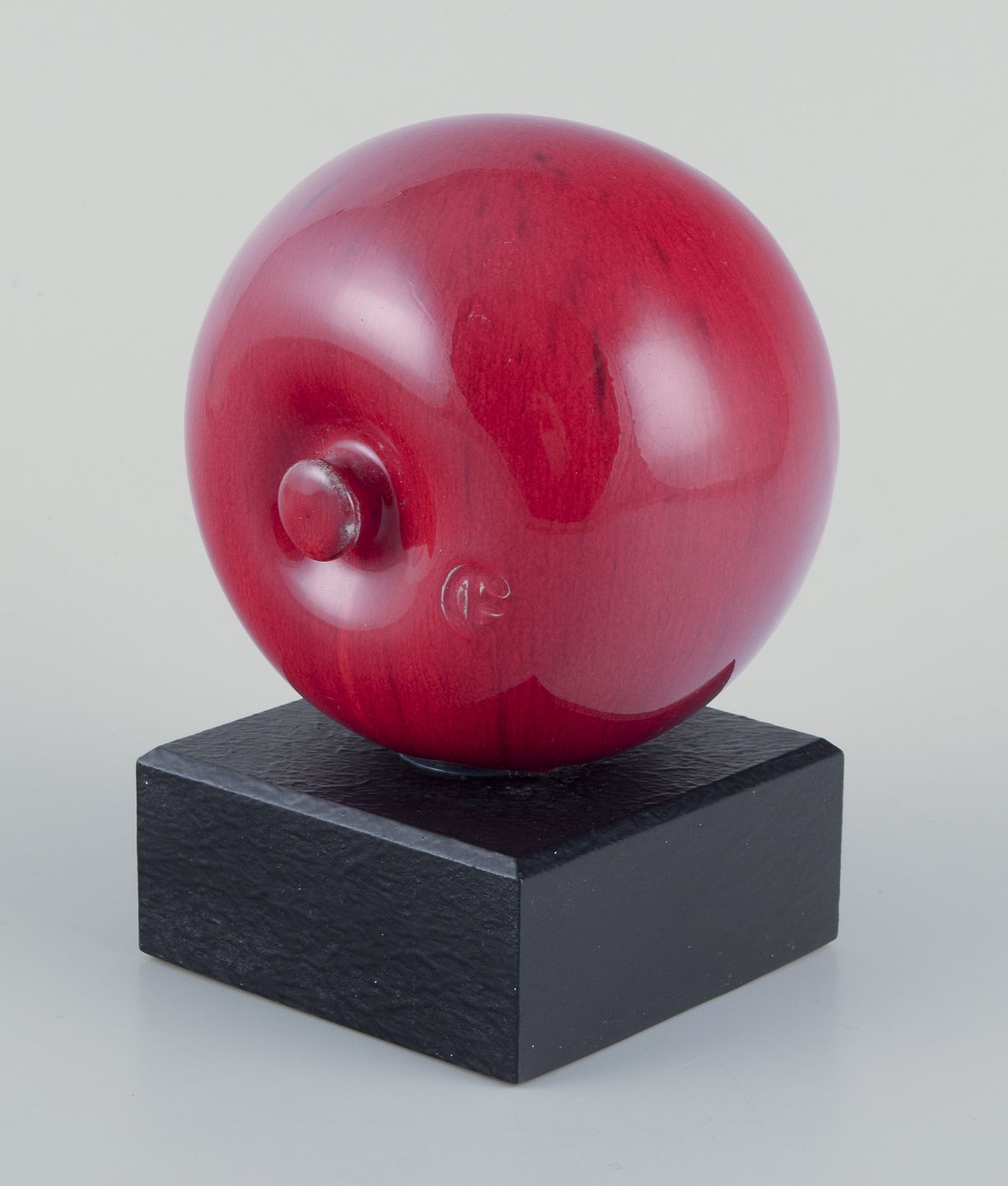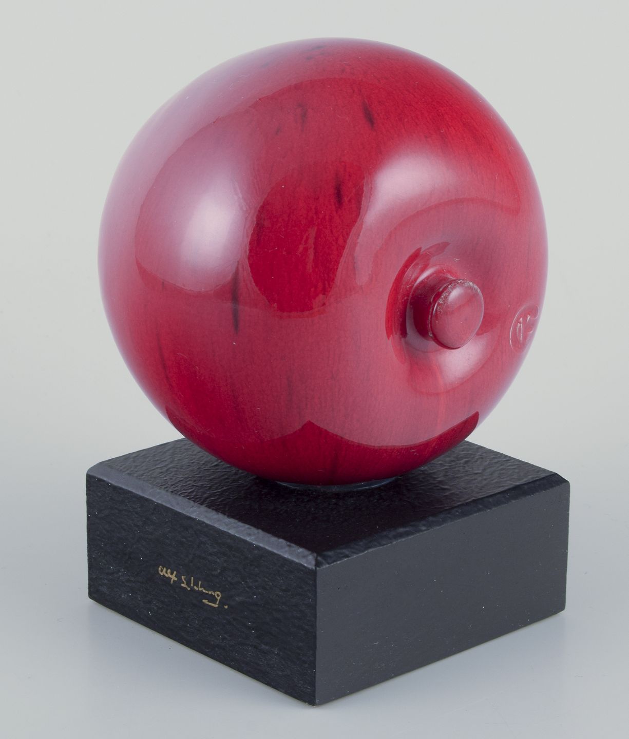 Alf Ekberg, svensk keramiker. Eget atelier. Keramik-æble på træsokkel. Unika Håndglaseret i mørkerød glasur. Datering: 1980/90’erne. Signeret samt mærkat. Perfekt stand. Mål: H 16,0 cm. x B 11,0 cm.