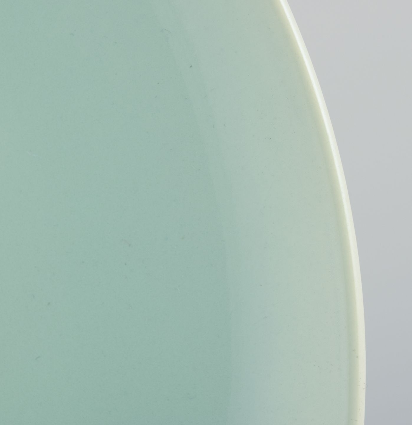 Seks Aluminia "Confetti" tallerkener i mintgrøn glaseret fajance. Midt 1900-tallet. I flot stand, med naturlige krakeleringer. Stemplet. Første sortering. Diameter: 19,8 cm.