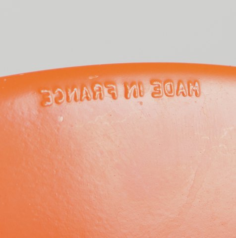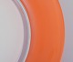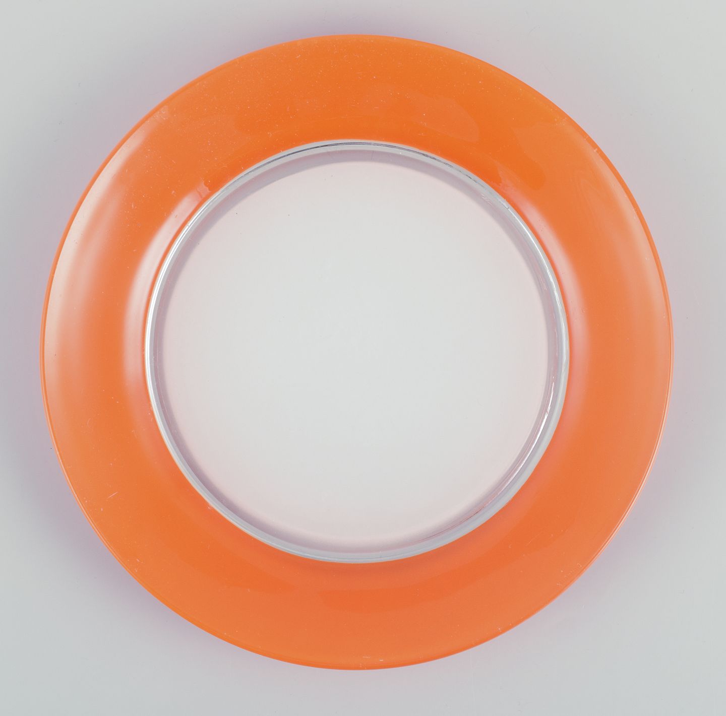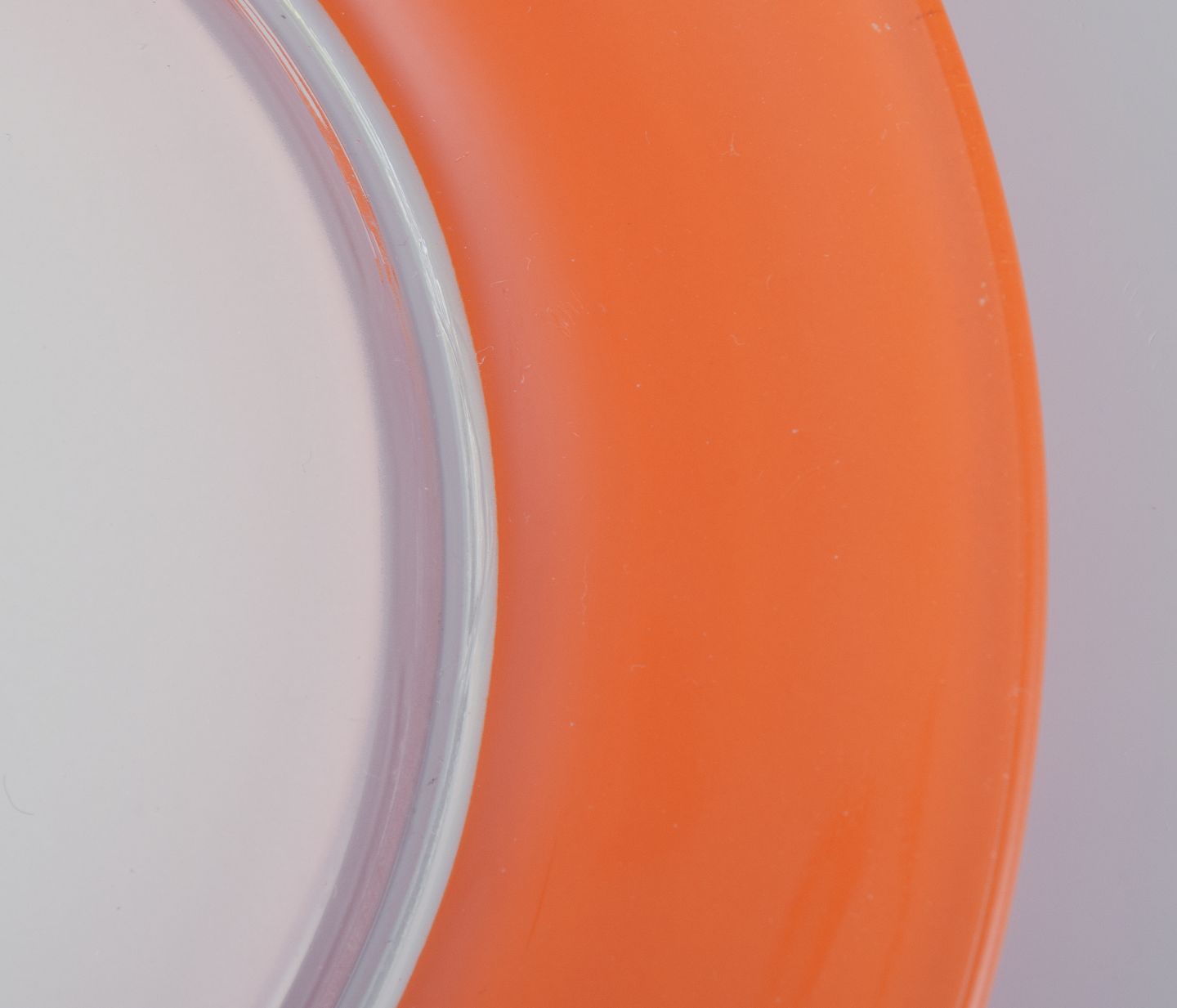 Duralex, Frankrig. Et sæt på fire kunstglastallerkner i orange og hvidt glas. 1970’erne. I flot stand med minimalt brugspræg. Stemplet: Duralex, Made in France. Mål: D 23,0 cm.