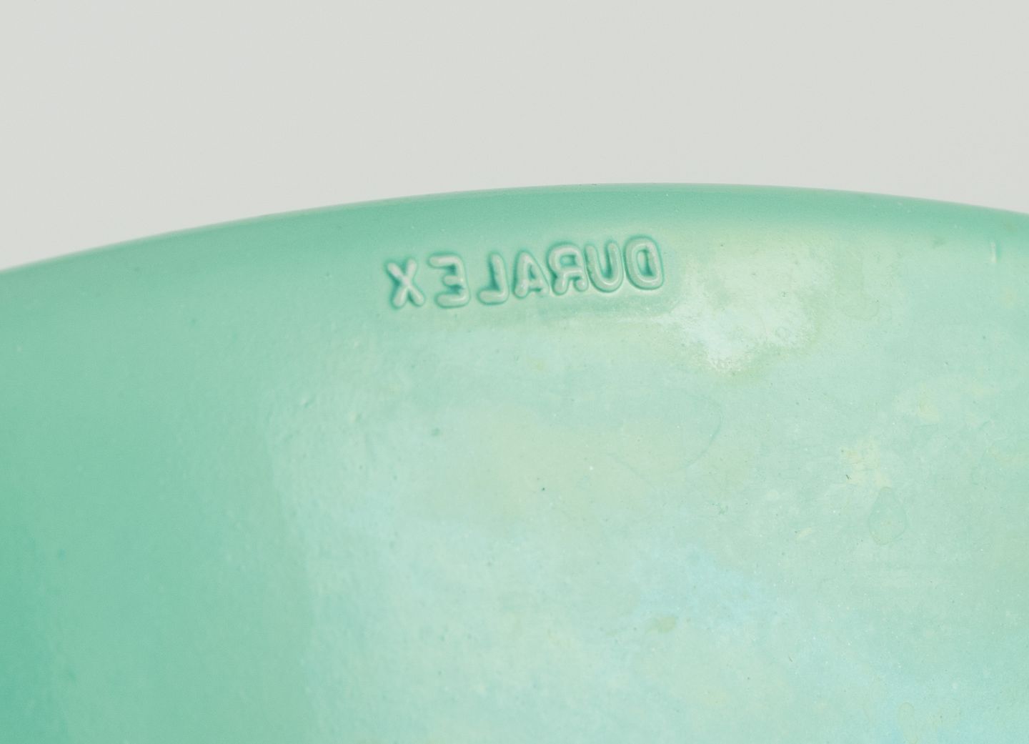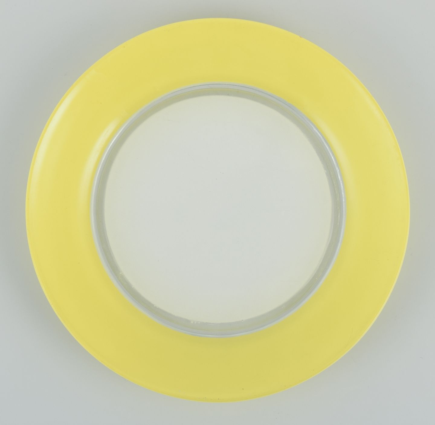 Et sæt på seks kunstglastallerkner i gult, grønt og hvidt glas.