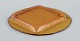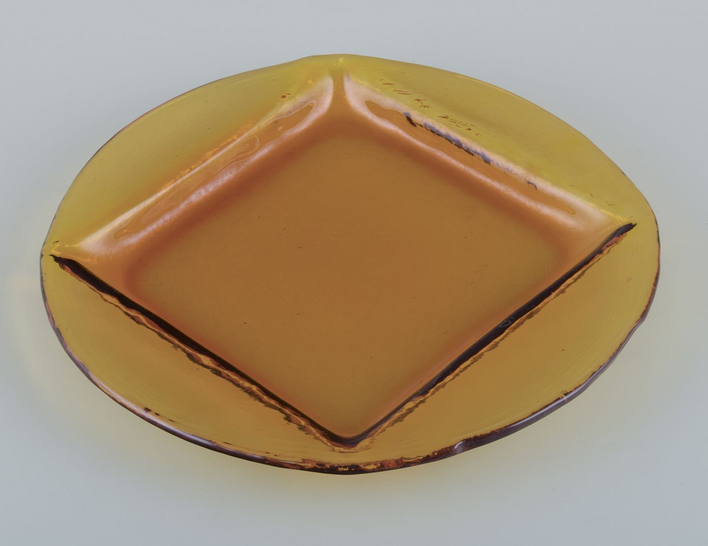 Skandinavisk glasdesigner. Et sæt på seks middagstallerkener i røgfarvet kunstglas. Kvadratisk fordybning i tallerkenen.