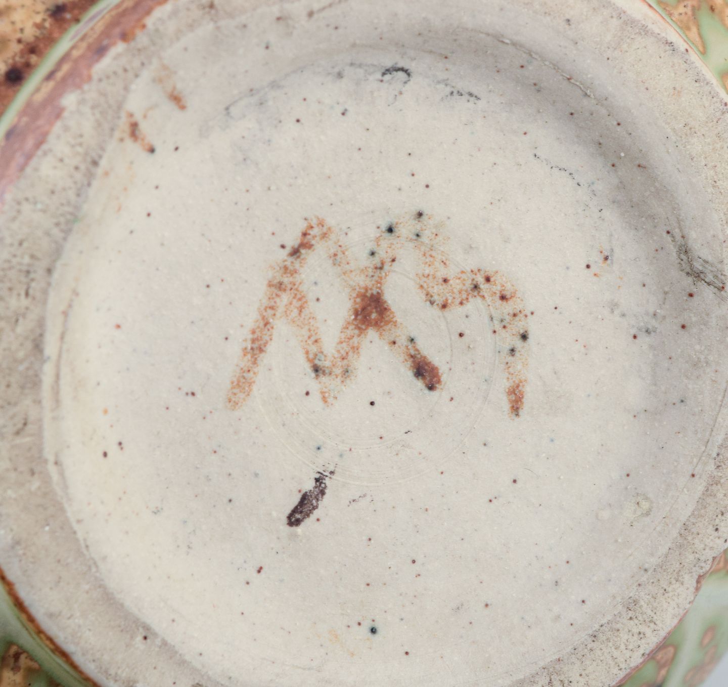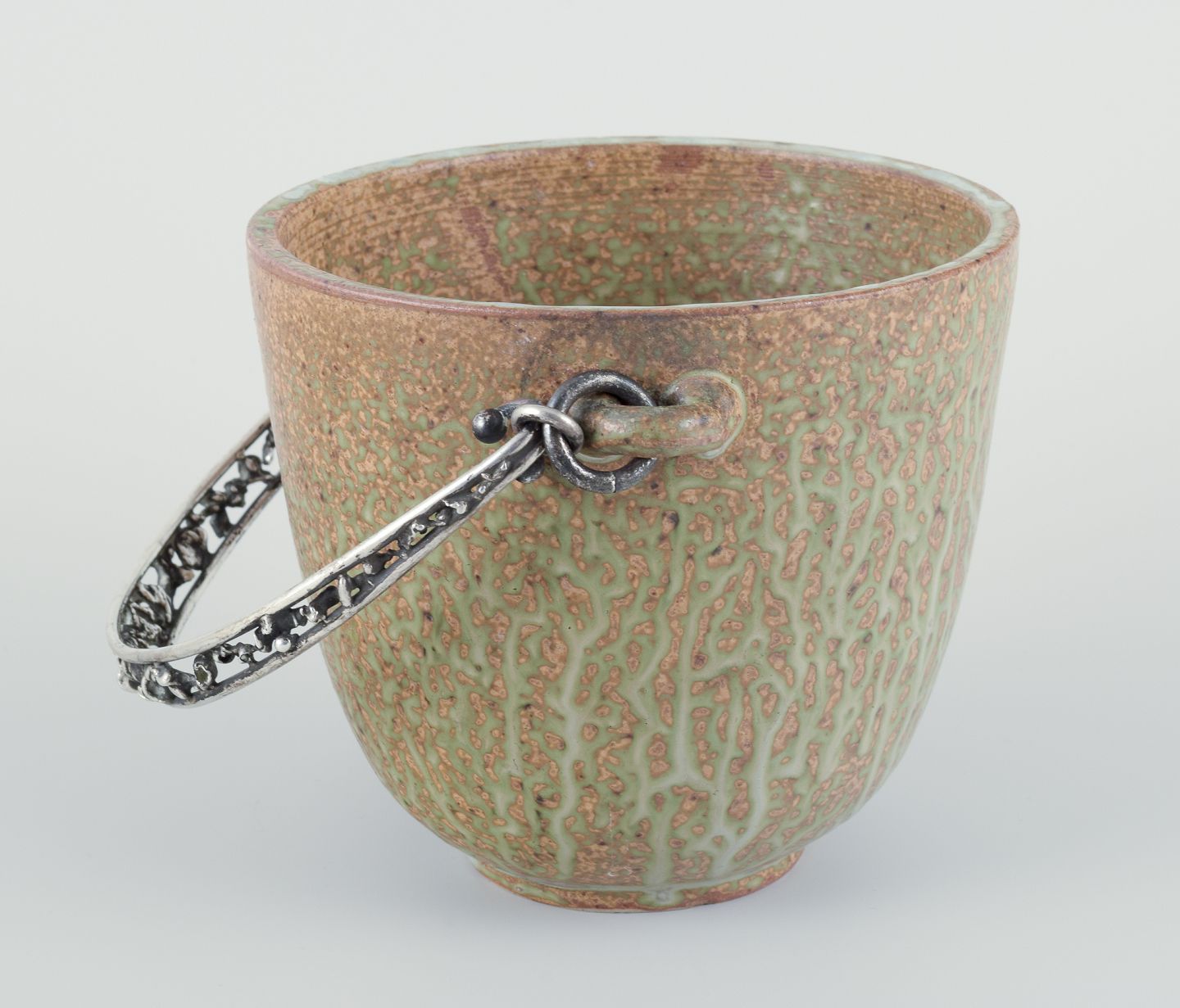 Arne Bang og Aage Weimar. Stor iskøler i keramik, hank i tretårnet sølv. Okkergul og grøn glasur. Datering: Midt 1900-tallet. Signeret. I flot stand. Mål: D 14,0 cm. x H 13,0 cm.